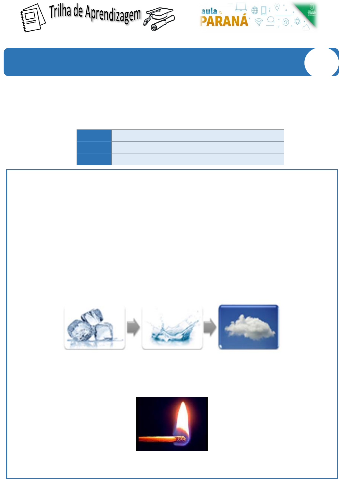 AULA 07 Retomada das aulas 1, 2 e 3 AULA 08 Retomada das aulas 4, 5 e 6 AULA 09 Substâncias e misturas CIÊNCIAS Semana 3 9º ano Prezados Estudantes, Esta semana tivemos a oportunidade de retomarmos na Aula Paraná de Ciências alguns conteúdos importantes e iniciarmos nossos estudos sobre substâncias e misturas. Para ajudá-los em seus estudos, você está recebendo o resumo dos conteúdos trabalhados durante essas aulas. Relembrando que tivemos 03 aulas de Ciências e aprendemos sobre: Resumo da Semana: Conteúdo – Aula 07 – Retomada das aulas 1, 2 e 3 Química e Física – Propriedades da matéria – Estados físicos da matéria Olá aluno(a) nesta aula vamos relembrar sobre a Química, a Física, as propriedades da matéria e dos estados físicos da matéria. Como já foi visto a Química investiga a estrutura, a composição, as propriedades e as transformações da matéria. Mas e o que é matéria? Matéria é tudo o que tem massa e ocupa lugar no espaço. Na Química trabalhamos também com as propriedades da matéria e como ela se interage com certos fenômenos, como a luz, o calor e a eletricidade. Dentro disso temos tipos de fenômenos, você lembra quais são? • Fenômeno físico é toda alteração na estrutura física da matéria, tais como forma, tamanho, aparência e estado físico, mas que não gere alteração em sua natureza, isto é, na sua composição. Mudanças de estado físico da água é um exemplo de fenômeno físico • Fenômeno químico ocorre quando há alteração da natureza da matéria, isto é, da sua composição. Combustão é um exemplo de fenômeno químico Existem também as propriedades gerais e específicas da matéria. • As propriedades gerais são as comuns a todo tipo de matéria, como por exemplo massa e o volume. A massa é a quantidade de matéria que um corpo possui e é medido em Kg. Já o volume é o espaço que ela ocupa e a unidade de medida é o m3. • As propriedades específicas são as que dependem do material de que é composto um corpo, como por exemplo cor e textura. Você já ouviu falar em densidade? A densidade é a razão entre a massa e o volume de um corpo, em determinadas condições de temperatura e pressão. Você sabia que existem 3 estados físicos? O sólido, o líquido e o gasoso. Pela figura acima podemos observar que o estado sólido tem forma fixa e volume fixo, no estado líquido as moléculas estão mais afastadas do que o estado sólido e no estado gasoso a movimentação é bem maior que no estado líquido e sólido. Vimos também as mudanças de estado fisco que vai depender da temperatura que ela é submetida. Observe a figura abaixo: A figura anterior nos mostra que quando a temperatura aumenta ocorrem 3 mudanças: fusão, vaporização e sublimação. E quando a temperatura diminui ocorrem outras 3: condensação, solidificação e sublimação. O que você entende por equilíbrio térmico? Se for decifrar as palavras, elas dizem “equilibrar a temperatura”, ou seja, quando fazemos dois corpos diferentes atingirem a mesma temperatura. Na imagem acima temos um recipiente com uma substância azul com temperatura de 21 °C. Nele colocamos uma substância lilás à temperatura de 29 °C. No terceiro recipiente verificamos que as duas temperaturas estão iguais, 23 °C. O que aconteceu? Ocorreu o equilíbrio térmico dessas substâncias, ou seja, os líquidos se misturaram e aos poucos uma parte da energia é liberada ao ambiente deixando a temperatura igual. Exercícios – Aula 07 – Retomada das aulas 1, 2 e 3 Química e Física – Propriedades da matéria – Estados físicos da matéria 1) Indique quais das descrições feitas abaixo são referentes a propriedades químicas: a) O ferro transforma-se em ferrugem na presença de ar e umidade. b) O ferro é cinza e sólido em temperatura ambiente. c) O papel produz cinzas ao pegar fogo. d) O alumínio apresenta densidade de 2,7 g/cm3. 2) (ENEM) O ciclo da água é fundamental para a preservação da vida no planeta. As condições climáticas da Terra permitem que a água sofra mudanças de fase, e a compreensão dessas transformações é fundamental para se entender o ciclo hidrológico. Numa dessas mudanças, a água ou a umidade da terra absorve o calor do sol e dos arredores. Quando já foi absorvido calor suficiente, algumas das moléculas do líquido podem ter energia necessária para começar a subir para a atmosfera. A transformação mencionada no texto é a: a) fusão. b) liquefação. c) evaporação. d) solidificação. e) condensação. 3) Preencha as lacunas: a) A gasolina, à temperatura ambiente, encontra-se no estado ________________. b) Ao colocarmos a roupa molhada no varal, a ação do Sol faz com que a água ___________ secando-a. c) Na soldagem de peças, em equipamentos eletrônicos, fazemos a fusão do estanho por meio do ferro de solda aquecido. Ao resfriar-se, o estanho ____________, fixando assim a peça desejada. d) O estado ___________ é caracterizado por apresentar forma variável e volume constante. Neste estado a superfície permanece na horizontal. e) O oxigênio, à temperatura ambiente, encontra-se no estado _____________. 4) Qual a diferença entre ebulição e evaporação? Cite uma situação em que a água evapora e outra em que ela sofre ebulição? _________________________________________________________________________ _________________________________________________________________________ 5) Um vidro contém 300 cm3 de mercúrio de densidade 13 g/cm3. A massa de mercúrio contido no vidro é: ____________________________________________________________________________________ Conteúdo – Aula 08 – Retomada das aulas 4, 5 e 6 Temperatura e calor, modelos atômicos e estrutura atômica Olá aluno(a) nesta aula vamos relembrar sobre temperatura e calor, os modelos atômicos e a estrutura atômica. Vamos relembrar um pouco sobre os estudos de John Dalton (1808)? Para Dalton toda a matéria 