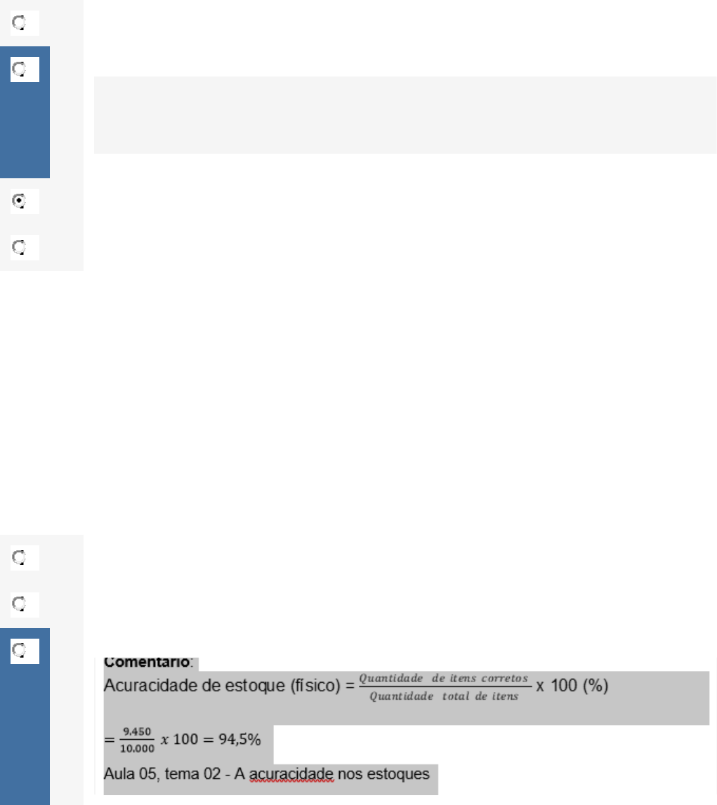 Questão 1/5 - Supply Chain Management Essentials Conforme Campos (2013, p. 122), a cadeia de suprimentos é formada por elementos que estão interligados pela movimentação dos produtos, com a característica significativa de começar e terminar com o consumidor. A partir do texto acima e dos materiais disponibilizados para estudo, analise as alternativas abaixo e em seguida assinale a que apresenta os seis elementos (atores organizacionais) que têm participação direta na cadeia de suprimentos. Nota: 0.0 A O cliente, o fornecedor, as vendas, as finanças e o transporte. B O cliente, o planejamento, as compras, a produção e o transporte. Comentário: Conforme o autor, o cliente, o planejamento, as compras, a produção e o transporte são os elementos que têm participação direta na cadeia de suprimentos. As demais alternativas apresentam elementos que não possuem participação direta na cadeia de suprimentos, tais quais: vendas, finanças e engenharia. Aula: 1, Tema 02 - Os atores organizacionais C O cliente, o planejamento, as vendas, a produção e o transporte D O cliente, o planejamento, as compras, a produção e a engenharia. Questão 2/5 - Supply Chain Management Essentials Os estoques representam parcela importante dos ativos da empresa, portanto pode ser considerado um fator potencial de geração de lucros. Para se ter um controle eficaz sobre os estoques, é necessário ter acurácia no sistema que pode ser confirmado através de inventários. Numa determinada empresa, após o inventário, chegou-se a quantidade de 9.450 itens contados, porém a informação total registrada no sistema era de 10.000 peças, ou seja, 550 itens divergentes. A partir do texto acima e dos materiais disponibilizados para estudo, assinale a alternativa correta que mostra o nível de acuracidade para esse inventário. Nota: 0.0 A 5,5%. B 105,8% C 94,5% D 92,5% Questão 3/5 - Supply Chain Management Essentials Decidir sobre a estratégia de se adquirir material nacional ou importado é uma das atividades na gestão da cadeia de suprimentos. Quando se aborda o tema matérias do ponto de vista da cadeia de suprimentos, nacional ou importado, há uma abrangência ampla que necessita de uma classificação. Nesse sentido, os materiais devem ser classificados. A partir do texto acima e dos materiais disponibilizados para estudo, analise as afirmativas abaixo e em seguida assinale a alternativa correta que descreve a classificação de matérias. I. Tipo de demanda, materiais críticos, perecibilidade. II. Periculosidade, possibilidade de fazer ou comprar (make or buy). III. Nacional, internacional, estatal. IV. Tipos de estocagem, dificuldade de aquisição, mercado fornecedor. Nota: 0.0 A Apenas a afirmativa I está correta B Apenas as afirmativas I e II estão corretas C Apenas as afirmativas I, II e III estão corretas D Apenas as afirmativas I, II e IV estão corretas Comentário: Independente da procedência do material, seja nacional ou importada, há a necessidade de se fazer uma classificação, conforme dados das afirmativas I, II e IV. A alternativa III não atende os itens de classificação de materiais. Aula 6, Tema 01 – Material nacional x importado Questão 4/5 - Supply Chain Management Essentials Os Prestadores de Serviço Logístico (PSL), são também conhecidos como Third Party Logistics (3PL). Conforme Africk e Calkins (1994), citados em Novaes (2004, p. 331), existem dois grupos básicos de prestadores de serviços: PSLs baseados em ativos e PSLs baseados em administração e no tratamento de informações. A partir do texto acima e dos materiais disponibilizados para estudo, analise as afirmativas abaixo e em seguida assinale a alternativa correta que descreve características dos Prestadores de Serviço Logístico (PSLs). I. PSLs baseados em ativos, que possuem ativos que são disponibilizados aos clientes para ampliação de suas atividades logísticas. II. PSLs baseados em ativos, além da própria armazenagem temporária de produtos, podem ofertar serviços de embalagem etiquetagem, montagem de kits, etc. III. PSLs baseados em administração e no tratamento de informações fornecem recursos humanos e sistemas para administração total ou parcial das funções logísticas dos clientes. IV. PSLs baseados em administração e no tratamento de informações possuem armazéns exclusivos para locação logística aos clientes. Nota: 20.0 A Apenas as afirmativas I e IV estão corretas B Apenas as afirmativas I e III estão corretas C Apenas as afirmativas I, II e III estão corretas Você acertou! Comentário: A diferença básica entre os dois grupos de PSL refere-se principalmente na posse de ativos, descritos corretamente nas alternativas I, II e III. A alternativa IV contradiz a condição dos PSLs baseados em administração e no tratamento de informações. Aula 6, Tema 03 – Armazém próprio x terceiro D Apenas as afirmativas I, II e IV estão corretas Questão 5/5 - Supply Chain Management Essentials O item transporte é o que tem a maior participação nos custos logísticos. Para que tenhamos a distribuição de um determinado produto de forma eficaz, faz-se necessário ter um bom projeto de roteirização de veículos e para isso devemos estar atentos a algumas restrições impostas pelo próprio sistema. A partir dos materiais disponibilizados para estudo, sobre as restrições impostas pelo próprio sistema, analise as afirmativas a seguir e defina (V) para as verdadeiras ou (F) para as falsas. Depois, assinale a alternativa que apresenta a sequência correta. ( ) Horário estabelecidos para carga e descarga; ( ) Ano de fabricação dos veículos; ( ) Rodízio de veículos em função da numeração das placas; ( ) Limitação de carga dos veículos. Assinale a alternativa correta: Nota: 20.0 A V - V - F - V B V - V - F - V C V - F - V - V Você acertou! Comentário: A roteirização, por mais simples que seja, sempre estará sujeita a empecilhos relativos 