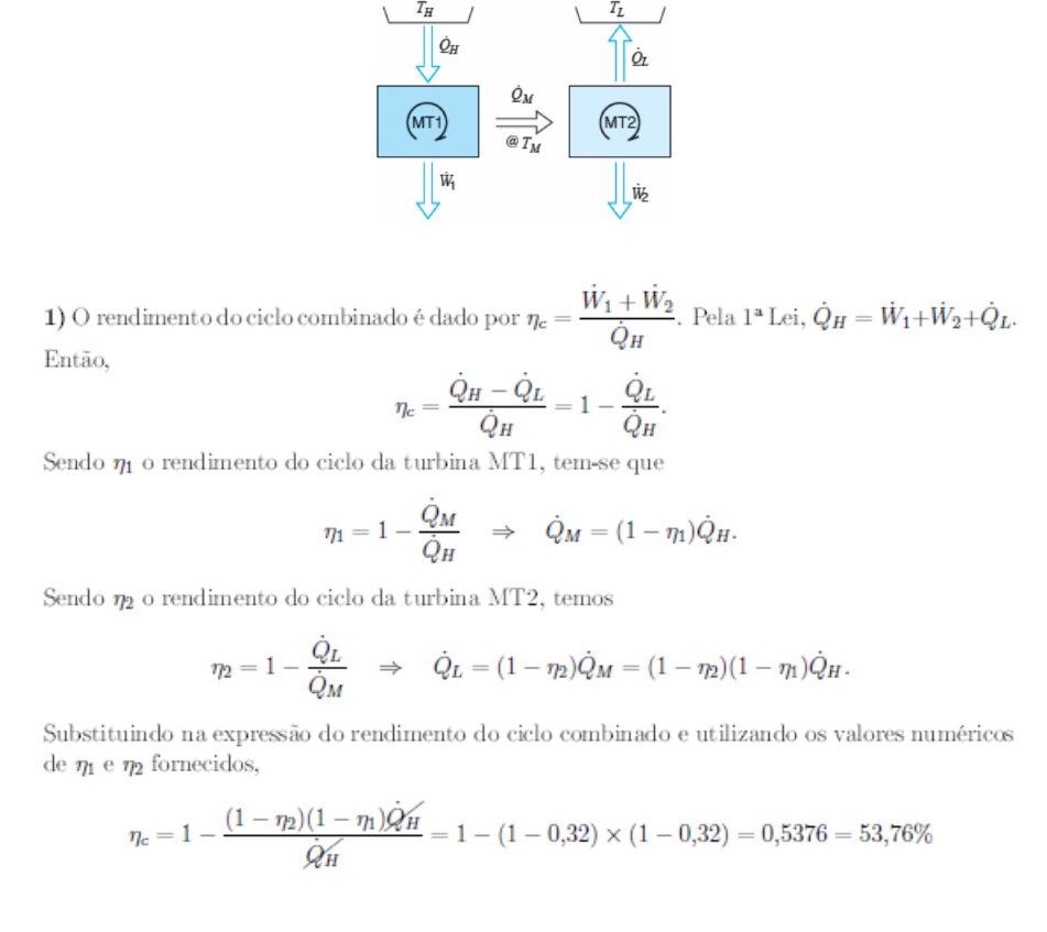 BCJ0205–Fenômenos Térmicos Primeiro quadrimestre de 2020 Gabarito do Teste – Questão 4 Questão 4-1 Considere a combinação de duas centrais de potência, como mostrado na figura. A turbina MT1 opera no ńıvel mais alto de temperatura e a turbina MT2 no ńıvel mais baixo de temperatura. Admita que ambos os ciclos tenham eficiência térmica de 32%. Admitindo que QL do ciclo da turbina MT1 seja igual ao QH do ciclo da turbina MT2, qual é e eficiência térmica global do ciclo combinado? 1 Questão 4-2 A fim de aproveitar energia que é atualmente desperdiçada numa planta industrial, propõe-se a instalação de uma combinação de motor térmico acionando uma bomba de calor, conforme esquematizado na figura. O motor térmico absorveria o calor de um reservatório térmico a 50◦C e rejeitaria calor em um reservatório que apresenta temperatura igual a 30◦C. Já a bomba de calor absorveria calor do mesmo reservatório térmico a 50◦C e forneceria calor a um processo que apresenta tempe- ratura igual a 150◦C. Sabendo que potência dispońıvel, atualmente des- perdiçada no reservatório a 50◦C, é 5 MW, determine qual é o máximo valor posśıvel para a taxa de transferência de calor para o processo que está a 150◦C. 2 Questão 4-3 Tendo em vista a atual preocupação com a questão ambiental, um industrial resolveu aumentar a eficiência energética de sua indústria. Ele precisa resfriar água de 30◦C a 5◦C, retirando dela uma taxa de calor,|Q̇F | [O ponto em cima de uma variável representa a derivada temporal dessa variável: no caso, Q̇ ≡ dQ/dt]. Para isso instalou uma máquina térmica que aproveita calor de água geotérmica e de um lago aquecido. O resto da energia necessária é obtido retirando calor de gases quentes a 800◦C. A máquina tem que rejeitar uma taxa de calor |Q̇0| para o ambiente. Considerando operação em regime permanente, pede-se: (a) O máximo valor de |Q̇F | produzido e também o valor de |Q̇0|, ambos em kW; (b) Utilizando o volume de controle apresentado no destaque, determine a máxima vazão de água fria produzida. 3 4 Questão 4-4 Considere um motor térmico de Carnot que opera no espaço. A única maneira desse motor rejeitar calor é por radiação térmica. Assim, a taxa de transferência de calor no radiador desse motor é proporcional à quarta potência da temperatura absoluta do radiador e à área da superf́ıcie de radiação do dispositivo, ou seja, Qrad = kAT 4, onde k é uma constante. Encontre a razão entre temperaturas TL/TH que minimiza a área do radiador para uma dada potência do motor e valor de TH . 5 Questão 4-5 Numa máquina térmica, n mols de um gás ideal de coeficiente adiabático γ executa o ciclo da figura abaixo, onde BC é uma adiabática e CA uma isoterma de temperatura T0. (a) Identifique os processos no ciclo onde há admissão e rejeição do calor. A seguir, obtenha as expressões para o calor admitido e rejeitado em função de r = PA/PC , n, γ, T0 e da constante universal dos gases. (b) Obtenha o rendimento do ciclo apenas em função de r e γ. A C B rP0 P0 6 7 Questão 4-6 Uma máquina térmica realiza trabalho através de um ciclo reverśıvel. A substância de trabalho dessa máquina consiste de um gás monoatômico inicialmente a uma pressão de 1 atm, à temperatura de 20◦C e ocupando um volume de 100 mL. Considere este estado o ponto A no diagrama PV . No primeiro processo do ciclo, o gás aquece mantendo o volume constante até atingir o ponto B, onde a pressão é o dobro em relação à do ponto A. Do ponto B, o gás realiza uma expansão adiabática até o ponto C, voltando a ter a pressão inicial. O processo que fecha o ciclo consiste de uma compressão isobárica. (a) Obtenha o número de mols da amostra; (b) Esboce o ciclo no diagrama PV , indicando em quais etapas o calor é admitido e descartado da máquina. A seguir, calcule o calor admitido e o descartado. (c) Qual a eficiência dessa máquina térmica? Se a lei de Kelvin-Planck fosse violada, qual deveria ser o trabalho realizado pela máquina, por ciclo? 8 9 Questão 4-7 Considere uma máquina térmica operando com 1 × 10−2 mols de um gás ideal monoatômico. Inici- almente, o gás ocupa um volume V0, a uma pressão de 1 atm e temperatura de 30 ◦C. Considere este estado o ponto A no diagrama PV . O gás sofre um processo ćıclico reverśıvel, onde na primeira etapa atinge o ponto B com o triplo da pressão do ponto A, através de um processo isocórico. Do ponto B, o gás realiza uma expansão adiabática até o ponto C, voltando a ter a pressão inicial. Finalmente, na última etapa o gás sofre uma compressão isobárica, fechando o ciclo. (a) Obtenha o volume V0. (b) Esboce o ciclo no diagrama PV , indicando em quais etapas o calor é admitido e descartado da máquina. A seguir, calcule o calor admitido e o descartado. (c) Qual a eficiência dessa máquina térmica? Se a lei de Kelvin-Planck fosse violada, qual deveria ser o trabalho realizado pela máquina, por ciclo? 10 11 Questão 4-8 Uma usina termoelétrica, tendo 60% do rendimento de uma máquina de Carnot, produz uma potência mecânica igual a 330 MW a partir de turbinas que recebem calor do vapor a uma temperatura de 550◦C e rejeitam calor a uma temperatura de 150◦, por meio de um exaustor, em um rio. (a) Se a usina tivesse o rendimento de uma máquina de Carnot, qual seria a energia produzida por ela em uma hora? (b) Sabendo-se que a vazão do rio é de 7500 L/s, qual o aumento na temperatura da água rio abaixo por causa do calor rejeitado pela usina? 12 13 Questão 4-9 A figura abaixo representa o ciclo de uma máquina térmica, cuja substância de trabalho é 0,5 mols de um gás ideal diatômico de coeficiente adiabático γ = 7/5. Este ciclo consiste de três processos: AB representa uma com- pressão isobárica , BC representa um aquecimento isocórico e CA repre- senta uma expansão isotérmica. Considere α = 8, P0 = 1 atm 