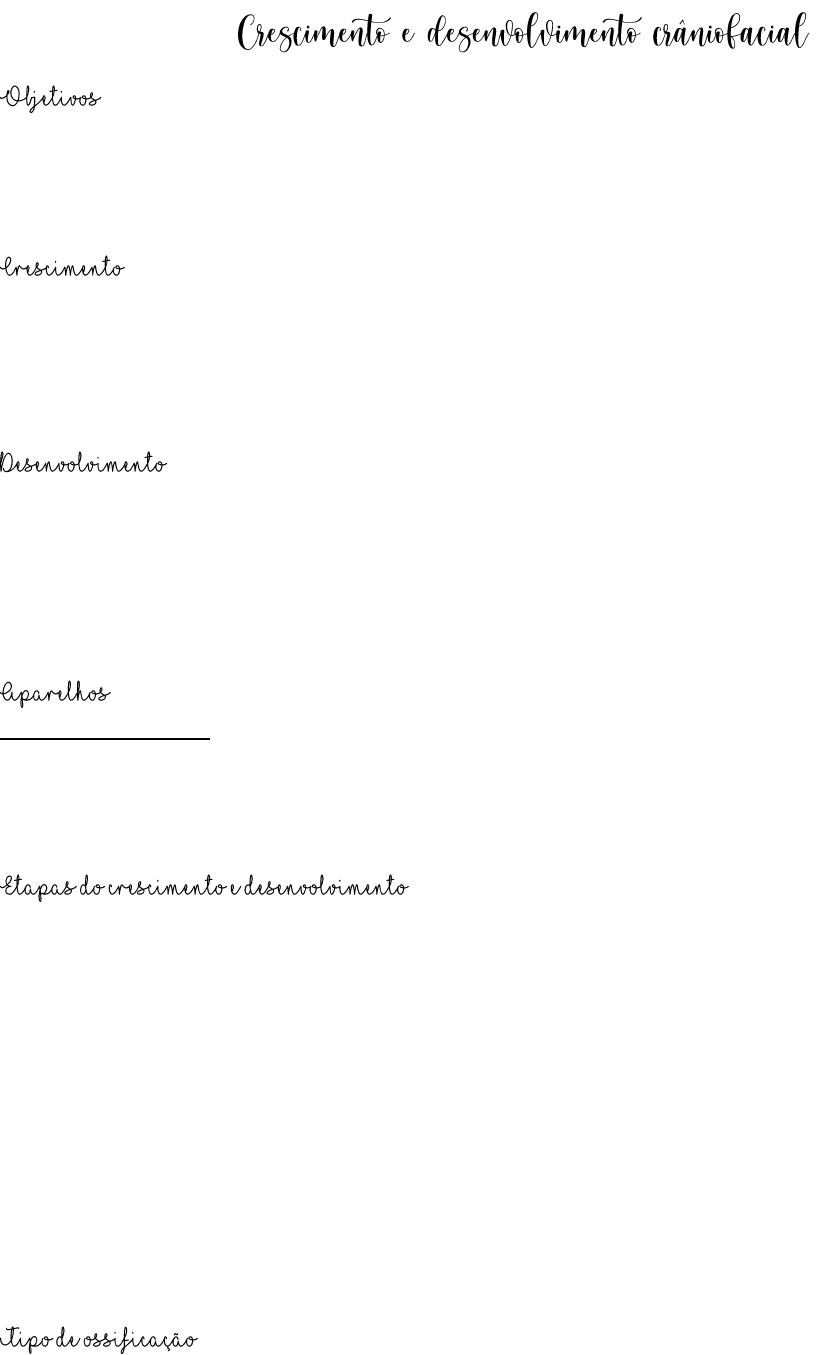 @ondadesorrir Conhecimento do crescimento normal; Conhecimento dos desvios do crescimento normal e como corrigir; Saber realizar o diagnóstico correto e indicar o tratamento correto. Aumento de massa = aumento do número de células – hiperplasia; Aumento do volume = aumento do tamanho celular – hipertrofia; Mudança quantitativa; Aumento de massa e volume. Maturação das funções dos órgãos; Aumento de nível em organização ou em complexidade; Especialidade/Evolução do órgão; Mudança qualitativa; Aumento da complexidade. APARELHO EXTRABUCAL - AEB Restringe o crescimento da Maxila que está protuída. APARELHO PROPULSOR DE MANDÍBULA (Ativador) Estimula o crescimento da Mandíbula que está retruida. Fecundação: início do crescimento e desenvolvimento, quando o óvulo é fertilizado por um espermatozoide; - Zigoto: célula com metade do material genético da mãe e metade do pai - definem-se todas as características; Embrião: crescimento pré-natal; - Anomalias craniofaciais: - Fissuras labiopalatinas, - Síndrome de Riquieri Costa-Pereira: deficiência da mandíbula (Classe II); - Síndrome de Apert: deficiência da maxila (Classe III); - Disostose Cleidocraniana: retrusão maxilar e protusão mandibular Recém-nascido; Criança; Adulto. Maneira que o osso se forma; Intramembranosa: tecido conjuntivo transforma-se em tecido ósseo; Endocondral: a cartilagem é substituída por tecido ósseo. @ondadesorrir Intramembranosa :Células mesenquimais indiferenciadas g Osteoblastos g Matriz osteóide g Osso Endocondral:Células mesenquimais indiferenciadas g Condroblastos g Cartilagem g Tecido ósseo Hunter: aposição e reabsorção - O osso sofre um processo de reabsorção e aposição, denominado remodelação óssea; - Não necessariamente em iguais quantidades; - Reabsorção: osteoclastos (parede posterior interna do seio maxilar); - Aposição: osteoblastos (túber da maxila, processo alveolar, espinha nasal anterior); - O osso cresce e os dentes movimento devido essa teoria; Sicher: crescimento sutural - As suturas ósseas são responsáveis pelo crescimento facial (também); - Na região sutural também há crescimento craniofacial; - Craniossinostose Sindrômica: sutura fecha precocemente Scott: crescimento das cartilagens - Preconiza que o crescimento dos osso ocorre no crescimento das cartilagens; Moss: teoria da matriz funcional - O crescimento craniofacial depende inteiramente do crescimento dos tecidos moles e função; - O ar, os dentes, o cérebro e a língua são matrizes funcionais. Deslizamento: - Crescimento do osso produzido pela remodelação óssea; - Ocorre em direção a superfície de aposição; Deslocamento - Movimento real do osso. Origem Intramembranosa; Cresce em todas as direções; Deslizamento para cima e para trás; Deslocamento para frente e para baixo; Teorias de Hunter, Sicher e Moss; Aparelho Extra Bucal – segura o crescimento da maxila, no sentido contrário do crescimento; Máscara facial – estimula a maxila, no sentido do crescimento. Origem Intramembranosa e endocondral; Endocondral: na região do côndilo; Intramembranosa: corpo, ramo e sínfese; Teorias de Hunter e Moss; Deslizamento: póstero-superior; Deslocamento: ântero-inferior; Mentonera: literatura vesta e extremamente variada, nenhuma conclusão estabelecida.