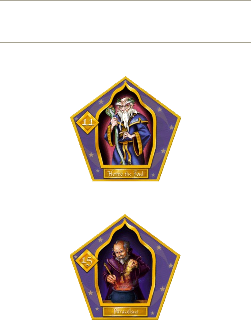 Folio Mágico Índice Série Ouro ..:: Série Ouro ::.. Herpo, o Sujo. Grécia Antiga. primeiro criador conhecido do Basilisco. Paracelsus (1493-1541). Contemporâneo de Copérnico e Leonardo Da Vinci, um gênio da medicina cujas fortes teorias desafiaram o pensamento medieval. É creditado pela descoberta da Língua das Cobras. Carlotta Pinkstone (1922-presente). Famosa por defender a dissolução do Estatuto de Sigilo de Confederação Internacional dos Bruxos e a revelação ao povo não-mágico que os bruxos ainda existem. A Sra.Pinkstone foi presa várias vezes pelo uso flagrante de magia em locais públicos. Godric Gryffindor. Medieval, datas desconhecidas. Co-fundador de Hogwarts. Deu seu nome a uma das quatro casas da escola - Grifinória. Salazar Slytherin. Medieval, datas desconhecidas. Co-fundador de Hogwarts. Deu seu nome a uma das quatro casas de Hogwarts - Sonserina. Bertie Bott (1935-presente). Inventor dos Feijõezinhos de todos os sabores. Helga Hufflepuff. Medieval, datas desconhecidas. Co- fundadora de Hogwarts. Deu seu nome a uma das quatro casas de Hogwarts - Lufa- Lufa. Montague Hnightley (1506-1588). Campeão de xadrez de Bruxos. Rowena Ravenclaw. Medieval, datas desconhecidas. Co-fundadora de Hogwarts. Deu seu nome a uma das quatro casas de Hogwarts - Corvinal. Harry Potter. O menino que sobreviveu ao ataque do maior bruxo das trevas do século XX. Alvo Dumbledore: Considerado por muitos o maior bruxo dos tempos modernos. Dumbledore é particularmente famoso por ter derrotado Grindelwald, o bruxo das Trevas, em 1945, por ter descoberto os doze usos do sangue de dragão e por desenvolver um trabalho em alquimia em parceria com Nicolau Flamel. O professor Dumbledore gosta de música de câmara e boliche. Índice Série Prata ..:: Série Prata ::.. Elfrida Clagg (1612-1687) Chefe do Conselho de Warlock. Derwent Shimpling (1912-presente). Numa aposta, comeu um Tentáculo Venenoso inteiro e sobreviveu, embora ainda esteja roxo. Andros, o Invencível. Grecia antiga. Diz-se que é o único mago conhecido a produzir um Patrono do tamanho e um gigante. Fulbert, o Medroso (1014-1097). Famoso por sertão medroso que nunca saia de casa. Morreu quando um Feitiço Defensivo falhou e o teto caiu sobre ele. Cliodne. Medieval, datas desconhecidas. Druida irlandesa que descobriu as propriedades do orvalho da lua. Morgana Le Fay. Datas desconhecidas. Meia irmã do Rei Arthur. Feiticeira das Trevas. Inimiga de Merlin. Wendelin, a Esquisita. Medieval, datas desconhecidas. Diz-se que gostava tanto de ser queimada na fogueira como bruxa que se permitiu ser capturada nada menos que 47 vezes, sob vários disfarces. Circe. Grécia Antiga. Viveu na Ilha de Aeaea. Especialista em transformar marinheiros perdidos em porcos. Glenda Chittock (1964-presente). Popular apresentadora do programa Hora de Encantamentos da R.R.B (Rede Radiofônica dos Bruxos) Mirabella Plunkett (1939-desconhecido). Famosa por se apaixonar por um trintão em Loch Lomond nas férias. Quando seus pais a proibiram de se casar com ele, ela se transfigurou num hadoque e nunca mais foi vista. Artemisia Lufkin (1754-1825). Primeira bruxa a se tornar Ministra da Magia. Donaghan Tremlett (1972- presente). Baixista da popular banda bruxa As Esquisitonas. Bawman Wright (1492-1560). Famoso por desenvolver o Pomo de Ouro. Joscelina Wadcock (1911-presente). Artilheira do time de Quabribol Puddlemere United. Recordista do maior número de gols marcados durante a temporada no século XX (contra os Ballycastle Bats, em 1931). Chauncey Oldridge (1342-1379). Primeira vitima conhecida da Varíola de Dragão. Gwenog Jones (1968-presente). Capitã e batedora do único time de quadribol totalmente feminino, o Holyhead Harpies. Crispin Cronk (1795-1872). Mandado para Azkaban por insistir em manter Esfinges em seu quintal, apesar dos repetidos avisos. Cipriano Yaoudle 91312-1357). Único juiz de quadribol a morrer durante uma partida. O lançador da maldição nunca foi pego, mas acredita-se que tenha sido alguém da torcida. Dunbar Oglethorpe (1968-presente). Chefe da U.Q.A.M.L.I (União de Quadribol para a Administração e Melhoria da Liga Inglesa). Felix Summerbee (1447-1882). Inventor de Feitiços para Animar. Gaspar Shingleton (1959-presente). Celebrado inventor do Caldeirão Automexivel. Honória Nuntcombe (1665-1743). Fundadora da Sociedade de Regeneração de Bruxas Malignas. Gideão Crumb (1975-presente). Toca gaita de fole na popular banda bruxa As Esquisitonas. Gregório, o Bajulador. Medieval, datas desconhecidas. Famoso criador da Unção de Gregório: poção para convencer que aquele que serve a poção é o seu melhor amigo. Alega-se que foi desta forma que conseguiu ganhar confiança do Rei Ricardo e fazer fortuna. Laverne de Montmorency (1823-1893). Inventora de muitas Poções do Amor. Inácia Widsmith (1227-1320). A bruxa que inventou o Pó de Flu. Gondoline Oliphant (1720-1799). Famosa por estudar a vida e os hábitos dos trasgos. Morta por um golpe de clava em Cotswolds enquanto escrevia. Kirley Duke (1971-presente). Guitarrista da popular banda bruxas Esquisitonas. Leopoldina Smethwyck (1829-1910). Primeira bruxa britânica a apitar um jogo. Rainha Maeve. Lendária bruxa que treinou jovens feiticeiros na Irlanda antes da fundação da escola de Magia e Bruxaria de Hogwarts. Mopsus. Grécia Antiga. Adivinho que derrotou o vidente Calchas num confronto entre seus poderes. Osvaldo Beamish (185-1932). Pioneiro dos Direitos dos Goblins. Blenheim Stalk (1920-presente). Especialista no povo não-mágico e autor de muitos livros, incluindo Pessoas que Reparam, um estudo sobre o conhecimento da magia pelos não-mágicos. Tadeu Thurkell (1632-1692). Famoso por ter sete filhos aberrações e transformá-los em porcos-espinhos pelo desgosto. Alberta Toothill (1391-1483). Vencedora da Competição Inglesa de Duelos de Bruxos de 1430. Ganhou fama ao superar o favorito, Samson Wiblin, com uma Maldição de Explosão. Sacharissa Tugwoo