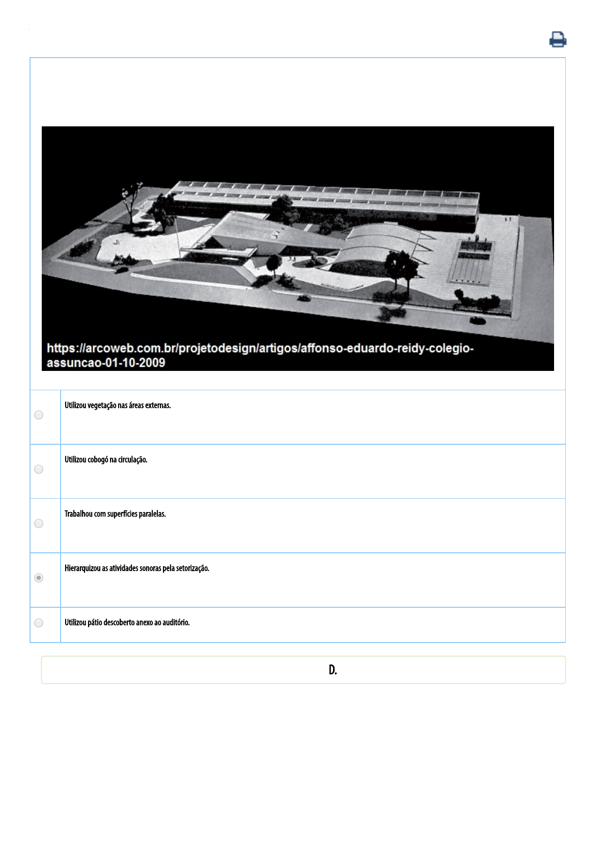 26/09/2019 Universidade Paulista - UNIP : Disciplina On-line. https://www.unip.br/presencial/central/Interna.aspx 1/1 A Escola do Conjunto Pedregulho, projetada por Affonso Eduardo Reidy, pertence à rede municipal de edifícios escolares do Rio de Janeiro e é utilizada da 1ª à 4ª série do ensino fundamental. Sabe-se que usuários nesta faixa etária precisam de maior concentração nas tarefas desenvolvidas e que, por isso, o nível de ruído de fundo das salas tem de atender à NBR 10151. A Utilizou vegetação nas áreas externas. B Utilizou cobogó na circulação. C Trabalhou com superfícies paralelas. D Hierarquizou as atividades sonoras pela setorização. E Utilizou pátio descoberto anexo ao auditório. Você já respondeu e acertou esse exercício. A resposta correta é: D.
