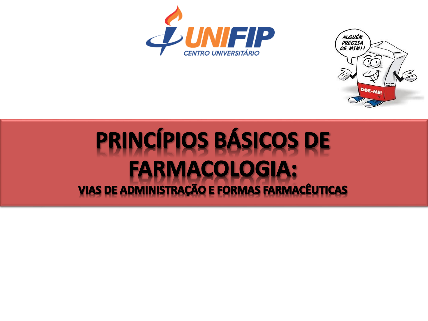 Profa. Dra. Paula Regina Rodrigues Salgado paulasalgado87@gmail.com DISCIPLINA: FARMACOLOGIA PRINCÍPIOS BÁSICOS DE FARMACOLOGIA VIAS DE ADMINISTRAÇÃO DOS MEDICAMENTOS “ Via de administração é o caminho pelo qual uma droga é colocada em contato com o organismo.” PRINCÍPIOS BÁSICOS DE FARMACOLOGIA VIAS DE ADMINISTRAÇÃO DOS MEDICAMENTOS Tópica Enteral Parenteral Efeito local/ Substância aplicada diretamente onde se deseja sua ação Efeito sistêmico/ Substância é administrada via TGI Efeito sistêmico/ Substância é administrada por outra forma sem ser via TGI ocorre pouca absorção até chegar ao intestino delgado Expõe o fármaco a ambientes ácidos (estômago) e básicos (duodeno) rigorosos passíveis de limitar a sua absorção Principal local de absorção é a mucosa intestinal Via de Administração Enteral 4 PRINCÍPIOS BÁSICOS DE FARMACOLOGIA VIAS DE ADMINISTRAÇÃO DOS MEDICAMENTOS Via de Administração Enteral Vantagens: Simples Baixo custo Conveniente Indolor Sem infecção 5 PRINCÍPIOS BÁSICOS DE FARMACOLOGIA VIAS DE ADMINISTRAÇÃO DOS MEDICAMENTOS Depende da adesão do paciente A biodisponibilidade pode ser errática metabolismo de primeira passagem Desvantagens: PRINCÍPIOS BÁSICOS DE FARMACOLOGIA Maioria dos medicamentos são administrados por esta via. VANTAGENS: Mais inofensiva (comparada à injetável); Menos dolorida ao paciente (fácil aceitação); Não precisa de pessoal especializado para sua administração. VIAS DE ADMINISTRAÇÃO DOS MEDICAMENTOS Via Oral DESVANTAGENS: Resposta lenta(comparada a injetável); Probabilidade de absorção irregular: alimento, ácidos estomacais. Pacientes desacordados. Vômitos e náuseas causados pela irritação da mucosa GI PRINCÍPIOS BÁSICOS DE FARMACOLOGIA FORMAS FARMACÊUTICAS UTILIZADAS POR VIA ORAL COMPRIMIDO: Formas sólidas preparadas por compressão ou moldagem que contêm princípios ativos com ou sem diluentes, desintegrantes, revestimentos, corantes e outros excipientes. CÁPSULAS: São formas farmacêuticas sólidas nas quais o fármaco e os excipientes adequados estão incluídos em invólucro duro ou mole, em geral composto por gelatina. PRINCÍPIOS BÁSICOS DE FARMACOLOGIA DRÁGEAS: Forma farmacêutica sólida cujo núcleo é um comprimido, que passou por um processo de revestimento com açúcar e corante, processo denominado drageamento. FORMAS FARMACÊUTICAS UTILIZADAS POR VIA ORAL SUSPENSÃO: Preparações de fármacos finamente divididos, insolúveis no veiculo, ficando suspensas. AGITAR O MEDICAMENTO ANTES DE TOMAR. Paciente submedicado ou intoxicado PRINCÍPIOS BÁSICOS DE FARMACOLOGIA SOLUÇÕES: Elixires (soluções com veículo alcoólico edulcorado) Xaropes (utilizam sacarose para melhorar o sabor) Para pessoas com dificuldade de deglutição (crianças e idosos). Fármacos em soluções são absorvidos mais rápido que os sólidos e que as suspensões, pois não são necessários os processos de desintegração Xaropes: Não devem ser utilizados por pacientes com Diabetes; Elixires: Devem ser evitados por crianças e pessoas com problemas com álcool. FORMAS FARMACÊUTICAS UTILIZADAS POR VIA ORAL PRINCÍPIOS BÁSICOS DE FARMACOLOGIA VIAS DE ADMINISTRAÇÃO DOS MEDICAMENTOS • Administração em urgências (ataque cardíaco, picos de pressão) • Embaixo da língua até sua absorção total • Promovem efeito sistêmico • Nem todo medicamento é sublingual (SL) Via Sublingual • FORMAS FARMACEUTICAS • Comprimido • Gotas PRINCÍPIOS BÁSICOS DE FARMACOLOGIA Podem ter efeito local ou sistêmico; Utilizada quando o fármaco é sensível as enzimas digestivas, pacientes que não podem deglutir ou estão vomitando. Essa via não é bem aceita pelos pacientes sob alegação de incômodo, preconceito, restrições culturais. FORMAS FARMACÊUTICAS UTILIZADAS POR VIA RETAL: Supositório. Ex. Glicerina (laxativo) e diclofenaco (anti-inflamatório ) Solução retal. Ex. fleet enema (laxativo) VIAS DE ADMINISTRAÇÃO DOS MEDICAMENTOS Via Retal PRINCÍPIOS BÁSICOS DE FARMACOLOGIA VANTAGENS: Efeito imediato do fármaco (situações de emergência) Evita inativação pelas enzimas digestivas; Possibilidade de administração para pacientes inconscientes; São administrados por agulha fina no organismo em vários locais e várias profundidades. VIAS DE ADMINISTRAÇÃO DOS MEDICAMENTOS Via de Administração Parenteral PRINCÍPIOS BÁSICOS DE FARMACOLOGIA DESVANTAGENS: Erros de administração- toxicidade; Muito dolorosa; Alto custo envolvido; Necessidade de pessoal especializado para aplicação; São administrados por agulha fina no organismo em vários locais e várias profundidades. VIAS DE ADMINISTRAÇÃO DOS MEDICAMENTOS Via de Administração Parenteral PRINCÍPIOS BÁSICOS DE FARMACOLOGIA Via intramuscular Via intradérmica Via intravenosa Via subcutânea ou hipodérmica FORMA FARMACÊUTICA: Injetáveis VIAS DE ADMINISTRAÇÃO DOS MEDICAMENTOS Via mais rápida e confiável Indicados para pacientes inconscientes, atendimento de emergência ex.: anestésicos Via Intravenosa Via de Administração Parenteral 15 PRINCÍPIOS BÁSICOS DE FARMACOLOGIA VIAS DE ADMINISTRAÇÃO DOS MEDICAMENTOS Altas concentrações são alcançadas Infusões contínuas vantagem de uma liberação controlada do fármaco Via Intravenosa Via de Administração Parenteral 16 PRINCÍPIOS BÁSICOS DE FARMACOLOGIA VIAS DE ADMINISTRAÇÃO DOS MEDICAMENTOS Desvantagem dificuldade de acesso às veias de indivíduos obesos É necessário assepsia e pessoas treinadas Impossível recuperar o fármaco após a administração A toxicidade do fármaco pode chegar ao nível máximo • Injetado diretamente no músculo (deltoide, vasto lateral, glúteos) • Aplicação única ou de efeito mais prolongado (ex: anticoncepcionais) •Velocidade de absorção depende do local da injeção e do fluxo sanguíneo local • Não tem efeito tão imediato • Danos musculares irreversíveis !!!! PRINCÍPIOS BÁSICOS DE FARMA