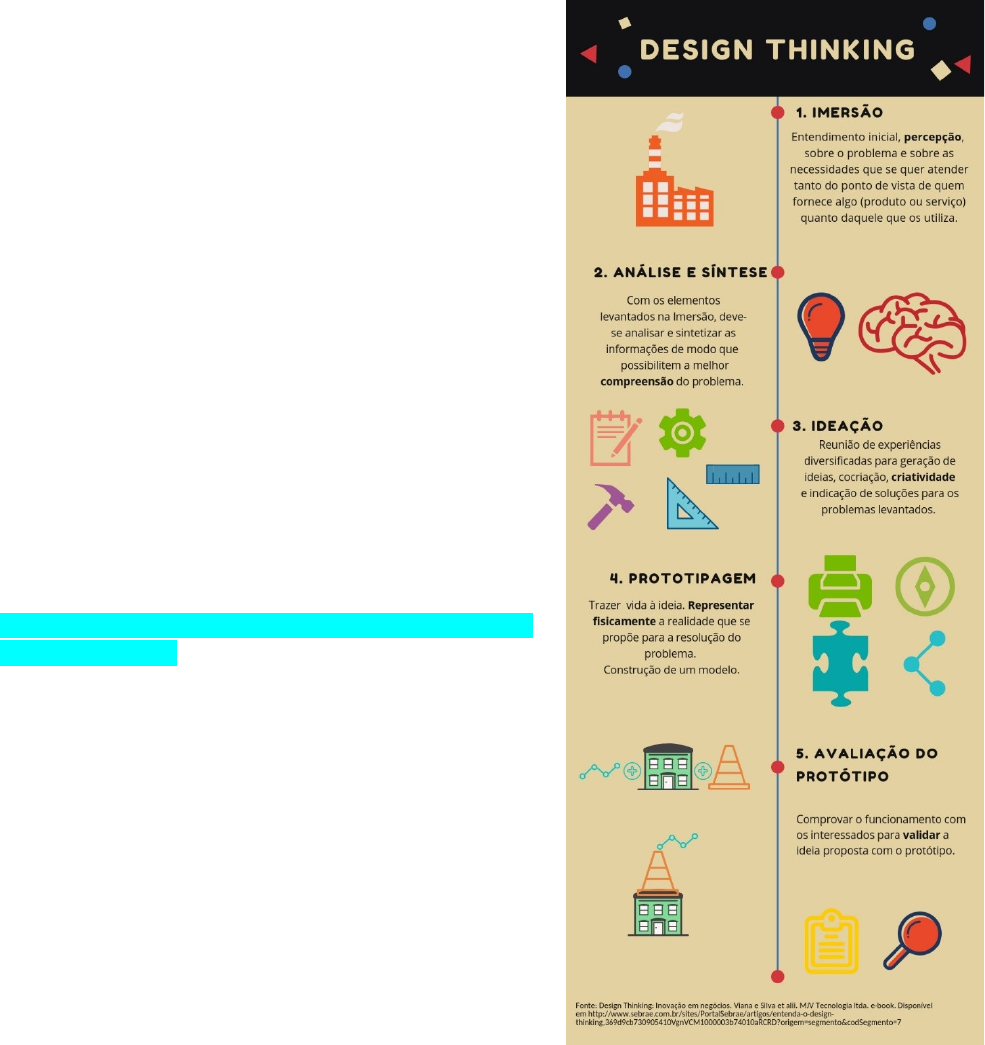 DESIGN THINKING Aula 1 O que é: É o modo de pensar e agir dos designers, nos negócios e na vida. É um método de trabalho colaborativo, centrado nas pessoas, que estimula o planejamento das suas ações de acordo com a expectativa das pessoas em relação a algum problema que esperam que seja resolvido. Pra que serve: Serve para, coletiva e colaborativamente, problematizar, refletir, planejar, prototipar ações para que as pessoas tenham maior prazer com seus bens, serviços e consumos. Quem pode utilizar: Todas as pessoas podem utilizar, entretanto, as organizações e os empreendedores têm lançado mão desse processo com mais regularidade. 4 termos importantes para o Design Thinking: empatia (colocar-se verdadeiramente no lugar do outro), resolução de problemas (ter como alvo resolver problemas desse outro), colaboração (de maneira colaborativa e em conjunto, buscar soluções para as situações-problema levantadas) e inovação (tentar criar soluções inovadoras para os problemas levantados). Desing Thinking está intimamente ligado com o desejo de transformação. Termos essenciais do DT: - Imersão (entendimento); - Análise e Síntese (organização); - Ideação (criação); - Prototipagem (testes); - Avaliação do Protótipo. Equipe Multidisciplinar: Para um DT bem desenvolvido, nada de trabalhar sozinho. As palavras de ordem são: equipe multidisciplinar, trabalho colaborativo, aprendizagem em comunhão! Pra que uma Equipe Multidisciplinar: para que tenhamos o maior número possível de visões sobre os problemas e sobre as possíveis soluções. A equipe pode ser composta por especialistas da área que se quer compreender, porém, acrescida de outras figuras com as mais diversas formações, as quais podem indicar suas sugestões de modo que sejam ouvidas sem preconceito. DESIGN THINKING Aula 2 Fase de Imersão: Em DT a imersão carrega o sentido de entendimento inicial – percepção - sobre o problema e sobre as necessidades que se quer atender tanto do ponto de vista de quem fornece algo (produto ou serviço) quanto daquele que os utiliza. “Para toda problemática, existe uma solucionática!” O DT tem a perspectiva de dar respostas às situações percebidas. Entretanto, para que se tenha sucesso no desenvolvimento deste processo, é fundamental se colocar no lugar do outro e tentar perceber, sentir, vivenciar o que o incomoda ou do que ele necessita: é preciso exercitar empatia. Imersão Preliminar: ela é o princípio do entendimento do problema a ser resolvido; Nesta análise inicial, a equipe multidisciplinar, livremente, observa se há necessidade de reposicionar o problema, pensá-lo sobre outra(s) perspectiva(s). Imersão em Profundidade: é um mergulho profundo no universo pesquisado. A diferença, agora, além do aprofundamento no assunto, é que o mergulho deve considerar as pessoas, o contexto em que estão inseridas, buscando compreender comportamentos. Essa é a hora de pesquisar “com”. Pesquisar com os interessados (possíveis usuários) que se pretende “ajudar” na resolução dos problemas. Para tanto, a pesquisa na Imersão em Profundidade deve considerar o contexto. Deve-se assistir/vivenciar/participar/interagir/testemunhar/considerar com o interessado. O que percebem os interessados? Do que realmente precisam, suas vontades e desejos? Por quê? Em que condições? Na Imersão em Profundidade, deve-se lançar mão de várias ações que complementam a pesquisa como entrevistas, observação indireta, conversas com o interessado para que se posicione livremente sobre o assunto, perguntas que estimulam a reflexão sobre o que se quer resolver, a exemplo: qual foi a sua experiência com determinado produto/serviço/situação? Como determinado produto/serviço/situação afetou seu dia a dia? Qual é motivação para adquirir determinado produto ou serviço? Não há como negar que neste momento estaremos falando sobre qualidade, ou seja, realizando uma pesquisa qualitativa. Mapa de Empatia: em marketing principalmente, é utilizado basicamente para visualizar melhor as necessidades e desejos das pessoas. DESIGN THINKING Aula 3 Fase da Análise e Síntese: É importante pensar em organização (organização das ideias coletadas na fase de imersão). Deve-se interpretar os dados, processar as informações, identificar a situação-problema de maneira ainda mais clara, sintetizando as informações. Há autores que defendem que esta fase de Análise e Síntese ainda compõe a Imersão. De qualquer maneira, não há prejuízo em trabalhá-la separadamente. É um momento de seleção, em que deve haver análise e delimitação das ideias, de modo que apontem para uma convergência, sobretudo, da “dor” que vai resolver de seu cliente (Persona). Personas: São personagens fictícios criados, cada um com suas características individuais (idoso x jovem, conectado x analógico), para os quais se quer propor um produto ou serviço. Caracterizam-se as personas para que possam representar o mais realmente possível o grupo que se pretende atender. Eles passam a “existir” em cartões para que não nos esqueçamos que devemos pensar neles quando formos elaborar as propostas de resoluções de problemas. É o momento de pensar “para que/quem” vai servir esse produto ou serviço que estou planejando. Como fazer a análise e a síntese: Nas reuniões de discussão é importante, de acordo com o que foi levantado na Imersão, elaborar um Diagrama de Afinidades. Seleciona-se, em cartões de insights, as ideias afins, dependentes, similares, semelhantes em grupos maiores que as representem. Enfim, como o momento de Imersão é abrangente demais, na Análise e Síntese, tratamos de delimitar um pouco mais as reflexões. DESIGN THINKING Aula 4 Fase da Ideação: é uma reunião de experiências diversificadas para geração de ideias, co-criação, criatividade e indicação de soluções para os problemas levantados. Neste momento, já de