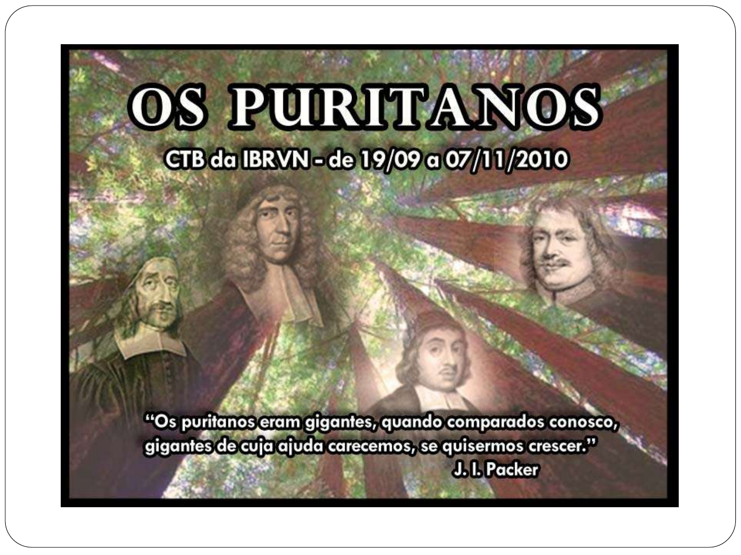 “Portanto, também nós, visto que temos a rodear-nos tão grande nuvem de testemunhas, desembaraçando-nos de todo peso e do pecado que tenazmente nos assedia, corramos, com perseverança, a carreira que nos está proposta, olhando firmemente para o Autor e Consumador da fé, Jesus, o qual, em troca da alegria que lhe estava proposta, suportou a cruz, não fazendo caso da ignomínia, e está assentado à destra do trono de Deus.” Hebreus 12:1-2 Introdução OS PURITANOS O Curso A Identidade Puritana O Puritano em Casa O Puritano na Sociedade O Puritano na Igreja A Espiritualidade Puritana Aprendendo com erros e acertos O Legado Puritano Fontes Palestras de J.I. Packer no Reformed Theological Seminary (1988?) – História e Teologia dos Puritanos Santos no Mundo – Leland Ryken – Ed. Fiel Quem Foram os Puritanos? – Errol Hulse – Ed.PES Entre os Gigantes de Deus – J. I. Packer – Ed. Fiel Os Puritanos: suas origens e seus sucessores – D. M. Lloyd-Jones – Ed. PES Entrevistas com Joel Beeke no Reformed Forum Curso História da Igreja – CTB 2008 IBRVN O Ressurgimento Localização Geral Tempo-Espaço Localização Geral Tempo-Espaço Removendo a Lama Falso estereótipo Duas “qualidades”: temperamento neurótico e taciturno Visão negativa quanto às alegrias e prazeres desta vida. 1938 – Ocorre uma guinada 4 historiadores americanos J. I. Packer: Os velhos e alegres puritanos O Caráter de um velho puritano ou não- conformista inglês John Geree – publicado em 1646 O termo Puritano começou a ser usado em 1564 e deixou de ser usado na prática no início da década de 1640. É um termo usado pelos inimigos. Era um termo jocoso. Aqueles que queriam ser mais “puros” e ter uma igreja mais “pura”. LEITURA O Caráter de um velho puritano ou não- conformista inglês Objeções contra quatro cerimônias Uso da aliança de casamento Ajoelhar-se para receber a ceia Uso da sobrepeliz Sinal da cruz na testa da pessoa que era batizada Oração em voz alta. Individual, em família e na igreja. Extemporânea e Litúrgica. Importância da Pregação O Dia do Senhor é o Sabbath Cristão Batismo O Caráter de um velho puritano ou não- conformista inglês Ceia do Senhor Relacionamentos Adornar a doutrina e não permitir que ela seja blasfemada – Tt 2:5;10; 1 Tm 6:1 Em toda a sua vida ele queria colocar a marca: “Santidade AO SENHOR” (Ex 28:36 e Ex 39:30) Família = uma pequena igreja O que podemos aprender com eles? MATURIDADE “A maturidade é uma composição de sabedoria, boa vontade, maleabilidade e criatividade. Os puritanos exemplificavam a maturidade; nós não. Um líder bem- viajado, um americano nativo, declarou que o protestantismo norte-americano – centrado no homem, manipulativo, orientado pelo sucesso, auto-indulgente e sentimental, como é, patentemente – mede cinco mil quilômetros de largura e um centímetro de profundidade. Somos anões espirituais. Os puritanos, em contraste, como um corpo eram gigantes. Eram grandes almas servindo a um grande Deus.” J. I. Packer O que podemos aprender com eles? Integração da vida diária Qualidade da experiência espiritual Paixão pela ação eficaz Programa para a estabilidade da família Senso de valor humano Ideal de renovação da igreja Sete Reis, Duas Rainhas e um Lorde Protetor CONTEXTO HISTÓRICO Reforma na Inglaterra 1536 – Rei Henrique VIII e o Parlamento se separam da igreja de Roma. Reforma na Inglaterra – Reforma de conveniência política e pessoal do rei. O rei não queria reforma de doutrina e de padrões de adoração. 1509 -HENRIQUE VIII - 1547 Henrique VIII 1509-1547 38 anos Dinastia Tudor Reforma na Inglaterra Coroado aos 9 anos. Reforma avança rapidamente. Publicam-se os 39 artigos da igreja anglicana e o Livro de Oração Comum. Eduardo morre aos 16 anos. 1547 -EDUARDO VI - 1553 Henrique VIII 1509-1547 38 anos Eduardo VI 1547-1553 6 anos Dinastia Tudor Tentativa de Retorno ao Catolicismo Católica Romana Estratégia para trazer a nação de volta ao catolicismo – demonstrar força. 330 protestantes queimados na estaca por heresia. 800 fugiram para o continente. Resultado – ódio eterno dos ingleses ao catolicismo romano. 1553 –MARIA I - 1558 Henrique VIII 1509-1547 38 anos Eduardo VI 1547-1553 6 anos Maria I 1553-1558 5 anos Dinastia Tudor Protestantismo Via Media Isabel I – Retorno ao Protestantismo. Igreja da Inglaterra – federação de 10.000 paróquias espalhadas pelo país. Descontentamento em alguns = OS PURITANOS (os “puros”) 1558 –ELIZABETH I - 1603 Henrique VIII 1509-1547 38 anos Eduardo VI 1547-1553 6 anos Maria I 1553-1558 5 anos Isabel I 1558-1603 45 anos Dinastia Tudor Pelo que eles lutavam? Uso obrigatório das cerimônias do livro de Oração Comum (Ato de Uniformidade de 1559). Modelo de Governo da Igreja. Ausência de pregadores do Evangelho nos púlpitos da Inglaterra. Santidade ao SENHOR em toda a vida humana, e nada menos que isso, é o que Deus espera de Seu povo. A Chegada dos Stuart Esperança torna-se frustração 1604 – Conferência do Tribunal de Hampton 1618 – Book of Sports Arminianismo 1620 – Fundada a colônia dos peregrinos em Plymouth, Massachussets (EUA) Basilikon Doron 1603 –TIAGO I - 1625 Henrique VIII 1509-1547 38 anos Eduardo VI 1547-1553 6 anos Maria I 1553-1558 5 anos Isabel I 1558-1603 45 anos Tiago I 1603-1625 22 anos Dinastia Tudor Absolutismo Carlos I segue à risco os conselhos do pai. 1640 Guerra Civil: REI X PARLAMENTO Carlos I é decapitado em 1649 1625 – CARLOS I - 1640 Henrique VIII 1509-1547 38 anos Eduardo VI 1547-1553 6 anos Maria I 1553-1558 5 anos Isabel I 1558-1603 45 anos Tiago I 1603-1625 22 anos Carlos I 1625-1640 15 anos Dinastia Tudor Dinastia Stuart Guerra Civil Vácuo de poder (1649- 1653) Durante a guerra civil o parlamento convocou a Assembléia de Westminster (1643- 1646) República (Commonwealth) Cromwell – Lorde Protetor Tentou montar parlamentos de santos. Richard Cromwell não e