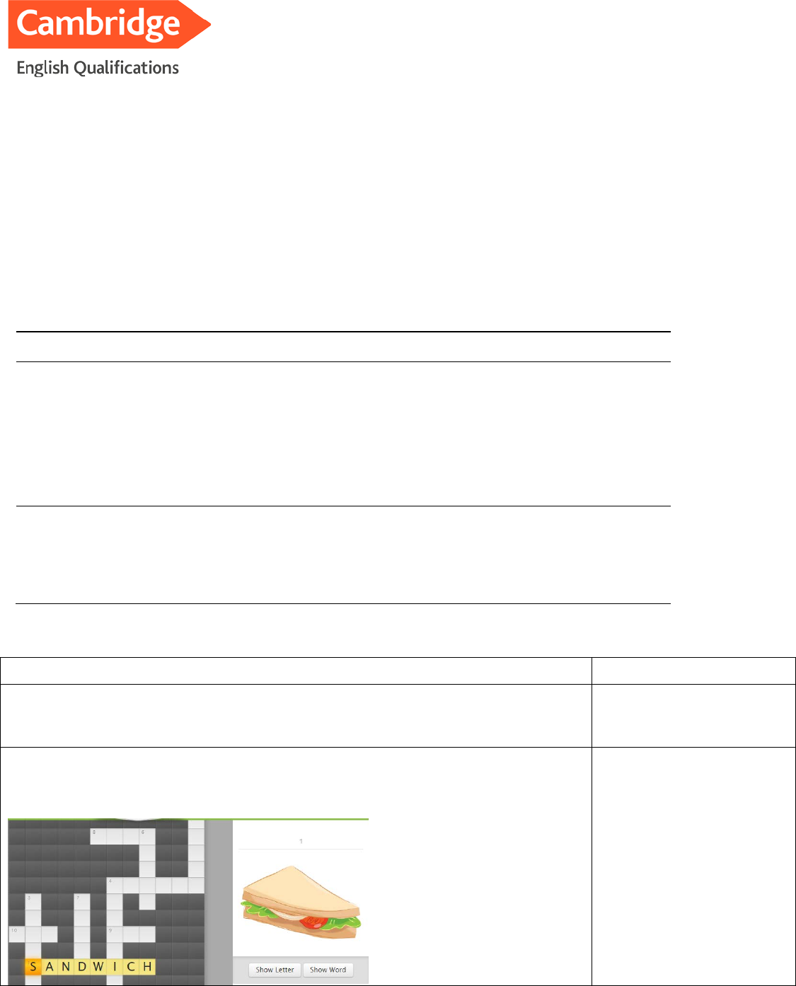 1 A1 Movers Speaking Part 2 Description This lesson plan has been designed to help students prepare for A1 Movers Speaking Part 2. It can be delivered face to face or online. The ‘online options’ column gives teachers ideas how the stages could be adapted for teaching online. In this lesson, students review and practise food/tableware vocabulary and There’s a/There are through a crossword and speaking game. They then practise describing pictures to tell a story. Time required: 45 minutes (can be extended or shortened as required) Materials required: A1 Movers sample task (see below - sent to parents in advance and printed if possible) Prepared presentation/PowerPoint slides Food/tableware picture (see below) Listen and draw worksheet (see below - sent to parents in advance and 2 copies printed if possible) Aims: to review and practise food/tableware vocabulary to review and practise There’s a/There are to complete a practice A1 Movers Speaking Part 2 task telling a story from pictures Procedure Lesson Stages Online options Greet the students as they arrive. Check they know how to switch their audio and video on. Warmer - food crossword Display the online crossword. Point to the picture (sandwich) and number 1. Ask: “What is it?”. Type ‘sandwich’ into the puzzle. Screenshot from Educaplay Share your screen. Children could type into the chat (you can check their spelling this way too!) https://www.educaplay.com/learning-resources/5814040-food_and_tableware.html 2 Continue with the other clues, asking children to name food/tableware items until the crossword is complete. Model and drill the words to help children if they have difficulties with pronunciation. Ask: “What’s your favourite food? What do you eat for breakfast/lunch/dinner?” For extra support, you can display the first letter of each word by clicking on ‘show letter’. To add challenge, children could write the words as you show the pictures. Grammar – there’s a /there are Display the set of pictures (see Materials) very quickly. Ask students: “What did you see?” They say what they remember. Repeat, showing the picture again very quickly. Keep going until they’ve got them all. Alternatively, show the picture for a few seconds, then hide it. Ask students to write the items they saw. Now tell the students to close their eyes. Cover one of the items. Show the picture again. Ask “What’s missing?” Students say the missing item. Repeat with different food items. Show the whole picture. Say: “There’s a bowl. There are some carrots” When you say “There’s a…” hold up one finger. When you say “There are…” Hold up more than one finger. Repeat, pointing to other food items in the picture. Model and drill the sentences naturally to show the linking and weak forms: There’s a There are ə ə Check understanding. Point to the picture of a bowl. Say: “a bowl. ‘There’s a’ or ‘There are’?” (There’s a bowl) Repeat with other items in the picture. Use your fingers to remind children about singular/plural. You could ask students to type in the chat, if they are writing the food they see. You could draw a box in PowerPoint or by using Annotate Speaking task Display the first picture from the speaking task (see Materials). Point to things in the picture. Elicit “There’s a .. There are…” This gives children some practice of the grammar, and checks key vocabulary for the speaking task. Point to the boy. Ask “Who’s this?” (Fred) You could use the examiner script: “These pictures show a story. It’s called, ‘Fred loves food’. Look at the pictures first. (Pause) Fred’s at home with his family. They’re in the kitchen and Mum’s giving him his dinner.” For extra support, go through each picture in turn, asking questions, for example: “Tell me about this picture” “What’s Fred doing?” “What’s Fred’s dad doing?” “Is he happy?” Share your screen. Use your mouse to point. 3 Give lots of encouragement. You could repeat the task, asking different students. To add challenge, divide the children into pairs and get them to describe the pictures together. If you can monitor students safely, use breakout rooms for the pair work. Optional extension - Describe and draw This practises food vocabulary and There’s a/There are, and prepositions of place. Display the grid (see Materials). Say: “Listen and draw.” Describe the location of some different food items in your picture. As you speak, draw them on your worksheet (by hand, or on a screen that students can’t see). For example: “In the middle square, there are two apples. Below the apples, there’s a glass of water...” Children listen and draw the food items in their grids. Check by showing your completed grid. Children show what they drew in their grids. For extra support, number the squares and say “In number 1, there’s a…” etc. To add challenge, let children lead the activity. First, ask them to draw different food items in a clean grid (or other vocabulary, if you want them to practise something else). Divide children into pairs. They take it in turns to describe their grid. Their partner listens and draws. They check by comparing drawings. Encourage them to use “There’s a / There are…” Share your screen. Children hold up their drawings to the camera Use breakout rooms. Alternatively, as a whole class, nominate some children to describe their pictures for others to draw. Homework You could share the link to the Monkey Puzzle game with parents for more practice of identifying things in pictures. You could also share the link to the Movers word list picture book so that children can practise describing pictures with their parents (page 8-9 goes well with this lesson). Children could write a sentence to go with each picture of the story. https://assets.cambridgeenglish.org/activities-for-children/m-rw-06-eating-and-drinking/story_html5.html?lms=1 https://www.cambridge