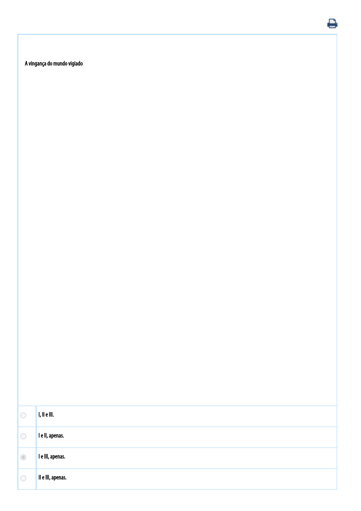 08/09/2020 Universidade Paulista - UNIP : Disciplina On-line. https://online.unip.br/disciplina/detalhes/9016 1/2 Considere o texto e as a�rmativas que seguem. A vingança do mundo vigiado Sorria, você está sendo �lmado. Ou chore, você está sendo �lmado. A propósito, não é improvável que você esteja sendo �lmado enquanto lê este artigo. Os seus hábitos de consumo estão catalogados em bancos de dados que são vendidos por aí. A marca de papel higiênico que você compra no supermercado faz parte da sua �cha pessoal em algum arquivo de marketing. Os exames do seu check-up, realizados naquele laboratório todo informatizado, bem, eles podem cair na rede. As chamadas do seu celular são rastreáveis, todas elas. A que horas você ligou para quem e de que lugar você chamou, tudo se sabe. Pelas pesquisas que você faz no Google, os administradores podem levantar o seu rol de preferências, mesmo aquelas que você não gostaria de declarar em público. Os radares da cidade registram por onde você passeia de automóvel. As consultas que você faz na Amazon fazem parte do seu per�l, devidamente armazenado. Pelo seu cartão de crédito, podem saber os restaurantes em que você anda almoçando, os vinhos que você pede, a dieta que você segue. As portarias de prédios que você cruzou, as catracas que atravessou, os elevadores em que subiu ou desceu, tudo isso é sabido. E aqui não estamos falando de vírus espiões instalados em seu computador, das escutas encomendadas pelos rivais (amorosos, religiosos, políticos ou econômicos), mas apenas dos mecanismos supostamente lícitos pelos quais, como já foi dito, você está sendo �lmado. Não é bem que a privacidade tenha diminuído de uns tempos para cá. A privacidade, nos moldes em que costumávamos imaginá-la, virou uma categoria impossível, irrealizável. A privacidade foi extinta pela História. Dentro disso, qual a grande surpresa do WikiLeaks? Ora, ora, nenhuma. Pelo WikiLeaks, a espionagem o�cial, antes guardada pelos carimbos de "secreto" ou "con�dencial" nos gabinetes diplomáticos, vai-se convertendo em divertimento planetário. A profusão dos documentos vazados e a irrelevância da imensa maioria das informações conferem ao circo certo ar de banalidade, como se segredos de Estado não fossem lá grande coisa. E talvez não sejam mesmo. O WikiLeaks sobrevém como a vingança dos que não têm mais privacidade contra os que ainda se imaginavam controladores das privacidades dos comuns. Não há mais segredos bem guardados, nem mesmo na Casa Branca. O panóptico estilhaçou-se, caiu como a velha Bastilha. Reis e rainhas trafegam nus. Os esconderijos esfacelam-se. (BUCCI, E. A vingança do mundo vigiado. Disponível em: <http://www.estadao.com.br/noticias/impresso,wikileaks-ou-a-vinganca-do-mundo-vigiado,654290,0.htm>. Acesso em: 08 mar. 2013. Adaptado). Com base nesse texto,m considere as a�rmativas abaixo. I Atualmente é impossível manter total privacidade e há formas consideradas lícitas de mapear as ações cotidianas dos cidadãos. II Ao quebrar a privacidade na internet o WikiLeaks realiza, em essência, a mesma prática já executada por empresas e governos. III A vigilância dos hábitos e das ações das pessoas visa sempre ao bem-estar e à segurança dos cidadãos. Está correto o que se a�rma em A I, II e III. B I e II, apenas. C I e III, apenas. D II e III, apenas. 08/09/2020 Universidade Paulista - UNIP : Disciplina On-line. https://online.unip.br/disciplina/detalhes/9016 2/2 E I, apenas. Você já respondeu e acertou esse exercício. A resposta correta é: C.