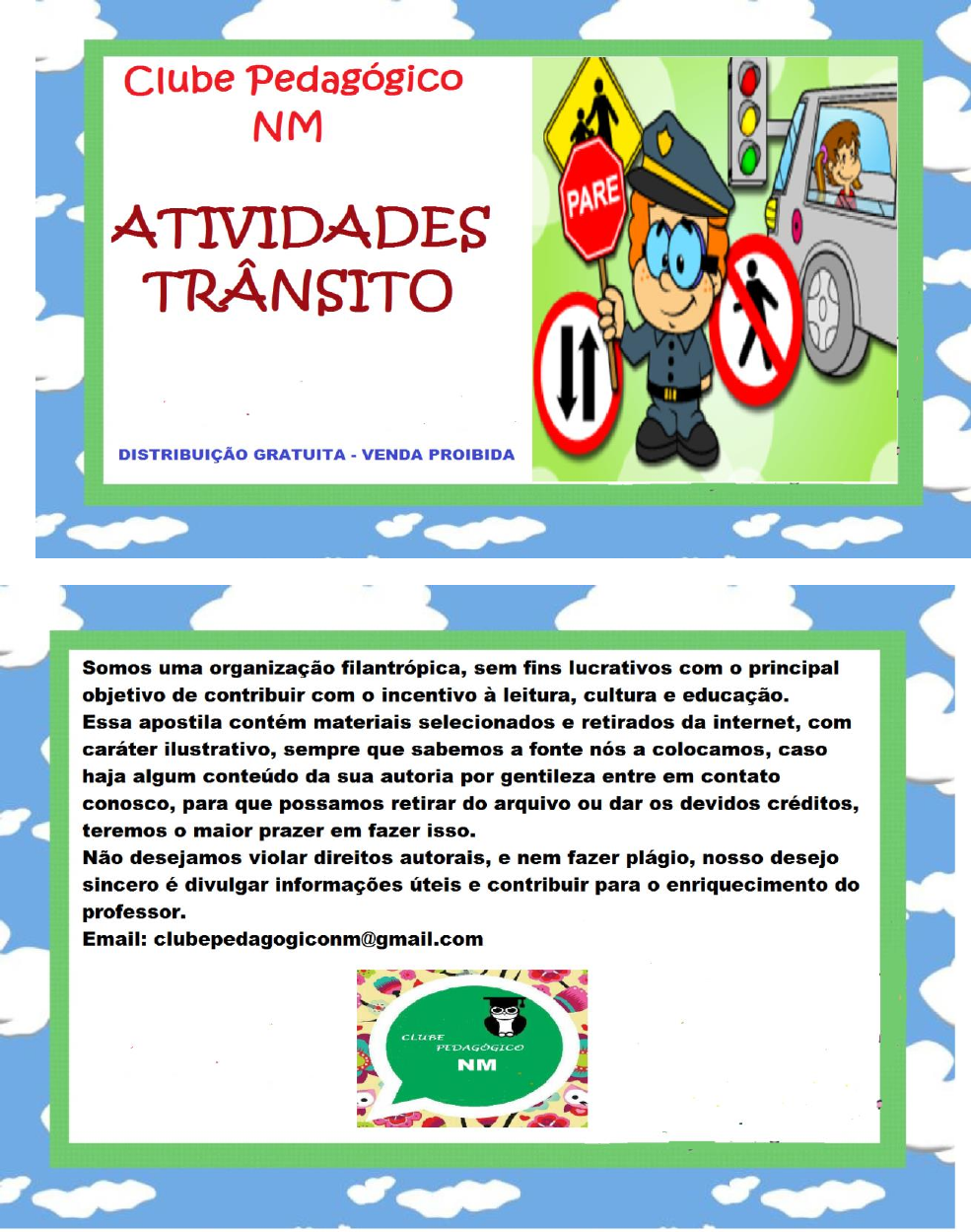 CLUBE PEDAGÓGICO NM TRÂNSITO – Atividades e idéias PINTE A CENA CORRETA: CIRCULE O QUE ESTA ERRADO: PINTE A CENA CORRETA: PINTE OS PONTINHOS E VEJAM O QUE DESCOBREM: Atividade de Educação de trânsito 1) Complete com certo (C) ou errado (E) as questões abaixo, de acordo com as regras de trânsito: ( ) Sempre olho para os dois lado antes de atravessar a rua. ( ) Minha irmã sempre “fura” o sinal vermelho. ( ) Eu e meus amigos jogamos futebol na rua. ( ) Quando saímos de carro a mamãe diz para todos colocarem o cinto de segurança. ( ) a faixa contínua pintada no chão da estrada, significa que não se pode ultrapassar. 2) Por que desrespeitar as leis e sinais de trânsito é crime? ______________________________________________________________________________ ______________________________________________________________________________ ______________________________________________________________________________ ______________________________________________________________________________ ______________________________________________________________________________ ______________________________________________________________________________ 3) Anualmente no Brasil cerca de 50.000 pessoas morrem em acidentes de trânsito. Em sua opinião, porque isso acontece? ______________________________________________________________________________ ______________________________________________________________________________ ______________________________________________________________________________ ______________________________________________________________________________ ______________________________________________________________________________ ______________________________________________________________________________ 4) Encontre palavras relacionadas ao trânsito. MONTAR CENA TRÂNSITO BINGO JOGO DA MEMÓRIA GRÁFICO MEIO DE TRANSPORTE QUE VÃO A ESCOLA
