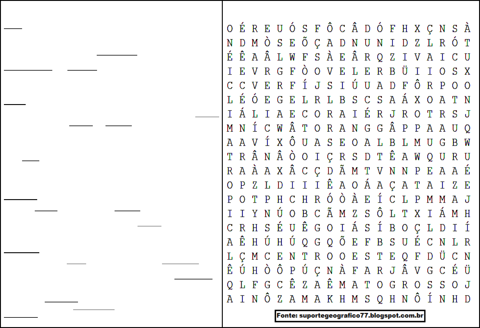 ASPECTOS FÍSICOS DA REGIÃO CETRO-OESTE Clima O clima desta região caracteriza-se pela pluviosidade mal distribuída, já que a maior parte das chuvas acontece no verão, fazendo o inverno ser muito seco. O clima tropical domina a maior parte do território, com exceção ao norte do estado do Mato Grosso que tem o clima equatorial da Amazônia. Cidades como Brasília, por exemplo, sofrem com a baixa umidade e secura durante boa parte do ano. As temperaturas no geral variam bastante, nas épocas mais quentes passa dos 30ºC, já na estação fria gira entorno de 15ºC e 20ºC. Relevo Basicamente o relevo do centro-oeste divide-se em Planalto Central, Meridional e Planície do Pantanal. O primeiro é uma elevação composta por misturas sedimentares e rochosas, onde é muito comum encontrarmos chapadas, como a de Parecis e Veadeiros. O Planalto Meridional localiza-se nos estados de Mato Grosso do Sul e Goiás, caracterizando-se pela Terra Roxa, formado por restos de rochas basálticas, onde se encontra um solo muito fértil. A Planície do Pantanal, na verdade, é uma depressão entre os dois planaltos acima citados, facilmente inundável. Vegetação O cerrado, com árvores e arbustos retorcidos e geralmente distantes uma das outras, domina a maior parte da região. O extremo norte mato-grossense é caracterizado pela Floresta Amazônica. Ainda no estado, encontramos isoladamente a Vacaria, pequenos “pingos” de campos abertos, parecido com o Pampa do sul brasileiro. Hidrografia As principais bacias hidrográficas da região centro-oeste são a Amazônica, Tocantins-Araguaia e Platina. A primeira é uma “parte” da Bacia dominante na região norte, encontrado no norte do Mato Grosso. A Bacia Tocantins-Araguaia é formada pelos rios homônimos e seus afluentes, nos estados de Goiás e Mato Grosso do Sul. A Bacia Platina tem o Rio Paraná e o Paraguai como principais, estendendo-se a oeste da região. O Rio Paraguai, inclusive, é responsável pelas inundações das planícies pantaneiras. Fonte: http://www.geografiaopinativa.com.br/2013/07/regiao-centro-oeste-caracteristicas.html Encontre as palavras grifadas no caça palavras.