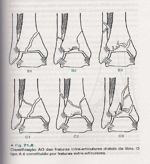 FRATURA DO TORNOZELO Fraturas distais da tíbia Nas fraturas sem deslocamento (b1), imobilização com bota gessada por um período de 4 a 6 semanas, seguida de descarga progressiva e mobilização ativa por mais 4 semanas. Nas demais é indicado tratamento cirúrgico, sendo no pós-operatório necessário utilizar bota gessada por aproximadamente 3 semanas. Fraturas Maleolares Radiografia: AP e Perfil Diagnóstico: dor localizada, se existir fratura com deslocamento a deformidade será visível ou palpável. Pode existir também hematoma e edema. Mecanismo de lesão: 1- O pé supinado é aduzido. Produzem-se rupturas ou avulsões dos ligamentos fibulotalar anterior e fibulocalcaneal, ou fraturas do maléolo fibular abaixo da sindesmose, seguidas de fratura oblíqua ou vertical (por cisalhamento) do maléolo tibial. 2- O pé supinado é rodado para fora com relação à perna. Produzem-se sucessivamente lesão da sindesmose tibiofibular anterior, fratura espiróide da fíbula ao nível da sindesmose, ruptura da sindesmose posterior ou arrancamento da margem póstero-lateral da tíbia e, finalmente, ruptura do ligamento deltóide ou avulsão do maléolo tibial. 3- O pé pronado é abduzido, ou seja, inclinado lateralmente em relação à perna. Resultam, em sequência, ruptura do ligamento deltóide ou fratura do maléolo tibial, ruptura da sindesmose tibiofibular anterior e posterior ou arrancamento das sindesmoses com fragmentos ósseos da tíbia e fratura na fíbula, com terceiro fragmento triangular lateral ou cominuição lateral logo acima da sindesmose. 4- O pé pronado é rodado externamente com relação à perna. Sucedem-se fratura do maléolo tibial ou ruptura do ligamento deltóide, ruptura da sindesmose anterior por arrancamento na tíbia, ruptura do ligamento interósseo, fratura da fíbula acima da sindesmose, ruptura da sindesmose posterior ou arrancamento de fragmento posterior da tíbia. Classificação: Tipo A: lesão infra-sindesmal do maléolo fibular. (mecanismo de lesão 1) A1: lesão isolada do maléolo ou dos ligamentos fibulares A2: com fratura do maléolo tibial A3: com fratura marginal póstero-lateral da tíbia. Tipo B: fratura transsindesmal da fíbula (mecanismo de lesão 2 e 3) B1: fratura isolada da fíbula B2: com lesão medial (fratura do maléolo ou ruptura do ligamento deltóide) B3: com lesão medial e fratura marginal póstero-lateral da tíbia. Tipo C: fratura supra-sindesmal da fíbula (mecanismo de lesão 4) C1: fratura diafisária da fíbula, simples. C2: fratura diafisária da fíbula, complexa. C3: fratura da fíbula proximal (fratura-luxação de Maisonneuve). Tratamento conservador – para fraturas não-deslocadas com utilização da imobilização, sendo que as fraturas com deslocamentos pode ser utilizado redução e imobilização. O tempo de imobilização para fraturas não-deslocadas é de 6 semanas e de 8 a 10 semanas para fraturas que tiveram redução. O apoio com gesso pode iniciar entre 4 a 6 semanas, dependendo da estabilidade da redução. Os dedos e o joelho devem ser exercitados desde o primeiro dia. Tratamento cirúrgico é indicado quando as fraturas são instáveis pela configuração dos fragmentos e pelas lesões capsuloligamentares associadas. As fraturas do tipo A1 são as que mais se prestam ao tratamento incruento. Nas demais é indicada redução cirúrgica. A vantagem da redução cirúrgica é que permite mobilização ativa precoce (2 a 3 semanas), embora o apoio só possa iniciar-se após 6 semanas.