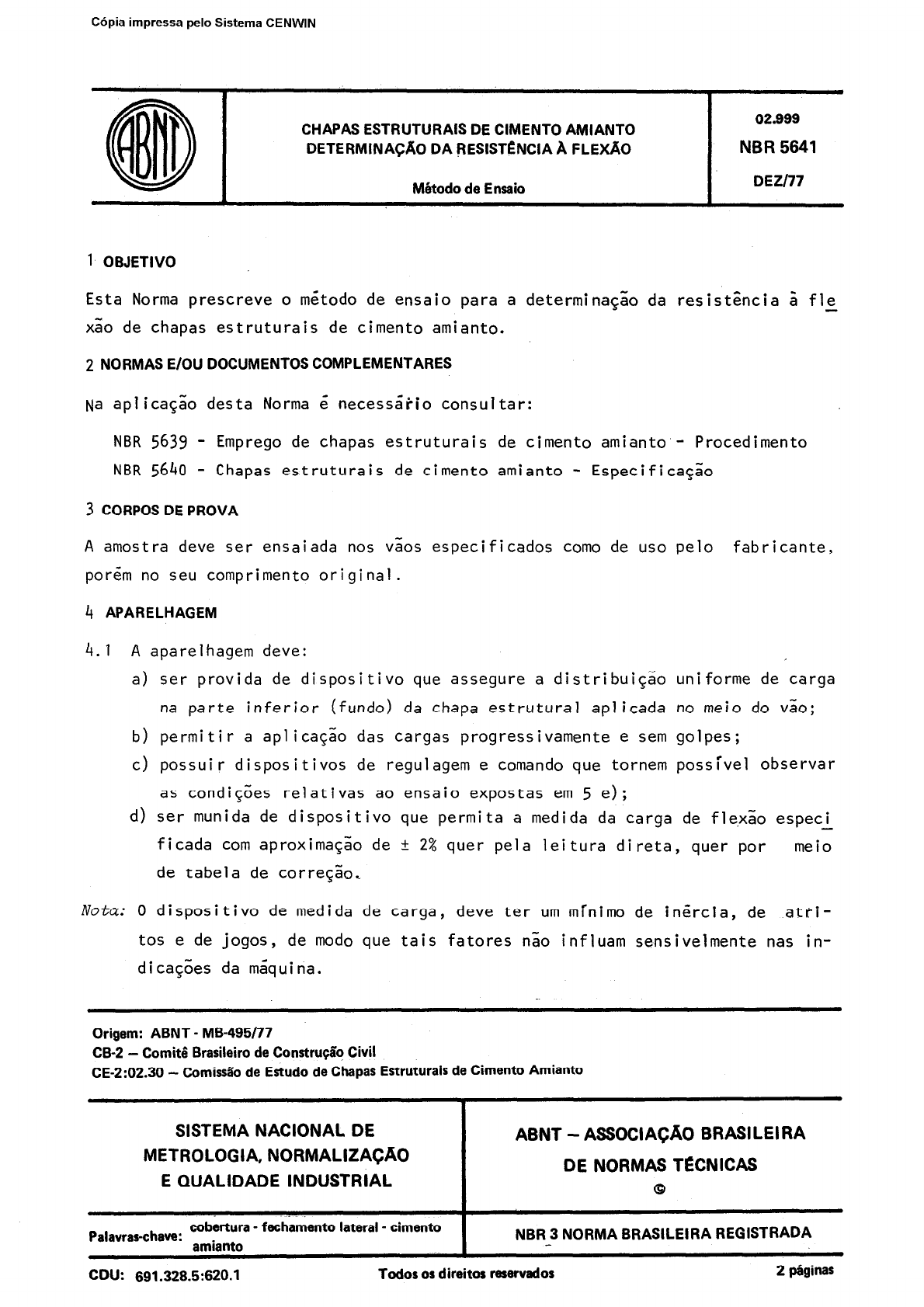 Cdpia impressa pelo Sistema CENWIN CHAPAS ESTRUTURAIS DE CIMENTO AMIANTO OETERMINACAO DA RESIST5NCIA A PLEXAO Wtodo de Ensaio 02.999 NBR 5641 DEZ/77 1 OBJETIVO Esta Norma prescreve o metodo de ensaio para a determinasao da resist&cia 5 fle xao de chapas estruturais de cimento amianto. 2 NORMAS E/OU DOCUMENTOS COMPLEMENTARES Na apl icac$o desta Norma 6 necesssirio consul tar: NBR 5639 - Emprego de chapas estruturais de cimento amianto - Procedimento NBR 5640 - Chapas estruturais de cimento amianto - Especificacao 3 CORPOS DE PROVA A amostra deve ser ensaiada nos vaos especificados coma de uso pelo fabricante, pot-em no seu comprimento original. 4 APARELHAGEM 4.1 A aparelhagem deve: a) ser provida de dispositivo que assegure a distribuicao uniforme de carga na parte inferior (fundo) da chapa estrutural apl icada no meio do vao; b) permitir a aplicacao das cargas progressivamente e sem golpes; c) possuir dispositivos de regulagem e comando que tornem possivel observar as condicoes relativas ao ensaio expostas em 5 e); d) ser munida de dispositivo que permita a medida da carga de fle,x$o especi ficada corn aproximacao de + 2% quer pela leitura direta, quer por meio de tabela de correcao, Nota: 0 dispositivo de medida de carga, deve ter urn minimo de inertia, de atri- tos e de jogos, de modo que tais fatores t-60 influam sensivelmente nas in- dicacoes da maquina. Origem: ABNT - MB495/77 CB-2 - Comid Brasileiro de Construciio Civil CE-2:02.30 - Comissb de Estudo de Chapas Estruturais de Cimento Amianto SISTEMA NACIONAL DE METROLOGIA, NORMALIZACAO E QUALIDADE INDUSTRIAL ABNT - ASSOCIACAO BRASILEIRA DE NORMAS Tl!CNlCAS @ cobertura - fechamento lateral - cimento Palavras-chave: amianto NBR 3 NORMA BRASILEIRA REGISTRADA CDU: 691.326.5:629.1 Todos OS direitos reservados 2 p&ginas Cdpia impressa pelo Sistema CENWIN 2 NBI? 5641/77 5 EXECU@O DO ENSAIO -.O ensaio de cada chapa constituinte da amostra, deve ser executado conforme se- gue : a) medi r todas as di mensoes das chapas; b) colocar a chapa sobre dois apoios articulados, intercalando-se entre o a- poio e a amostra uma pesa de peroba corn sesao transversal de (30 x 50)mm e comprimento superior 5 base de assentamento (da chapa estrutural. A dista^n- cia entre OS eixos dos,apoios articulados deve ser igual ao vao maxim0 de utiliza$o especificado pelo fabricante; c) ensaiar 2 flex;0 simples, transmitindo a carga por meio de urn cutelo ten _ tral, articulado; intercala-se entre o cutelo e a chapa, uma pesa de pero- ba de 100 mm de largura e altura minima de 100 mm de forma tal que acom- panhando o perfil da chapa, nao cause deformag”ao transversal no mesmo e permita a transmissao de carga ao fundo da chapa em toda sua largura. En- tre a peca de peroba e a chapa, deve ser intercalado urn fel tro (ou borra- cha) de 5 mm de espessura; d) dispor o conjunto de modo que o centro da carga se aplique no meio do via da chapa a ensaiar; e) elevar gradualmente a carga em SON’ a cada Segundo, ate a ruptura do corpo de prova. 6 RESULTADOS 6.1 A carga de ruptura e expressa em N’. 6.2 0 certificado deve consirgnar as cargas de ruptura individuais das chapas ec saiadas e o respective vao. 1 Nesta Norma tomou-se coma fator de conversso o valor arredondado 1 N = 0,lkgf ou 1 kgf = lON, em lugar do valor exato de 1 kgf = 9,806 65 N.