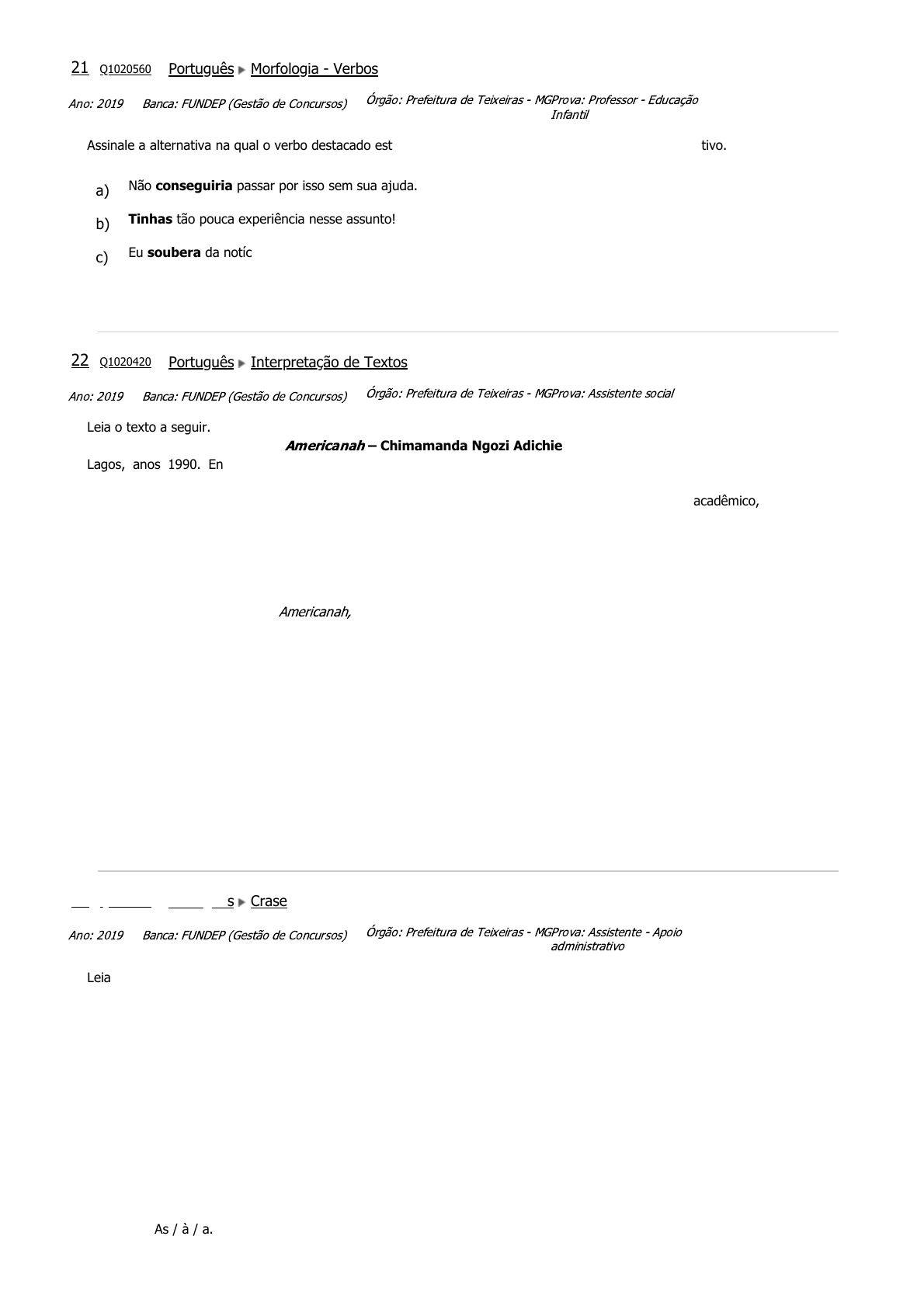 21/09/2019 https://www2.qconcursos.com/questoes/imprimir?ano_publicacao=&area=&assunto=&caderno_id=&cargo=&codigo=&disciplina=1… https://www2.qconcursos.com/questoes/imprimir?ano_publicacao=&area=&assunto=&caderno_id=&cargo=&codigo=&disciplina=1&escolaridad… 1/10 Ano: 2019 Banca: FUNDEP (Gestão de Concursos) Órgão: Prefeitura de Teixeiras - MGProva: Professor - Educação Infantil a) Não conseguiria passar por isso sem sua ajuda. b) Tinhas tão pouca experiência nesse assunto! c) Eu soubera da notícia antes de Letícia me contá-la. d) Gostaria que fôssemos jovens novamente. Ano: 2019 Banca: FUNDEP (Gestão de Concursos) Órgão: Prefeitura de Teixeiras - MGProva: Assistente social a) ficha técnica. b) sinopse. c) resumo. d) artigo crítico. Ano: 2019 Banca: FUNDEP (Gestão de Concursos) Órgão: Prefeitura de Teixeiras - MGProva: Assistente - Apoio administrativo a) às / Às / à / à. b) as / As / a / à. c) as / Às / a / a. d) às / As / à / a. 21 Q1020560 Português Morfologia - Verbos Assinale a alternativa na qual o verbo destacado está conjugado no pretérito mais-que-perfeito do indicativo. 22 Q1020420 Português Interpretação de Textos Leia o texto a seguir. Americanah – Chimamanda Ngozi Adichie Lagos, anos 1990. Enquanto Ifemelu e Obinze vivem o idílio do primeiro amor, a Nigéria enfrenta tempos sombrios sob um governo militar. Em busca de alternativas às universidades nacionais, paralisadas por sucessivas greves, a jovem Ifemelu muda-se para os Estados Unidos. Ao mesmo tempo que se destaca no meio acadêmico, ela depara pela primeira vez com a questão racial e com as agruras da vida de imigrante, mulher e negra. Quinze anos mais tarde, Ifemelu é uma blogueira aclamada nos Estados Unidos, mas o tempo e o sucesso não atenuaram o apego à sua terra natal, tampouco anularam sua ligação com Obinze. Quando ela volta para a Nigéria, terá de encontrar seu lugar num país muito diferente do que deixou e na vida de seu companheiro de adolescência. Principal autora nigeriana de sua geração e uma das mais destacadas da cena literária internacional, Chimamanda Ngozi Adichie, em Americanah, parte de uma história de amor para debater questões prementes e universais como imigração, preconceito racial e desigualdade de gênero. [...] Disponível em: <https://www.companhiadasletras.com.br/detalhe.php?codigo=13525>. Acesso em: 17 jul. 2019 (Adaptação). Quanto a seu gênero, o texto anterior é corretamente classificado como 23 Q1020524 Português Crase Leia o trecho a seguir. Ontem Eduardo acordou ___ 8h30 em ponto. ___ vezes tinha dificuldades para dormir, mas havia tido uma boa noite. Olhou-se no espelho e gostou do que viu, cultivava uma barba ___ Che Guevara. Saiu de casa e foi para o ponto, ___ espera de seu ônibus. Assinale a alternativa que completa correta e respectivamente as lacunas anteriores. BETA 21/09/2019 https://www2.qconcursos.com/questoes/imprimir?ano_publicacao=&area=&assunto=&caderno_id=&cargo=&codigo=&disciplina=1… https://www2.qconcursos.com/questoes/imprimir?ano_publicacao=&area=&assunto=&caderno_id=&cargo=&codigo=&disciplina=1&escolaridad… 2/10 Ano: 2019 Banca: FUNDEP (Gestão de Concursos) Órgão: Prefeitura de Teixeiras - MGProva: Assistente - Apoio administrativo a) “A quantidade de plásticos que vai parar nos oceanos é um problema ambiental mundial, e o canudo é um dos principais itens jogados na costa litorânea, mas a guerra declarada contra um único produto está banalizando o debate e escondendo o principal [...]” b) “O canudo de plástico é o vilão da vez. Em defesa do meio ambiente, alguns restaurantes estão substituindo o objeto por opções duráveis, ou até mesmo retirando-os de circulação.” c) “De todo modo, o uso consciente do canudo e de qualquer plástico é defendido pelos especialistas. ‘Precisamos replicar o comportamento. Se não fixarmos, vira moda, e só voltaremos a nos preocupar com isso até que apareça outra tartaruga que nos choque’ [...]” d) “Segundo o economista Christian Luiz da Silva, professor da Universidade Tecnológica Federal do Paraná (UTFPR), campanhas como a essa contra o canudo são movimentadas por um interesse comercial que tem respaldo na defesa do meio ambiente. Ano: 2019 Banca: FUNDEP (Gestão de Concursos) Órgão: Prefeitura de Teixeiras - MGProva: Assistente - Apoio administrativo a) No entanto / A menos que / como / assim. 24 Q1020517 Português Interpretação de Textos Saiba por que o canudinho, vilão ecológico da vez, não merece a má reputação O canudo de plástico é o vilão da vez. Em defesa do meio ambiente, alguns restaurantes estão substituindo o objeto por opções duráveis, ou até mesmo retirando-os de circulação. No Legislativo, porém, estão surgindo propostas sem meio-termo: querem banir o objeto de cidades inteiras, com sanções a estabelecimentos que desrespeitarem a norma, como em Curitiba e no Rio de Janeiro. Essas iniciativas que começam a se multiplicar no Brasil fazem parte de uma onda global contra o pequeno artefato, que ganhou impulso após as imagens chocantes de uma tartaruga marinha com um canudo preso no nariz, em um vídeo que circula desde 2015. A quantidade de plásticos que vai parar nos oceanos é um problema ambiental mundial, e o canudo é um dos principais itens jogados na costa litorânea, mas a guerra declarada contra um único produto está banalizando o debate e escondendo o principal: o responsável pela poluição não é um objeto e nem o conjunto deles, mas sim o ser humano, que não sabe dar a destinação correta aos seus resíduos. O canudinho é, de fato, desnecessário na maioria dos casos, e por isso sua demonização ganhou terreno tão facilmente. Mas a campanha contra é tão forte que já foi contaminada até por fake news, como as que dizem que o objeto não é fácil de se reciclar e que, mesmo quando ele é corretamente jogado fora, pode ser levado pelo vento, sem dados que emba