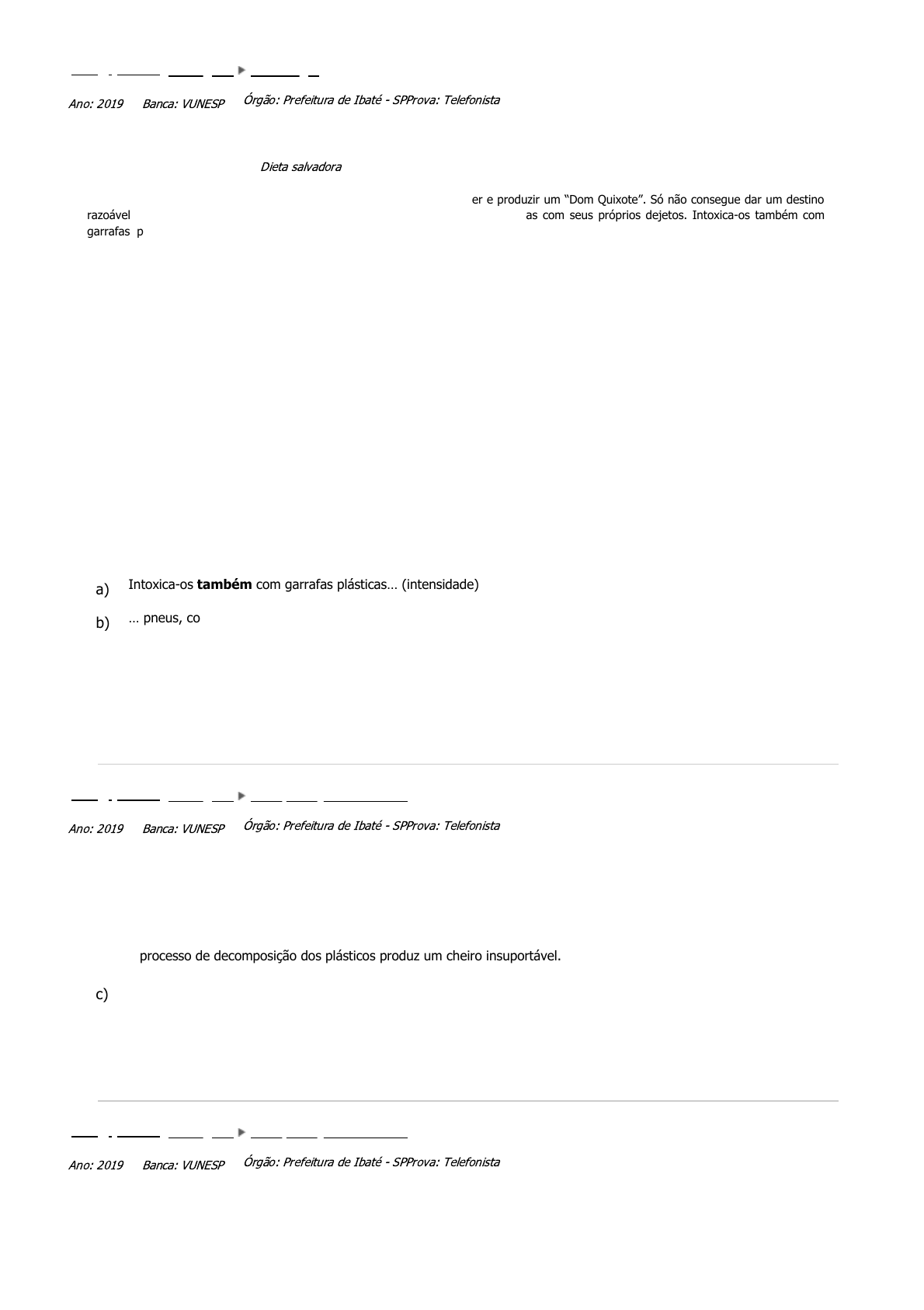 21/09/2019 https://www2.qconcursos.com/questoes/imprimir?ano_publicacao=&area=&assunto=&caderno_id=&cargo=&codigo=&disciplina=1… https://www2.qconcursos.com/questoes/imprimir?ano_publicacao=&area=&assunto=&caderno_id=&cargo=&codigo=&disciplina=1&escolaridade… 1/8 Ano: 2019 Banca: VUNESP Órgão: Prefeitura de Ibaté - SPProva: Telefonista a) Intoxica-os também com garrafas plásticas… (intensidade) b) … pneus, computadores, sofás e até carcaças de automóveis. (dúvida) c) … que se encaminha inevitavelmente para o mar. (modo) d) De repente, uma boa notícia. (afirmação) e) Os cientistas estão agora criando réplicas desses micróbios… (intensidade) Ano: 2019 Banca: VUNESP Órgão: Prefeitura de Ibaté - SPProva: Telefonista a) os micróbios marinhos descobertos têm uma aparência desagradável. b) o processo de decomposição dos plásticos produz um cheiro insuportável. c) os micróbios marinhos têm uma grande capacidade de devorar plásticos. d) é grande a quantidade de lixo descartado inadequadamente nas águas. e) é insignificante a quantidade de plástico que cada micróbio decompõe. Ano: 2019 Banca: VUNESP Órgão: Prefeitura de Ibaté - SPProva: Telefonista 381 Q1012633 Português Morfologia Leia o texto para responder à questão. Dieta salvadora O ser humano revelou-se capaz de dividir o átomo, derrotar o câncer e produzir um “Dom Quixote”. Só não consegue dar um destino razoável ao lixo que produz. E não se contenta em brindar os mares, rios e lagoas com seus próprios dejetos. Intoxica-os também com garrafas plásticas, pneus, computadores, sofás e até carcaças de automóveis. Tudo que perde o uso é atirado num curso d’água, subterrâneo ou a céu aberto, que se encaminha inevitavelmente para o mar. O resultado está nas ilhas de lixo que se formam, da Guanabara ao Pacífico. De repente, uma boa notícia. Cientistas da Grécia, Suíça, Itália, China e dos Emirados Árabes descobriram em duas ilhas gregas um micróbio marinho que se alimenta do carbono contido no plástico jogado ao mar. Parece que, depois de algum tempo ao sol e atacado pelo sal, o plástico, seja mole, como o das sacolas, ou duro, como o das embalagens, fica quebradiço – no ponto para que os micróbios, de guardanapo ao pescoço, o decomponham e façam a festa. Os cientistas estão agora criando réplicas desses micróbios, para que eles ajudem os micróbios nativos a devorar o lixo. Haja estômago. Em “A Guerra das Salamandras”, romance de 1936 do tcheco Karel Čapek, um explorador descobre na costa de Sumatra uma raça de lagartos gigantes, hábeis em colher pérolas e construir diques submarinos. Em troca das pérolas que as salamandras lhe entregam, ele lhes fornece facas para se defenderem dos tubarões. O resto, você adivinhou: as salamandras se reproduzem, tornam-se milhões, ocupam os litorais, aprendem a falar e inundam os continentes. Passam a ser bilhões e tomam o mundo. Não quero dizer que os micróbios comedores de lixo podem se tornar as salamandras de Čapek. É que, no livro, as salamandras aprendem a gerir o mundo melhor do que nós. Com os micróbios no comando, nossos mares, pelo menos, estarão a salvo. (Ruy Castro. https://www1.folha.uol.com.br/colunas/. 31.05.2019. Adaptado) Assinale a alternativa em que o sentido expresso pelo termo ou expressão em destaque está corretamente identificado entre parênteses. 382 Q1012629 Português Interpretação de Textos A frase do final do segundo parágrafo – Haja estômago. – indica que 383 Q1012627 Português Interpretação de Textos Leia a tira para responder à questão. BETA 21/09/2019 https://www2.qconcursos.com/questoes/imprimir?ano_publicacao=&area=&assunto=&caderno_id=&cargo=&codigo=&disciplina=1… https://www2.qconcursos.com/questoes/imprimir?ano_publicacao=&area=&assunto=&caderno_id=&cargo=&codigo=&disciplina=1&escolaridade… 2/8 a) Se você quer informações relativas em promoções… b) Se você quer informações referentes com promoções… c) Se você quer informações a respeito de promoções… d) Se você quer informações em cerca de promoções… e) Se você quer informações que dizem respeito por promoções… Ano: 2019 Banca: VUNESP Órgão: Prefeitura de Ibaté - SPProva: Telefonista a) Embora. b) Contudo. c) Portanto. d) Uma vez que. e) Apesar de que. Ano: 2019 Banca: VUNESP Órgão: Prefeitura de Ibaté - SPProva: Telefonista Com a substituição da expressão em destaque, a reescrita da frase “Se você quer saber sobre promoções…” atende à norma-padrão de regência e permanece com sentido compatível ao do texto original em: 384 Q1012628 Português Morfologia A frase “Agora, se você quer cancelar a sua assinatura…” permanecerá com sentido original preservado se o termo em destaque for substituído por: 385 Q1012626 Português Interpretação de Textos As falas da gravação telefônica ouvidas pela personagem dos quadrinhos permitem afirmar que 21/09/2019 https://www2.qconcursos.com/questoes/imprimir?ano_publicacao=&area=&assunto=&caderno_id=&cargo=&codigo=&disciplina=1… https://www2.qconcursos.com/questoes/imprimir?ano_publicacao=&area=&assunto=&caderno_id=&cargo=&codigo=&disciplina=1&escolaridade… 3/8 a) os pacotes de dados oferecidos pela empresa estão com valor promocional. b) a empresa oferece poucas opções promocionais aos seus clientes. c) fazer um elogio à empresa é uma tarefa que requer tempo e paciência. d) a atividade de telefonista exige profundo conhecimento de matemática. e) o cancelamento de uma assinatura pode ser excessivamente complexo. Ano: 2019 Banca: CONSULPAM Órgão: Prefeitura de Resende - RJProva: Agente comunitário de saúde a) Advérbio. b) Locução. c) Adjetivo. d) Adjunto. Ano: 2019 Banca: CONSULPAM Órgão: Prefeitura de Resende - RJProva: Agente comunitário de saúde a) Se referindo ao tamanho da criança. b) Um pingo de algum líquido escorrendo pela sala. c) Coisa muito pequena espalhada
