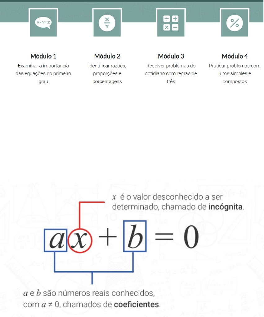 (UFRRJ- 2003) Clarissa é uma típica consumidora de shopping. Seu pai lhe deu uma certa importância em dinheiro para que comprasse algumas coisas. Ao passar por uma sapataria, encantou-se com um tênis e pagou por ele um quinto do que recebeu de seu pai. Em seguida, entrou numa loja de roupas e comprou uma calça, pagando um quarto do que restou. Clarissa ainda ficou com R$120,00. Qual foi a quantia que ela recebeu de seu pai? É importante destacar que existem outros tipos de equações do primeiro grau com várias incógnitas, porém, neste tema, abordaremos somente as equações do primeiro grau com uma incógnita apenas, como a equação acima. Preço do tênis x/5 Qto dinheiro ficou após comprar o tênis? Primeiro vms tirar qto ela gastou X – X/5 Efetuar uma com de frações, coloca-se todos sobre o mesmo denominador 5x/5 - x/5= 4x/5 Agora vms ver qto ela gastou na segunda loja: Preço da calça= Vrestante/4 Qual o valor restante? É o 4x/5 Agora simplifica a fração Esse é o preço da calça que a Clarice comprou X/5 Agora temos quanto ela gastou na primeira e na segunda Então depois de comprar seu tênis e sua calça ela ficou com Sabemos que esse valor é R$ 120 Agora faz a multiplicação cruzada O valor que ela começou o seu dia foi R$ 200 Em uma corrida de táxi, é comum pagarmos uma taxa fixa (chamada bandeirada) mais um valor variável que depende da distância percorrida. Se a bandeirada é de R$4,20 e o quilômetro rodado custa R$0,95, qual é distância percorrida por um passageiro que pagou R$21,30? Vamos denotar por “X” a quantidade de quilômetros rodados. Como a bandeirada (R$4,20) é fixa e pagamos R$0,95 por quilômetro rodado, então, se o passageiro pagou R$21,30 pela corrida, a equação do primeiro grau que representa essa situação é: Logo, a distância percorrida pelo passageiro foi de 18km. Na verdade, a situação também poderia ser resolvida com um raciocínio puramente aritmético. Subtraindo a bandeirada do total da corrida, obtemos 21,30 – 4,20 = 17,10. Dividindo este valor pelo custo do quilômetro rodado, obtemos 17,10/0,95 = 18 km. Observe que os cálculos efetuados correspondem aos passos de resolução da equação acima. A vantagem de formular o problema como uma equação do primeiro grau é ter um processo mais automático de resolução. (Adaptado de UNIRIO– 2016) Um grupo de amigos vai acampar no final de semana. Numa certa hora da manhã de domingo, o equivalente a um terço desse grupo está envolvido com o preparo do almoço, a metade do grupo cuida da limpeza do acampamento, a décima parte desses dois subgrupos colhe flores na redondeza e a única pessoa restante do grupo deleita-se lendo um bom livro. Quantos elementos tem esse grupo de amigos? Atenção: A imagem abaixo é meramente ilustrativa, não leve em consideração a quantidade de personagens presentes na cena para a resolução da atividade. Vamos denotar por x a quantidade de amigos nesse grupo. Pelas informações do exercício, temos a seguinte divisão do grupo: 1/3 almoço ½ limpeza A+B/10 flores Resta 1 1. (Adaptada de PETROBRÁS – 2010) Laura disse para a sua filha Ana: Daqui a 2 anos, terei o dobro da sua idade. Se hoje Ana tem 20 anos, qual é a idade atual de Laura Parte superior do formulário a) 40 b) 42 c) 44 d) 46 Parte inferior do formulário Responder 2. (CEFET/MG– 2018) Numa família com 7 filhos, sou o caçula e 14 anos mais novo que o primogênito de minha mãe. Dentre os filhos, o quarto tem a terça parte da idade do irmão mais velho, acrescida de 7 anos. Se a soma de nossas três idades é 42, então minha idade é um número: a) Divisível por 5. b) Divisível por 3. c) Primo. d) P Parabéns! A alternativa C está correta. Como temos três dos sete filhos envolvidos no problema, vamos chamar o caçula de Filho 7, o primogênito de Filho 1 e o quarto filho de Filho 4. Com os dados do enunciado, podemos formar as seguintes informações: · Vamos denotar por x a idade do irmão caçula, ou seja, a idade do Filho 7 é x; · Como o primogênito (Filho 1) possui 14 anos a mais que o caçula, então a idade do Filho 1 é igual a x + 14; · Agora, o Filho 4 tem a terça parte da idade do Filho 1, acrescida de 7 anos, ou seja, a idade do Filho 4 é: 13x+14+7=x+143+7 · Como a soma dessas três idades é 42, temos a seguinte equação: x+x+14+x+143+7=42 E multiplicando essa igualdade por 3, obtemos que: 3x+3x+42+x+14+21=126 7x+77=126 7x=126-77 7x=49 x=7 Logo, a idade do caçula é 7 anos, que é um número primo. INTRODUÇÃO Conforme comentado no módulo anterior, diversas situações do cotidiano envolvem tópicos da Matemática de maneira implícita, mas que podem ser resolvidos rapidamente após uma análise e interpretação do problema. Neste módulo, abordaremos especificamente os conceitos de razões, proporções e porcentagem, juntamente com algumas das suas aplicações. Veremos que, em diversos contextos, esses conceitos nos fornecem informações que podem auxiliar, por exemplo, no planejamento de um transporte de cargas ou para se ter uma comparação sobre o aproveitamento escolar de uma turma. Por exemplo, considere a seguinte situação:
