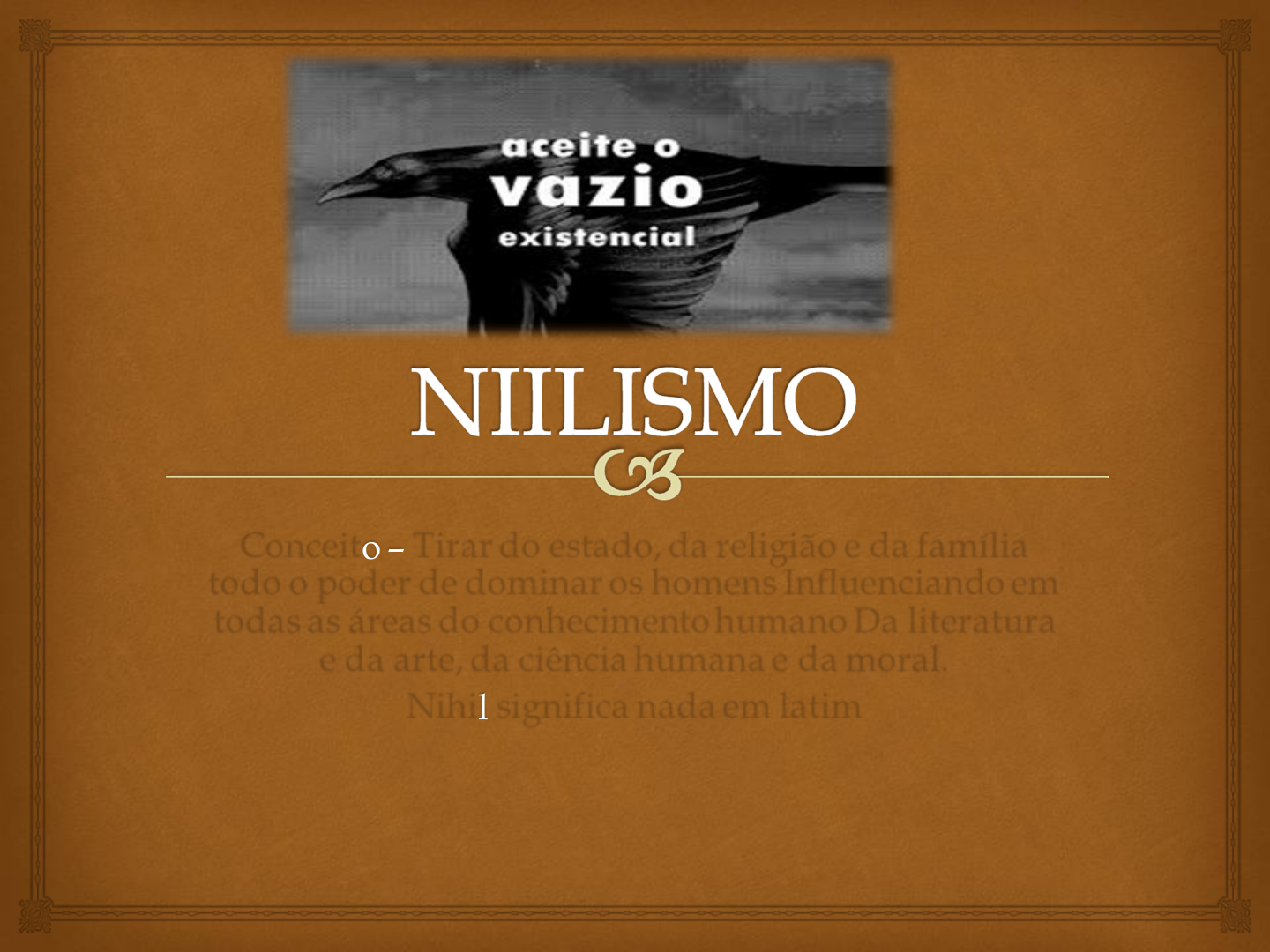 Conceito – Tirar do estado, da religião e da família todo o poder de dominar os homens Influenciando em todas as áreas do conhecimento humano Da literatura e da arte, da ciência humana e da moral. Nihil significa nada em latim ORIGEM Contexto Histórico Revolução Francesa Feuerbach, Darwin, Nietzsche, Henry Buckle e Herbert Spencer. Em 1799 foi dita pela primeira vez filósofo alemão Friedrich Heinrich Jacobi e Jean Paul O conceito foi mais abordado por Nietzsche Nasceu no século XIX, na Rússia governada pelos czares. Objetivo Libertar as pessoas contra suas tradições e preconceitos; Contra opressão política, religiosa. Arthur Schopenhauer (1788 – 1860) Friedrich Nietzsche (1844 – 1900) Martin Heidegger (1889 – 1976) Principais Filósofos Niilista Filósofos Niilista Arthur Schopenhauer Martin Heidgger Friedrich Nietzsche Propõe “ausência de sentido” atrelado ao conceito de “super- homem”. Surgem a partir da “morte de Deus” – ausência de qualquer princípio. O Niilismo não é o fim, mas um caminho onde o sentido da vida é feito pelos seres humanos e não por alguma entidade divina. Os valores são focados na vida que se tem. Ideias do Niilismo pelo Friedrich Nietzsche Principais frases Tipos de Niilismo Negativo: Negação do mundo real por um mundo superior extramundano; segue regras para viver aquilo que seria a realidade verdadeira, o paraíso. Por exemplo: ajudar os necessitados por acreditar que isso garantirá sua vida no paraíso, e não pela bondade do coração. Reativo: Reação em relação ao mundo imperfeito; envolve a morte de Deus, ausência da vida extra mundana, obrigando o homem a observar um novo mundo no futuro, não fora desse mundo. Tipos de Niilismo Passivo Ocorre a evolução humana, entretanto, não há mudanças de valores. Envolve a morte de Deus e do sentido do mundo, ou seja, a impossibilitado de um mundo ideal. É como um convite ao suicídio, pois só existe o presente. Ativo A evolução humana acontece da mesma maneira, contudo, ele é responsável pela transmutação dos valores, bem como a criação de novos O mundo é visto como um palco para a vida se expandir, onde cada indivíduo é responsável pelos seus valores. Medo e Delírio em Las Vegas ( Terry Gilliam, 1998) onde todo sonho americano termina em drogas e nada. Psicopata Americano( Mary Harron, 2.000) personagem materialista e invejoso. Ponto Final (Match Point, Woody Allen, 2.005) mostra como o mal pode subverter a justiça. Laranja Mecânica ( Stanley Kubrick, 1.971) clássico icônico, centrado na "ultra-violencia", provocada por gangue. Dogville(Lars Von Trier, 2.003) traços anti-sociais, retratando que o mundo que os rodeia é um vazio cruel e injusto. “Vidas ao Vento” (Studio Ghibli, 2013),Conceitos éticos e morais que a construção de um caça mais potente poderia trazer para o mal, Jiro não consegue enxergar isso, apenas suas obsessões. O cinema é um excelente método para expressar a filosofia Niilista pois, eticamente falando, é a expressão de um puro vazio. A desilusão de não encontrar aquilo que se busca seria o causador do Niilismo. No cristianismo – não há sentido no que se pregava e no sentido que se dava para a vida. Na moral – não existe o bem ou o mal A verdade – para Nietzsche não existe o sentido dela. Abrange as maiores esferas mundiais, tais como: Literatura; Arte; Ciências humanas; Teorias sociais: Ética e moral. Niilismo no tempo atual O que eu narro é a história dos próximos dois séculos […] descrevo aquilo que vem: a ascensão do niilismo. Posso descrevê-lo porque aqui se passa algo necessário – os sinais disso estão por toda parte; faltam apenas os olhos para tais sinais. Aqui, não louvo, nem censuro, que ela venha; creio numa das maiores crises, num instante da mais profunda autorreflexão do homem” – Nietzsche, Fragmentos Póstumos 1887 O que significa Niilismo? Que os valores supremos se desvalorizam” – Nietzsche, Fragmentos Póstumos 1887 Pensamento “De certa maneira, o que antes era uma vinculação social e política, preocupada com o coletivo, hoje está mais ligada à uma preocupação com o pessoal, uma maximização dos prazeres individuais e o rompimento de laços sociais. Nesse caso, de fato, os jovens acabam encantados por essa condição de pós-modernidade do niilismo e buscam, através dessas práticas, essa inserção. Me parece que, ao invés dos jovens buscarem essa prática, é ela que condiciona a vida da juventude nos tempos atuais” Nos dias atuais existe também a busca pela aceitação em grupos sociais, a vontade de se destacar . Porém, de acordo com o mestre em Ciências Sociais, Frederico Tomé, esse cenário, hoje, mudou de motivações. Perca da Fé - Falta de Valores ( incluindo Familiares ) Sem Sentido para a vida - Busca Incessante pelo sentido da Vida Ansiedade - Depressão - Insatisfação Busca da Satisfação Momentânea Individualismo Incertezas – Duvidas permanentes Perca da Moral Influência do Niilismo nos dias atuais Nietzsche previu a sociedade que teríamos hoje pois, dizia que o homem não se deixaria levar por valores religiosos, que cada dia mais a sociedade seria mais individualista e que muitos teriam suas respostas na ciência. O niilismo seria fora dos padrões da sociedade dos filósofos, a ovelha negra pois, os filósofos tentam explicar o sentido da vida e no niilismo podemos perceber o oposto , existe um pensamento que diz não haver sentido das coisas e na vida , cada um molda sua vida com sua maneira e como achar correto. Niilismo, o nada, começa e termina no mesmo lugar, sem significado ou sentido. Há também um questionamento sobre os valores, crenças a moral sobre a sociedade , tudo é nada, vivem uma vida sem regras , livres . Este pensamento pode levar a pensarmos que tudo pode, que tudo é permitido, visto que não há o certo e errado , o bem e o mal , com isto muitos podem viver em uma crise existencial, incer