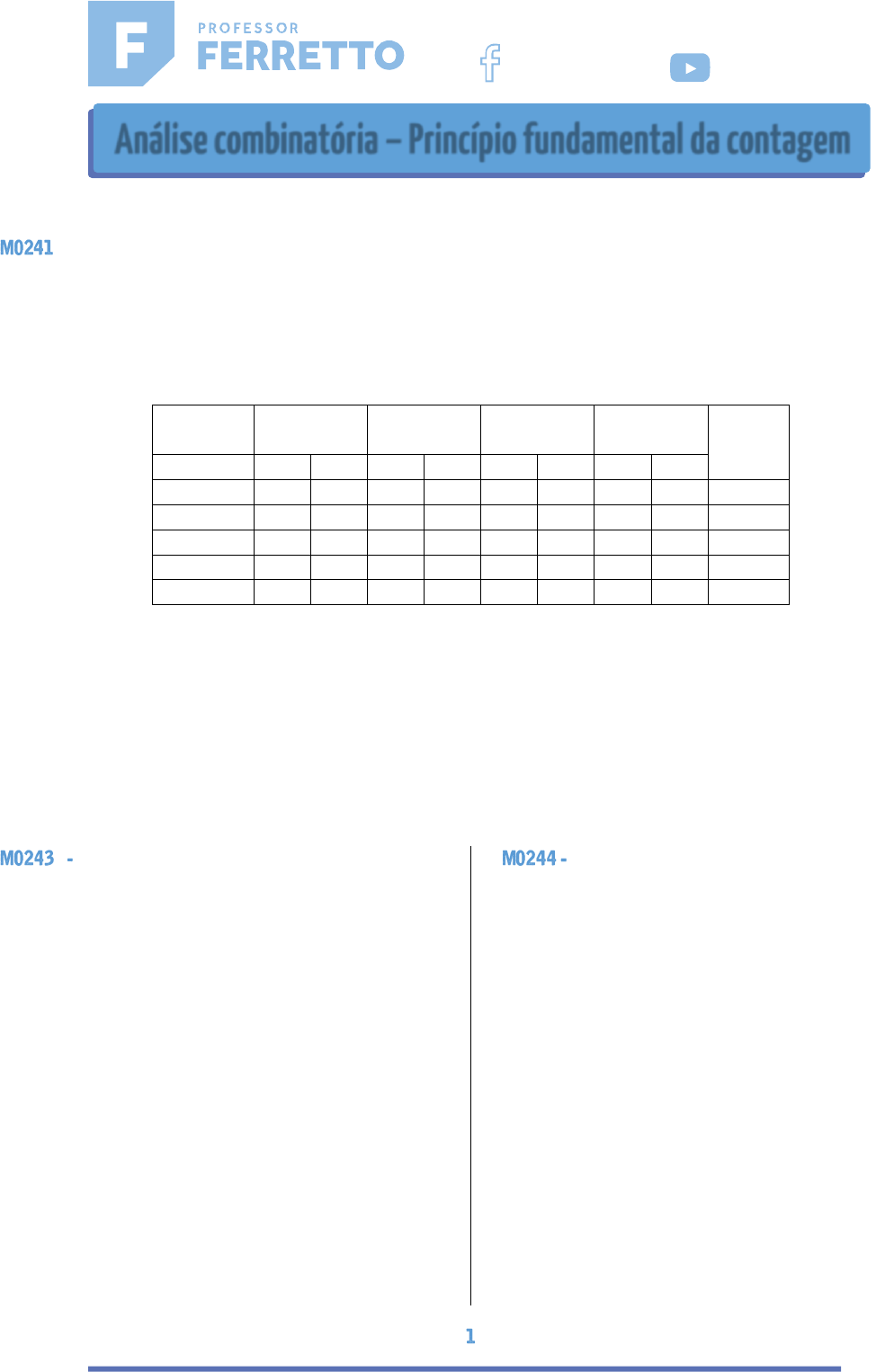 – (Enem) Numa cidade, cinco escolas de samba (I, II, III, IV e V) participaram do desfile de Carnaval. Quatro quesitos são julgados, cada um por dois jurados, que podem atribuir somente uma dentre as notas 6, 7, 8, 9 ou 10. A campeã será a escola que obtiver mais pontuação na soma de todas as notas emitidas. Em caso de empate, a campeã será a que alcançar a maior soma das notas atribuídas pelos jurados no quesito Enredo e Harmonia. A tabela mostra as notas do desfile desse ano no momento em que faltava somente a divulgação das notas do jurado B no quesito Bateria. Quesitos 1. Fantasia e Alegoria 2. Evolução e Conjunto 3. Enredo e Harmonia 4. Bateria Total Jurado A B A B A B A B Escola I 6 7 8 8 9 9 8 55 Escola II 9 8 10 9 10 10 10 66 Escola III 8 8 7 8 6 7 6 50 Escola IV 9 10 10 10 9 10 10 68 Escola V 8 7 9 8 6 8 8 54 Quantas configurações distintas das notas a serem atribuídas pelo jurado B no quesito Bateria tornariam campeã a Escola II? a) 21 b) 90 c) 750 d) 1250 e) 3125 (Enem) Um procedimento padrão para aumentar a capacidade do número de senhas de banco é acrescentar mais caracteres a essa senha. Essa prática, além de aumentar as possibilidades de senha, gera um aumento na segurança. Deseja-se colocar dois novos caracteres na senha de um banco, um no início e outro no final. Decidiu-se que esses novos caracteres devem ser vogais e o sistema conseguirá diferenciar maiúsculas de minúsculas. Com essa prática, o número de senhas possíveis ficará multiplicado por a) 100 b) 90 c) 80 d) 25 e) 20 (Enem) Um banco solicitou aos seus clientes a criação de uma senha pessoal de seis dígitos, formada somente por algarismos de 0 a 9, para acesso à conta corrente pela internet. Entretanto, um especialista em sistemas de segurança eletrônica recomendou à direção do banco recadastrar seus usuários, solicitando, para cada um deles, a criação de uma nova senha com seis dígitos, permitindo agora o uso das 26 letras do alfabeto, além dos algarismos de 0 a 9. Nesse novo sistema, cada letra maiúscula era considerada distinta de sua versão minúscula. Além disso, era proibido o uso de outros tipos de caracteres. Uma forma de avaliar uma alteração no sistema de senhas é a verificação do coeficiente de melhora, que é a razão do novo número de possibilidades de senhas em relação ao antigo. www.professorferretto.com.br ProfessorFerretto ProfessorFerretto Análise combinatória – Princípio fundamental da contagem http://www.professorferretto.com.br O coeficiente de melhora da alteração recomendada é a) 626 106 b) 62! 10! c) 62! 4! 10!56! d) 62! − 10! e) 626 − 106 (Enem) Um artesão de joias tem a sua disposição pedras brasileiras de três cores: vermelhas, azuis e verdes. Ele pretende produzir joias constituídas por uma liga metálica, a partir de um molde no formato de um losango não quadrado com pedras nos seus vértices, de modo que dois vértices consecutivos tenham sempre pedras de cores diferentes. A figura ilustra uma joia, produzida por esse artesão, cujos vértices A, B, C e D correspondem às posições ocupadas pelas pedras. Com base nas informações fornecidas, quantas joias diferentes, nesse formato, o artesão poderá obter? a) 6 b) 12 c) 18 d) 24 e) 36 (Enem) O designer português Miguel Neiva criou um sistema de símbolos que permite que pessoas daltônicas identifiquem cores. O sistema consiste na utilização de símbolos que identificam as cores primárias (azul, amarelo e vermelho). Além disso, a justaposição de dois desses símbolos permite identificar cores secundárias (como o verde, que é o amarelo combinado com o azul). O preto e o branco são identificados por pequenos quadrados: o que simboliza o preto é cheio, enquanto o que simboliza o branco é vazio. Os símbolos que representam preto e branco também podem ser associados aos símbolos que identificam cores, significando se estas são claras ou escuras. Folha de São Paulo. Disponível em: www1.folha.uol.com.br. Acesso em: 18 fev. 2012. (adaptado) De acordo com o texto, quantas cores podem ser representadas pelo sistema proposto? a) 14 b) 18 c) 20 d) 21 e) 23 (Unesp) As urnas 1, 2 e 3 contêm, respectivamente, apenas as letras das palavras OURO, PRATA e BRONZE. Uma a uma são retiradas letras dessas urnas, ordenadamente e de forma cíclica, ou seja, a primeira letra retirada é da urna 1, a segunda é da urna 2, a terceira é da urna 3, a quarta volta a ser da urna 1, a quinta volta a ser da urna 2, e assim sucessivamente. O número mínimo de letras retiradas das urnas dessa maneira até que seja possível formar, com elas, a palavra PRAZER é igual a a) 8 b) 6 c) 10 d) 9 e) 7 (Fuvest) Maria deve criar uma senha de 4 dígitos para sua conta bancária. Nessa senha, somente os algarismos 1,2,3,4,5 podem ser usados e um mesmo algarismo pode aparecer mais de uma vez. Contudo, supersticiosa, Maria não quer que sua senha contenha o número 13, isto é, o algarismo 1 seguido imediatamente pelo algarismo 3. De quantas maneiras distintas Maria pode escolher sua senha? a) 551 b) 552 c) 553 d) 554 e) 555 (Unesp) Dois rapazes e duas moças irão viajar de ônibus, ocupando as poltronas de números 1 a 4, com 1 e 2 juntas e 3 e 4 juntas, conforme o esquema. O número de maneiras de ocupação dessas quatro poltronas, garantindo que, em duas poltronas juntas, ao lado de uma moça sempre viaje um rapaz, é a) 4. b) 6. c) 8. d) 12. e) 16. (Uepa) Um jovem descobriu que o aplicativo de seu celular edita fotos, possibilitando diversas formas de composição, dentre elas, aplicar texturas, aplicar molduras e mudar a cor da foto. Considerando que esse aplicativo dispõe de 5 modelos de texturas, 6 tipos de molduras e 4 possibilidades de mudar a cor da foto, o número de maneiras que esse jovem pode fazer uma composição com 4 fotos distintas, utilizando apenas os recursos citados, para publicá-las nas redes sociais, conforme ilustração abaixo, é: a) 24 × 1204 b) 12