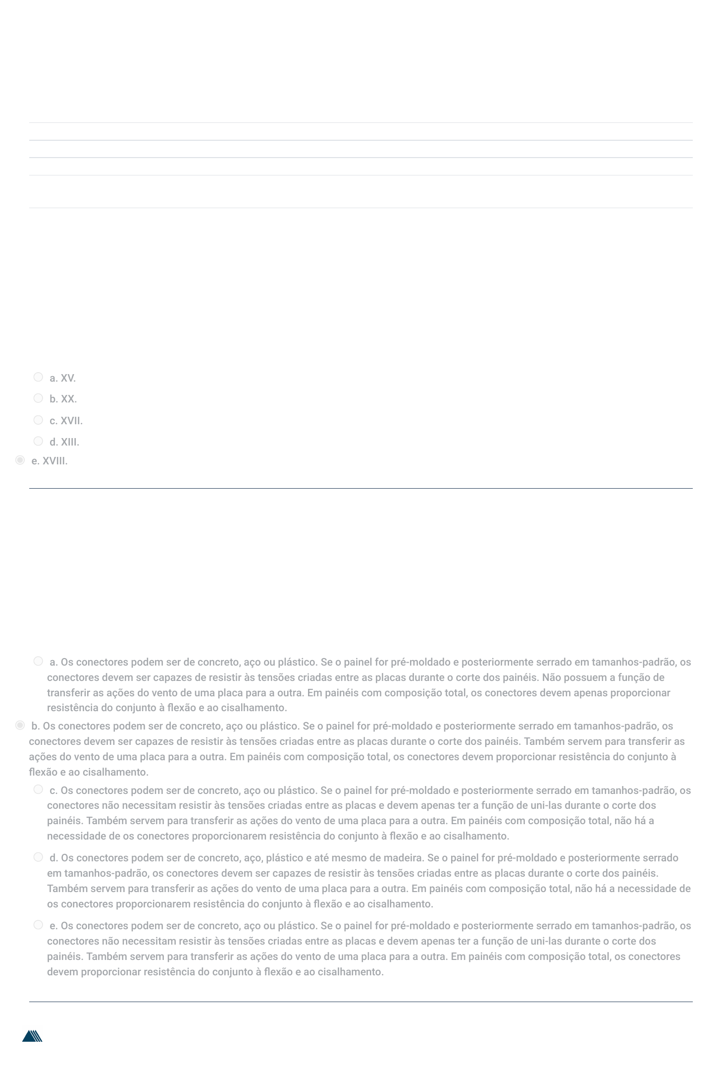 Página inicial / Meus Cursos / ENIAC_20202E_1258 / Materiais de Estudo / Unidade 4 - Exercícios de �xação Iniciado em quarta, 16 set 2020, 09:26 Estado Finalizada Concluída em quarta, 16 set 2020, 09:45 Tempo empregado 18 minutos 39 segundos Avaliar 10,00 de um máximo de 10,00(100%) Questão 1 Correto Atingiu 1,00 de 1,00 Questão 2 Correto Atingiu 1,00 de 1,00 Em que século o ferro fundido começou a ser utilizado na construção? Escolha uma: a. XV. b. XX. c. XVII. d. XIII. e. XVIII. Nos painéis sanduíche, as placas de argamassa ou de concreto podem ser ligadas por conectores de diversos tipos. Quais são as funções desses conectores? Escolha uma: a. Os conectores podem ser de concreto, aço ou plástico. Se o painel for pré-moldado e posteriormente serrado em tamanhos-padrão, os conectores devem ser capazes de resistir às tensões criadas entre as placas durante o corte dos painéis. Não possuem a função de transferir as ações do vento de uma placa para a outra. Em painéis com composição total, os conectores devem apenas proporcionar resistência do conjunto à �exão e ao cisalhamento. b. Os conectores podem ser de concreto, aço ou plástico. Se o painel for pré-moldado e posteriormente serrado em tamanhos-padrão, os conectores devem ser capazes de resistir às tensões criadas entre as placas durante o corte dos painéis. Também servem para transferir as ações do vento de uma placa para a outra. Em painéis com composição total, os conectores devem proporcionar resistência do conjunto à �exão e ao cisalhamento. c. Os conectores podem ser de concreto, aço ou plástico. Se o painel for pré-moldado e posteriormente serrado em tamanhos-padrão, os conectores não necessitam resistir às tensões criadas entre as placas e devem apenas ter a função de uni-las durante o corte dos painéis. Também servem para transferir as ações do vento de uma placa para a outra. Em painéis com composição total, não há a necessidade de os conectores proporcionarem resistência do conjunto à �exão e ao cisalhamento. d. Os conectores podem ser de concreto, aço, plástico e até mesmo de madeira. Se o painel for pré-moldado e posteriormente serrado em tamanhos-padrão, os conectores devem ser capazes de resistir às tensões criadas entre as placas durante o corte dos painéis. Também servem para transferir as ações do vento de uma placa para a outra. Em painéis com composição total, não há a necessidade de os conectores proporcionarem resistência do conjunto à �exão e ao cisalhamento. e. Os conectores podem ser de concreto, aço ou plástico. Se o painel for pré-moldado e posteriormente serrado em tamanhos-padrão, os conectores não necessitam resistir às tensões criadas entre as placas e devem apenas ter a função de uni-las durante o corte dos painéis. Também servem para transferir as ações do vento de uma placa para a outra. Em painéis com composição total, os conectores devem proporcionar resistência do conjunto à �exão e ao cisalhamento. https://portalacademico.eniac.edu.br/ https://portalacademico.eniac.edu.br/course/view.php?id=6781 https://portalacademico.eniac.edu.br/course/view.php?id=6781#section-1 https://portalacademico.eniac.edu.br/mod/quiz/view.php?id=164868 https://atendimento.eniac.edu.br/ Questão 3 Correto Atingiu 1,00 de 1,00 Questão 4 Correto Atingiu 1,00 de 1,00 Questão 5 Correto Atingiu 1,00 de 1,00 Por que o aço se tornou um material tão utilizado no Brasil na última década? Escolha uma: a. Por ser resistente à corrosão atmosférica, o que é muito útil para um país tão grande quanto o Brasil, em que estamos sujeitos a diversas pressões atmosféricas. b. O único motivo pelo qual o aço se tornou um material tão expressivo na construção nacional é pela in�uência internacional a qual estamos sujeitos. c. Por ser um metal nobre d. Por ser resistente à corrosão atmosférica e porque se revelou como um material que possibilita muitas soluções construtivas. e. Por ser um material barato. Basicamente, o processo tilt up consiste na técnica de produzir elementos em concreto armado na posição horizontal e posteriormente içá-los para a posição vertical de�nitiva. As principais vantagens desse sistema são: Escolha uma: a. Rapidez quando autoportantes, pela ausência de vigas e pilares e pelas fundações simpli�cadas; segurança, por serem moldados no nível do piso, eliminando formas verticais; e conforto térmico e acústico. b. Rapidez quando autoportantes, pela ausência de vigas e pilares e pelas fundações simpli�cadas; segurança, por serem moldados no nível do piso, eliminando formas verticais; e ausência de conforto térmico e acústico. c. Lentidão, pela presença de vigas e pilares e pelas fundações de difícil dimensionamento; segurança, por serem moldados no nível do piso, eliminando formas verticais; e conforto térmico e acústico. d. Rapidez quando autoportantes, pela ausência de vigas e pilares e pelas fundações simpli�cadas; segurança, por serem moldados verticalmente, eliminando formas horizontais; e conforto térmico e acústico. e. Lentidão, pela presença de vigas e pilares e pelas fundações simpli�cadas; segurança, por serem moldados no nível do piso, acrescentando formas verticais; e conforto térmico e acústico. O campo de aplicação das técnicas da pré-moldagem é amplo e, no âmbito da construção civil, abrange edi�cações, construções pesadas e diversas outras obras civis. Esse processo construtivo pode tirar proveito das seguintes características: Escolha uma: a. Havendo produção em série, não existe a possibilidade de grande reutilização das fôrmas; aumento da qualidade dos elementos por meio do controle constante na fabricação; e aumento de materiais empregados, levando à diminuição do peso total do edifício. b. Havendo produção em série, existe a possibilidade de grande reutilização das fôr