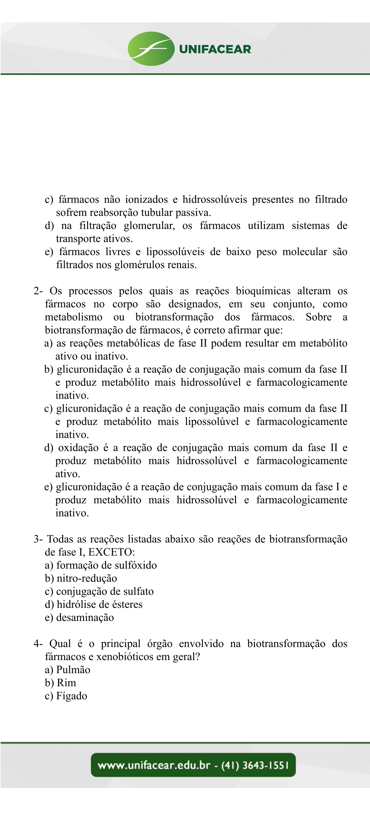 FARMACOLOGIA Farmacocinética III – Metabolização e excreção 1- A eliminação do fármaco do organismo ocorre pela eliminação na urina. Com relação aos processos de excreção renal, é correto afirmar que: a) fármacos livres e hidrossolúveis de baixo peso molecular são filtrados nos glomérulos renais. b) fármacos ionizados e lipossolúveis são excretados na urina. c) fármacos não ionizados e hidrossolúveis presentes no filtrado sofrem reabsorção tubular passiva. d) na filtração glomerular, os fármacos utilizam sistemas de transporte ativos. e) fármacos livres e lipossolúveis de baixo peso molecular são filtrados nos glomérulos renais. 2- Os processos pelos quais as reações bioquímicas alteram os fármacos no corpo são designados, em seu conjunto, como metabolismo ou biotransformação dos fármacos. Sobre a biotransformação de fármacos, é correto afirmar que: a) as reações metabólicas de fase II podem resultar em metabólito ativo ou inativo. b) glicuronidação é a reação de conjugação mais comum da fase II e produz metabólito mais hidrossolúvel e farmacologicamente inativo. c) glicuronidação é a reação de conjugação mais comum da fase II e produz metabólito mais lipossolúvel e farmacologicamente inativo. d) oxidação é a reação de conjugação mais comum da fase II e produz metabólito mais hidrossolúvel e farmacologicamente ativo. e) glicuronidação é a reação de conjugação mais comum da fase I e produz metabólito mais hidrossolúvel e farmacologicamente inativo. 3- Todas as reações listadas abaixo são reações de biotransformação de fase I, EXCETO: a) formação de sulfóxido b) nitro-redução c) conjugação de sulfato d) hidrólise de ésteres e) desaminação 4- Qual é o principal órgão envolvido na biotransformação dos fármacos e xenobióticos em geral? a) Pulmão b) Rim c) Fígado d) Coração e) Intestino delgado 07/09/2020 15:17 Página 1 de 1