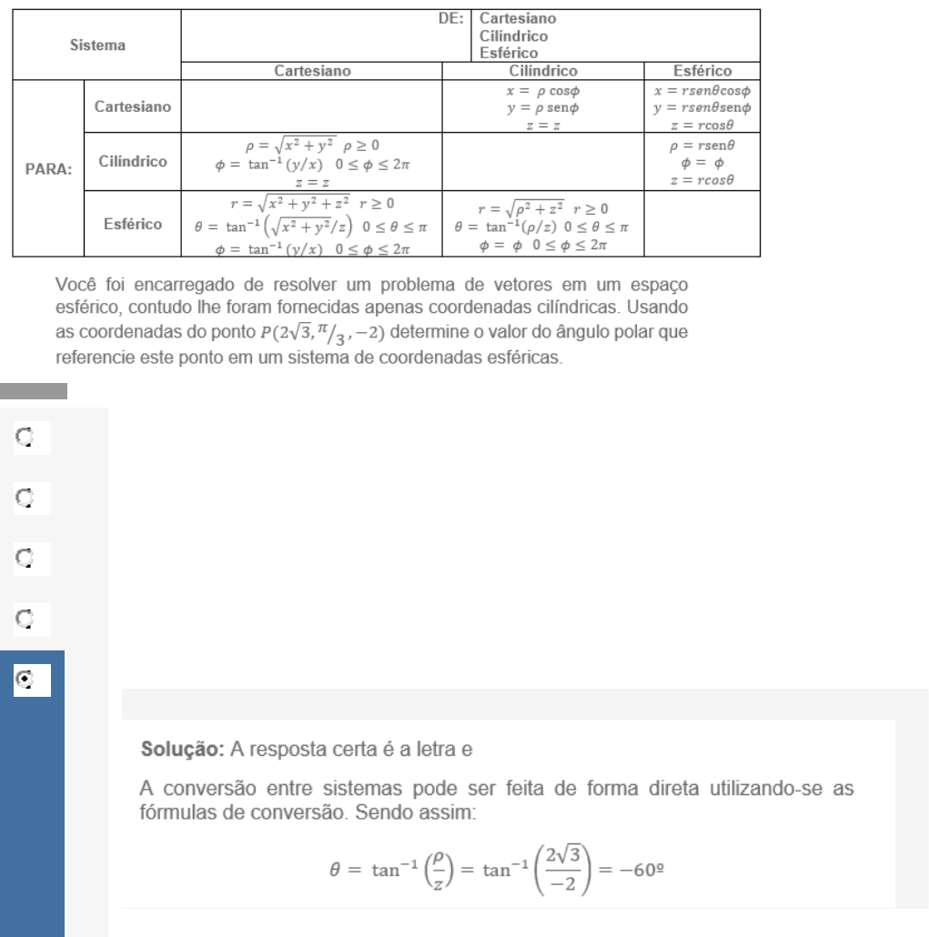 Questão 1/10 - Eletromagnetismo Se você desejar poderá criar seu próprio sistema de coordenadas para resolver problemas de distribuição de grandezas vetoriais. Ainda que eventualmente esta solução seja necessária, na maior parte das vezes, tudo que teremos que fazer será adequar nosso problema a um dos sistemas que existe, sabendo que as conversões entre sistemas mais comuns estão disponíveis na Tabela a seguir: Nota: 10.0 A -40º B -45º C -50º D -55º E -60º Você acertou! Questão 2/10 - Eletromagnetismo Leia o texto a seguir: “Nuvens, relâmpagos e trovões talvez estejam entre os primeiros fenômenos naturais observados pelos humanos pré-históricos. [...]. A teoria precipitativa é capaz de explicar convenientemente os aspectos básicos da eletrificação das nuvens, por meio de dois processos [...]. No primeiro deles, a existência do campo elétrico atmosférico dirigido para baixo [...] Os relâmpagos são descargas de curta duração, com correntes elétricas intensas, que se propagam por distâncias da ordem de quilômetros [...].” (FERNANDES, W. A.; PINTO Jr. O.; PINTO, I. R. C. A. Eletricidade e poluição no ar. Ciência Hoje. v. 42, n. 252. set. 2008. p. 18.) Revistas de divulgação científica ajudam a população, de um modo geral, a se aproximar dos conhecimentos da Física. No entanto, muitas vezes alguns conceitos básicos precisam ser compreendidos para o entendimento das informações. Nesse texto, estão explicitados dois importantes conceitos elementares para a compreensão das informações dadas: o de campo elétrico e o de corrente elétrica (UEL-2009). Assinale a alternativa que corretamente conceitua campo elétrico. Nota: 10.0 A O campo elétrico é uma grandeza vetorial definida como a razão entre a força elétrica e a carga elétrica. Você acertou! o campo elétrico é uma grandeza vetorial e é definido por: E=FpQpE=FpQp Livro: Engenharia Eletromagnética de Willian H. Hayt, capítulo 2. B As linhas de força do campo elétrico convergem para a carga positiva e divergem da carga negativa. A opção B está errada por que as linhas de força do campo elétrico convergem para a carga negativa; C O campo elétrico é uma grandeza escalar definida como a razão entre a força elétrica e a carga elétrica. A opção C está errada por que o campo elétrico não é escalar. Ele depende de magnitude, ou módulo, direção e sentido. D Como as linhas de força convergem para a carga positiva, a intensidade de campo elétrico em um ponto será função apenas da distribuição destas cargas. A opção D está errada por que as linhas de força divergem da carga positiva e por que, em qualquer ponto do espaço, a intensidade do campo elétrico é função da distribuição tanto das cargas positivas quanto das cargas negativas E O sentido do campo elétrico independe do sinal da carga Q, geradora do campo. A opção E está errada por que o sentido do campo é elétrico depende do sinal da carga e foi arbitrado como tendo origem nas cargas positivas e destino nas cargas negativas. O campo elétrico diverge das cargas positivas e converge para as negativas. Questão 3/10 - Eletromagnetismo Como trabalharemos com grandes quantidades de carga atravessando áreas específicas, vamos introduzir a noção, de densidade de corrente. Para isso, usando a definição de densidade, vamos dividir um elemento infinitesimal de corrente por um elemento infinitesimal de área, esta definição permite o cálculo da densidade de corrente em qualquer espaço independente da sua forma. Nota: 10.0 A 3 mA B 4 mA Você acertou! C 5 mA D -4 mA E -8 mA Questão 4/10 - Eletromagnetismo A tensão, ou diferença de potencial é uma das grandezas mais importantes da engenharia elétrica. Representa a energia necessária para deslocar uma determinada carga entre dois pontos distintos e está relacionada tanto com o campo elétrico quanto com o diferencial de percurso. Contudo, não têm relação direta com o percurso já que o campo elétrico e conservativo. Nota: 10.0 A 9 V B 10 V Você acertou! C 21 V D 8 V E 1,3 V Questão 5/10 - Eletromagnetismo A algebra vetorial é muito útil na disciplina de eletromagnetismo. Não é raro você ter que projetar uma força sobre um percurso fechado ou sobre outra força. Para tal recorremos aos métodos que estudamos em algebra vetorial. Nota: 10.0 A B C D Você acertou! E Questão 6/10 - Eletromagnetismo O sistema de coordenadas cartesianas é, provavelmente, o mais popular sistema de coordenada. Esta popularidade deve-se, em parte, ao uso deste sistema para descrever o mundo em que vivemos. Afinal, a maior parte de nossas casas e apartamentos está definida em uma planta que atende precisamente este sistema de coordenadas. Para a definição de vetores no sistema de coordenadas cartesiano precisamos usar componentes vetorias. Com relação aos componentes vetoriais em um sistema de coordenadas cartesiano podemos afirmar, de forma correta, que: Nota: 10.0 A O componente vetorial sobre o eixo é resultado de uma operação algébrica entre os componentes vetoriais sobre os eixos y e z e não tem relação com a magnitude do vetor; B O uso de componentes vetoriais torna possível definir um conjunto de vetores em termos de vetores unitários. Você acertou! os vetores unitários são representados por um vetor que tem a mesma direção e sentido de um conjunto infinito de vetores e magnitude um. O vetor unitário é apenas um vetor dividido pela raiz quadrada da soma dos quadrados dos seus componentes vetoriais. Livro: Engenharia Eletromagnética de Willian H. Hayt, capítulo 1. C O componente vetorial sobre o eixo é resultado de uma operação algébrica entre os componentes vetoriais sobre os eixos x e z e não tem relação com a magnitude do vetor; D O componente vetorial sobre o eixo é resultado de uma operação algébrica entre os componentes vetoriais sobre os eixos x e y e não tem relação com a magnitude do vetor; 