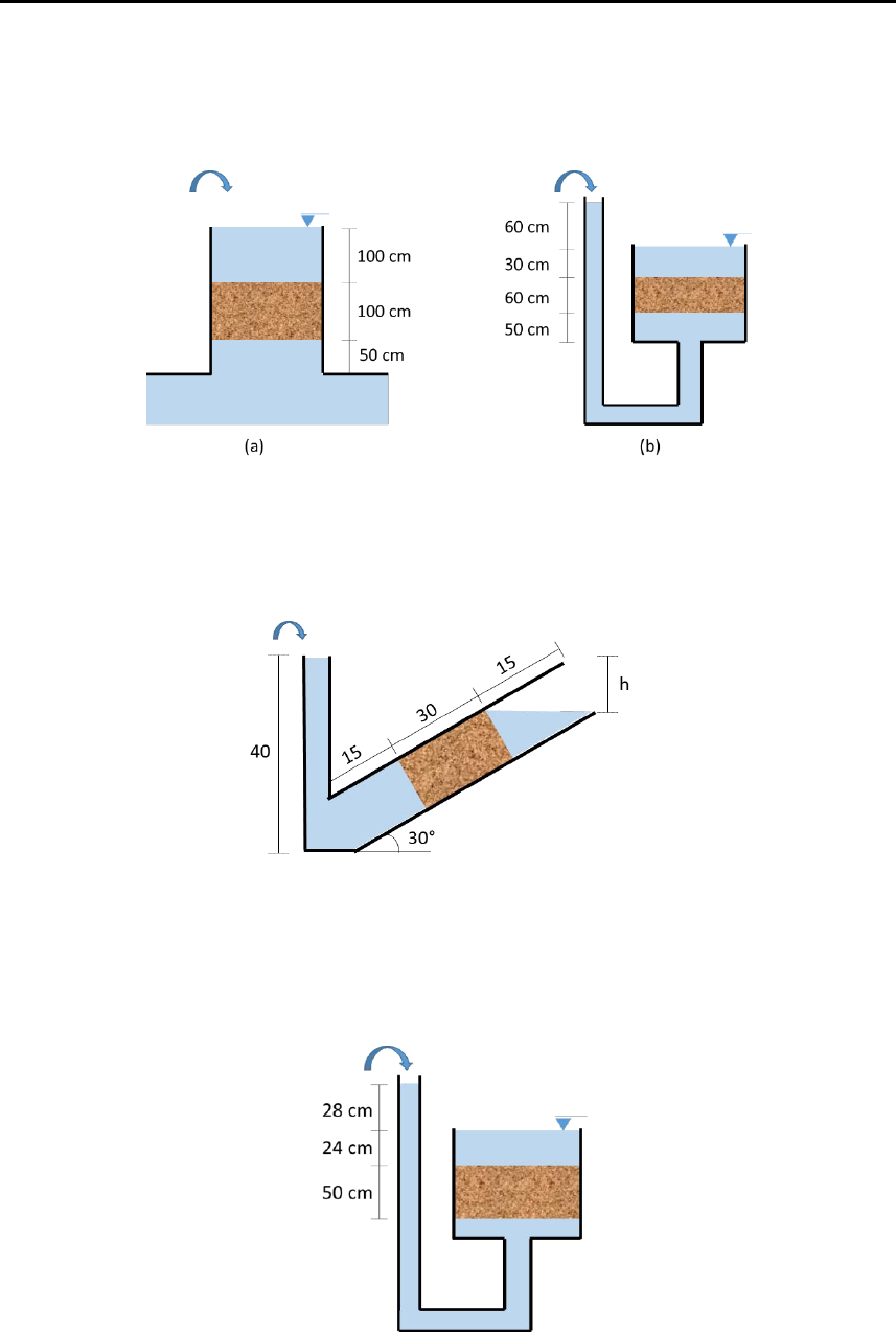 LISTA DE EXERCÍCIOS 3 1) Sabendo que o fluxo do permeâmetro (a) é descendente e do permeâmetro (b) é ascendente. Calcule a velocidade do fluxo antes de passar pelo solo e a velocidade de percolação no solo. Dados 𝑛 = 45% e 𝑘 = 0,0005 𝑚/𝑠 2) Calcule o volume de água que escoa durante 30 min através do tubo de seção de 100 cm². Considere que o coeficiente de permeabilidade do solo é 𝑘 = 4𝑥10−3𝑐𝑚/𝑠. 3) Dado o permeâmetro abaixo com h = 28 cm; z = 24 cm; L = 50 cm. A seção transversal do permeâmetro é de 530 cm². O peso específico da areia é de 18 kN/m³. Mantida a carga hidráulica, mediu-se um volume de 100 cm³ escoando em 18 segundos. Qual é o coeficiente de permeabilidade do material? 4) Num ensaio de permeabilidade, com permeâmetro de carga variável, como mostrado na figura abaixo. Quando a carga h era de 65 cm, acionou-se um cronômetro. Trinta segundos após, a carga h era de 35 cm. L = 20 cm e A = 77 cm² são as dimensões do corpo de prova e a área da bureta é de 1,2 cm². Pergunta-se a) Qual é o coeficiente de permeabilidade do solo em estudo? b) Estime o coeficiente de permeabilidade, aplicando diretamente a Lei de Darcy, para uma carga média durante o ensaio. 5) Num sistema como o da figura abaixo, considere L = 50 cm; z = 24 cm; e h = 14 cm. A área do permeâmetro é de 530 cm². O peso específico da areia é de 18 kN/m³. a) Determine, inicialmente, qual o esforço que a areia estará exercendo na peneira. b) Considere, a seguir, um ponto no interior do solo, P, numa altura 12,5 cm acima da peneira. Para esse ponto determine: Carga altimétrica; carga piezométrica; carga total; tensão total; pressão neutra e a tensão efetiva. 6) Na questão anterior, o que ocorreria se a carga h fosse elevada até chegar a 40 cm? Peneira 7) Num sistema como o da figura abaixo, considere L = 50 cm; z = 24 cm; e h = 36 cm. A área do permeâmetro é de 530 cm². O peso específico da areia é de 18 kN/m³. a) Determine, inicialmente, qual o esforço que a areia estará exercendo na peneira. b) Considere, a seguir, um ponto no interior do solo, P, numa altura 12,5 cm acima da peneira. Para esse ponto determine: Carga altimétrica; carga piezométrica; carga total; tensão total; pressão neutra e a tensão efetiva. 8) No permeâmetro abaixo, a areia A ocupa a posição horizontal, com L = 20 cm, A = 100 cm², com 𝑘 = 4 𝑥 10−3𝑐𝑚/𝑠. A areia B ocupa a posição vertical, com L = 10 cm, A = 400 cm², e 𝑘 = 2 𝑥 10−3𝑐𝑚/𝑠. Qual a possibilidade de ocorrer areia movediça nas areias A e B? Respostas: 1- Vel. Fluxo (m/s) Vel. Percolação (m/s) A 12,5 . 10−4 27,78 . 10−4 B 5 . 10−4 11,1 . 10−4 2- 𝑉 = 240 𝑐𝑚³ 3- 𝑘 = 1,87 . 10−2𝑐𝑚/𝑠 4- a) 𝑘 = 6,4 . 10−3𝑐𝑚/𝑠 b) 𝑘 = 6,2 . 10−3𝑐𝑚/𝑠 5- a) 𝐹 = 137,8 𝑁 b) ℎ𝐴 = 12,5 𝑐𝑚; ℎ𝑃 = 72 𝑐𝑚; ℎ𝑇 = 84,5 𝑐𝑚; 𝑢 = 7,2 𝑘𝑃𝑎; 𝜎′ = 1,95 𝑘𝑃𝑎 6- Ocorreria o fenômeno da areia movediça, pois 𝑖 = 𝑖𝑐𝑟𝑖𝑡 → 𝜎 ′ = 0. 7- a) 𝐹 = 402,8 𝑁 b) ℎ𝐴 = 12,5 𝑐𝑚; ℎ𝑃 = 34,5 𝑐𝑚; ℎ𝑇 = 47 𝑐𝑚; 𝑢 = 3,45 𝑘𝑃𝑎; 𝜎′ = 5,7 𝑘𝑃𝑎 8- Na areia A nunca ocorrerá o fenômeno da areia movediça. Na areia B ocorrerá areia movediça se o peso específico da areia for menor ou igual a 14 kN/m³. Peneira