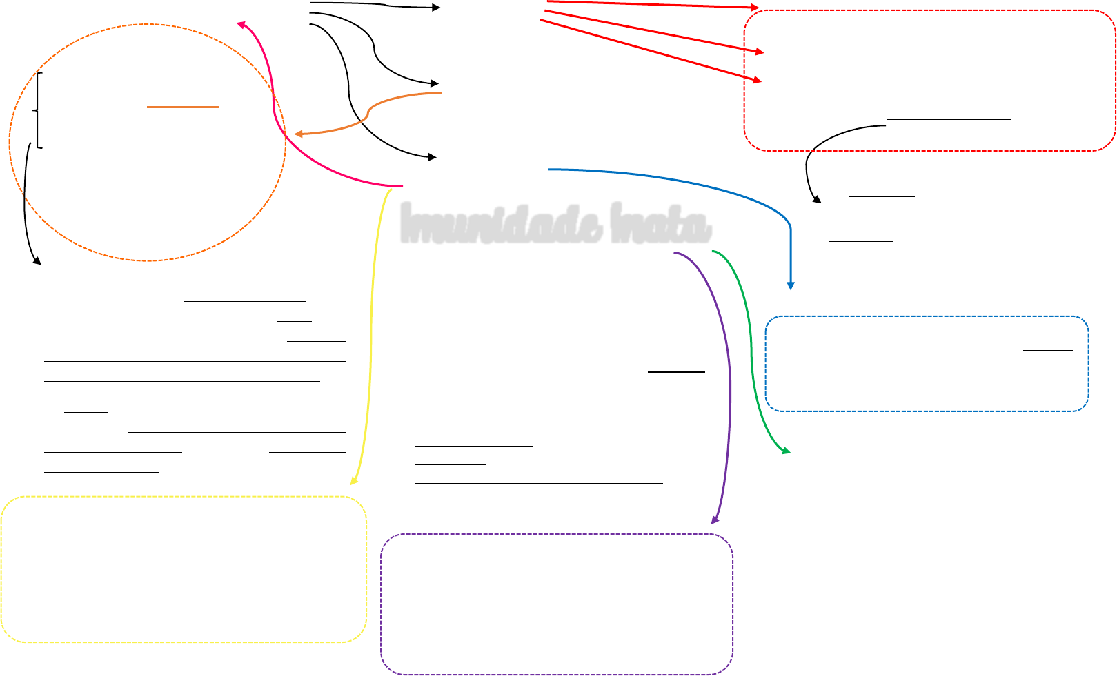 Componentes de defesa • Células fagocíticas (neutrófilos, macrófagos); • Células dendríticas; • Mastócitos, • Células natural killer (células NK); • outras células linfoides inatas (eosinófilo, basófilo, monócito Sempre presentes na maioria dos tecidos, onde atuam como sentinelas em busca de microrganismos invasores. Detectam microrganismos que conseguem romper os epitélios e iniciam as respostas do hospedeiro. As demais células entram nos tecidos vindas do sangue e eliminam os microrganismos que invadiram os epitélios, além de se livrarem das células danificadas do hospedeiro. A Respostas Imunidades Inatas estimulam respostas imunes adaptativas e podem influenciar a natureza dessas respostas, para torná-las otimamente efetivas contra diferentes tipos de microrganismo. Barreira Células Citocinas Imunidade Inata também chamada de imunidade natural ou imunidade inespecífica. ✓ Defesa Inicial; ✓ Mediada por mecanismos que já existem antes da ocorrência de uma infeção, agindo em horas após a infecção; ✓ Facilitam rápidas respostas contra microrganismos invasores; ✓ Memória nenhuma ou limitada; ✓ Inespecífica; ✓ não reage contra células e tecidos sadios normais. A imunidade inata elimina células danificadas e inicia o processo de reparo tecidual, e isto envolve o reconhecimento e a resposta a moléculas do hospedeiro produzidas, liberadas ou acumuladas em células estressadas, danificadas e mortas do hospedeiro. Mecânicas ou Físicas (Pele, Lágrimas, Cílios, Saliva, Muco, Urina, Fezes e Vômito...) Químicas (Lisozimas, Suco gástrico, Defensivos...) Microbiológicos (Microbiota Intestinal, Microbiota vaginal...) Probióticos: são microrganismos vivos, administrados em quantidades adequadas; Prebióticos: são carboidratos não-digeríveis, e estimulam seletivamente a proliferação e/ou atividade de populações de bactérias desejáveis no cólon. Proteínas sanguíneas: componentes do sistema complemento e outros mediadores da inflamação, combatem os microrganismos que entraram na circulação. Combate microrganismos por meio de duas Reações principais 1. Inflamação (leucócitos circulantes e proteínas plasmáticas são levados aos sítios de infecção nos tecidos e são ativados para destruir e eliminar os agentes agressores, e também reação a células danificadas ou mortas, e seu acúmulo) 2. Bloqueio da Replicação Viral ou Killing (previnem a replicação viral e promovem destruição de células infectadas, eliminando reservatórios de infecção viral na ausência de uma reação inflamatória) Características do reconhecimento 1. O sistema imune inato reconhece estruturas moleculares produzidas por patógenos microbianos, que são normalmente essenciais à sua sobrevivência; 2. Também reconhece moléculas endógenas que são produzidas ou liberadas por células danificadas ou que estão morrendo. O sistema Imune Inato usa vários tipos de receptores celulares, e moléculas solúveis presentes no sangue e nas secreções de mucosas, para reconhecer PAMPs e DAMPs. Essas moléculas são expressas por fagócitos (macrófagos e neutrófilos), células dendríticas, células epiteliais, mastócitos; Os receptores do sistema imune inato são codificados por genes herdados (linhagem germinativa); PAMPs ou padrões moleculares associados ao patógeno são substâncias microbianas que estimulam a imunidade inata. Diferentes tipos de microrganismos (ex.: vírus, bactérias Gram-negativas, bactérias Gram-positivas, fungos) expressam PAMPs diferentes. DAMPs ou padrões moleculares associados ao dano. Produzidos como resultado de dano celular (infecções, toxinas químicas, queimaduras, traumatismo ou perda do suprimento sanguíneo) Alarminas, subconjunto de DAMPs, são moléculas endógenas produzidas por células sadias e liberadas quando ocorre dano celular e, então, estimulam respostas inatas, e sua presença fora das células alerta o sistema imune de que algo está causando morte celular. Imunidade Inata também chamada de imunidade natural ou imunidade inespecífica. • célula-associados se ligam aos PAMPs e DAMPs, sinalizam promovendo funções antimicrobianas e pró inflamatórias das células que os expressam; • moléculas solúveis reconhecem PAMPs responsáveis pela facilitação da depuração de microrganismos do sangue e dos fluidos extracelulares Os receptores do tipo Toll (TLRs) constituem receptores de reconhecimento de padrão expressos em muitos tipos celulares, que reconhecem produtos de uma ampla gama de microrganismos, bem como moléculas expressas ou liberadas por células estressadas e em processo de morte; • ligantes reconhecidos por TLRs: constituintes da parede celular bacteriana (LPS e ácido lipoteicoico, flagelina); ácidos nucleicos (RNA de fita dupla) • reconhecimento de ligantes microbianos pelo TLR resulta na ativação de diversas vias de sinalização e, de fatores de transcrição, induzindo a expressão de genes cujos produtos são importantes para as respostas inflamatória e antiviral; Receptores celulares de padrões moleculares associados ao patógeno e ao dano também são denominados receptores de reconhecimento de padrão ou PRRs; E são expressos na superfície, em vesículas fagocíticas e no citosol de vários tipos celulares (onde microrganismos podem estar presentes); Componentes Celulares As células do sistema imune inato atuam como barreiras contra infecções e como sentinelas para detectar microrganismos e células danificadas em tecidos. Vários tipos celulares expressam os diversos receptores de reconhecimento de padrão, e após o reconhecimento de PAMPs e DAMPs, respondem produzindo citocinas inflamatórias e proteínas antivirais; outras matam microrganismos ou células infectadas. São decisivas para a estimulação de respostas imunes adaptativas subsequentes. CÉLULAS NATURAL KILLER são células citotóxicas que exercem respostas imunes inatas, pr