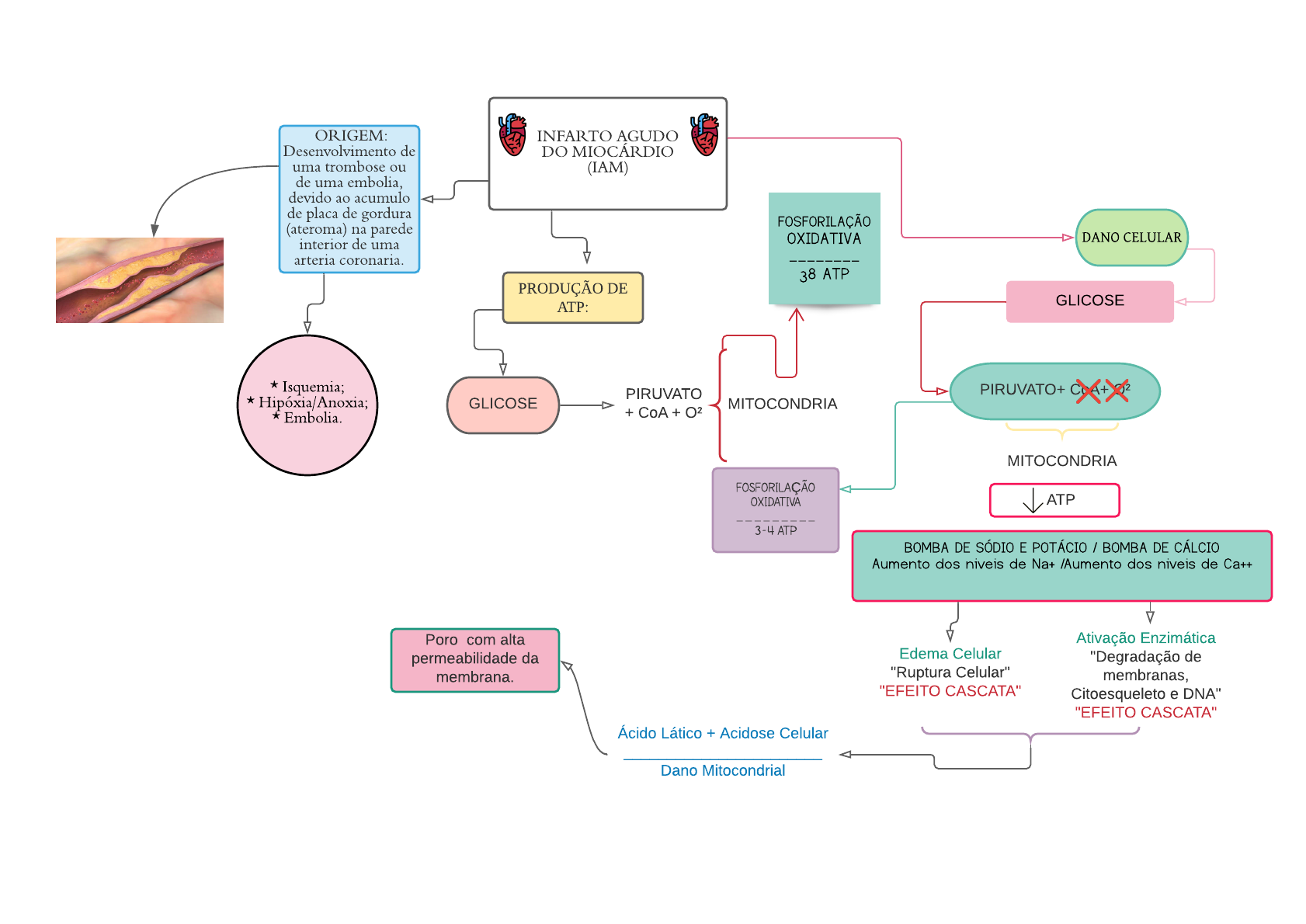 IN FARTO AGUDO DO M IOCÁRDIO (IAM ) ORIGEM : Desenvolvimento de uma trombose ou de uma embolia, devido ao acumulo de placa de gordura (ateroma) na parede interior de uma arteria coronaria. * Isquemia; * H ipóxia/Anoxia; * Embolia. PRODUÇÃO DE ATP: GLICOSE PIRUVATO + CoA + O² MITOCONDRIA FOSFORILAÇÃO OXIDATIVA ________ 38 ATP DANO CELULAR PIRUVATO+ CoA+ O² GLICOSE MITOCONDRIA FOSFORILAÇÃO OXIDATIVA _________ 3-4 ATP ATP BOMBA DE SÓDIO E POTÁCIO / BOMBA DE CÁLCIO Aumento dos niveis de Na+ /Aumento dos niveis de Ca++ Edema Celular "Ruptura Celular" "EFEITO CASCATA" Ativação Enzimática "Degradação de membranas, Citoesqueleto e DNA" "EFEITO CASCATA" Ácido Lático + Acidose Celular _______________________ Dano Mitocondrial Poro com alta permeabilidade da membrana. MapaMentalMNica Página 1