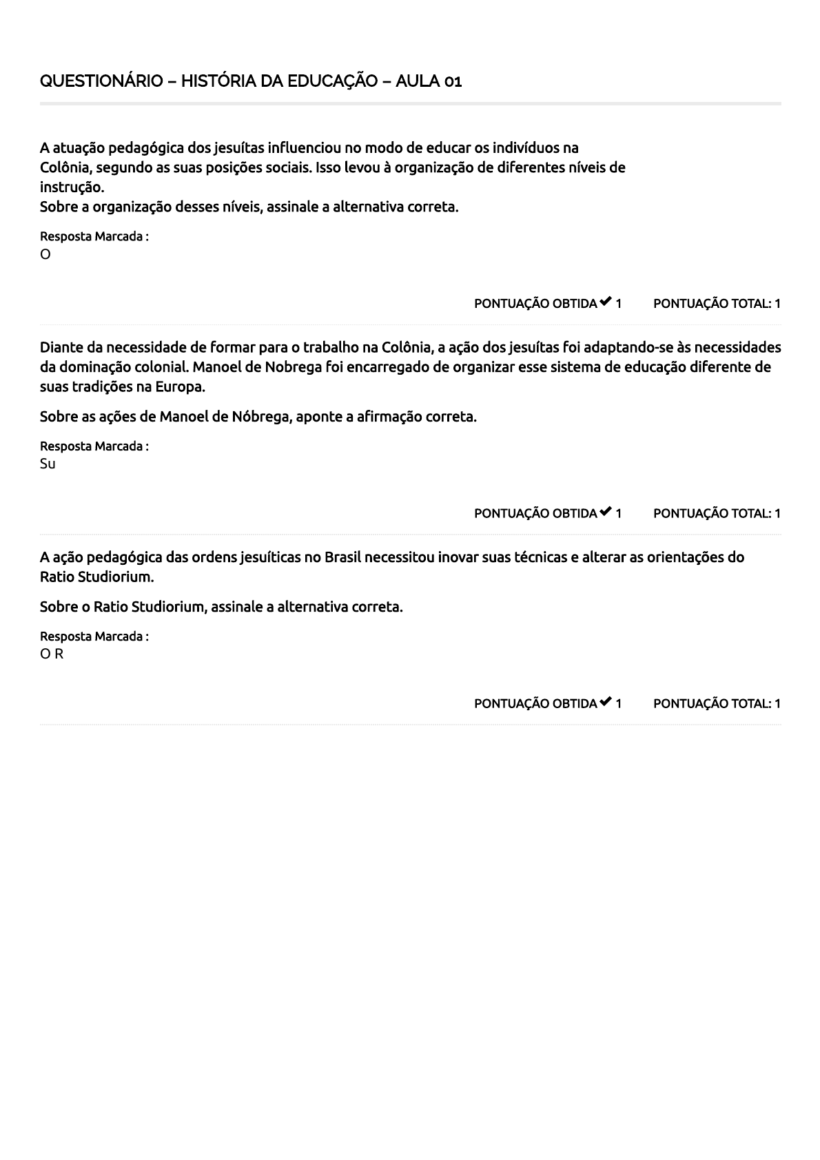 29/07/2020 Course Status – Centro Universitário Faveni https://ava.unifaveni.com.br/course-status/ 1/2 QUESTIONÁRIO – HISTÓRIA DA EDUCAÇÃO – AULA 01 PONTUAÇÃO TOTAL: 1PONTUAÇÃO OBTIDA 1 A atuação pedagógica dos jesuítas in�uenciou no modo de educar os indivíduos na Colônia, segundo as suas posições sociais. Isso levou à organização de diferentes níveis de instrução. Sobre a organização desses níveis, assinale a alternativa correta. Resposta Marcada : Os índios eram instruídos sobre os rudimentos da língua e sobre os ofícios. Para as classes abastadas, havia o ensino superior. PONTUAÇÃO TOTAL: 1PONTUAÇÃO OBTIDA 1 Diante da necessidade de formar para o trabalho na Colônia, a ação dos jesuítas foi adaptando-se às necessidades da dominação colonial. Manoel de Nobrega foi encarregado de organizar esse sistema de educação diferente de suas tradições na Europa. Sobre as ações de Manoel de Nóbrega, aponte a a�rmação correta. Resposta Marcada : Sua estratégia para organizar o ensino e ter maior efetividade teve como foco agir sobre os �lhos dos indígenas, fazendo uso dos órfãos enviados de Lisboa à sua possessão no Novo Mundo. PONTUAÇÃO TOTAL: 1PONTUAÇÃO OBTIDA 1 A ação pedagógica das ordens jesuíticas no Brasil necessitou inovar suas técnicas e alterar as orientações do Ratio Studiorium. Sobre o Ratio Studiorium, assinale a alternativa correta. Resposta Marcada : O Ratio Studioruim deveria ordenar as instituições de ensino de uma única maneira, permitindo uma formação uniforme em todos os colégios da Ordem Jesuítica no mundo. 29/07/2020 Course Status – Centro Universitário Faveni https://ava.unifaveni.com.br/course-status/ 2/2 5 / 5 PONTUAÇÃO TOTAL: 1PONTUAÇÃO OBTIDA 1 A ação do governo metropolitano necessitava de um instrumento de dominação e naturalização das formas de vida e de trabalho na Colônia. Sobre a estratégia desenvolvida, assinale a alternativa correta Resposta Marcada : Os jesuítas �caram encarregados de um duplo papel: catequizar os nativos e também impor a dominação ideológica e do conhecimento. PONTUAÇÃO TOTAL: 1PONTUAÇÃO OBTIDA 1 O Período Colonial do século XV pode ser caracterizado pelo forte controle da metrópole sobre a Colônia. No caso do Brasil, sua metrópole, Portugal, exercia seu poder tanto nas esferas política e econômica quanto na formação educacional e religiosa. Sobre o início da escolarização no Brasil colonial, assinale a a�rmação correta Resposta Marcada : Marcado pela in�uência e dominação religiosa, percebidas nas ações da Companhia de Jesus e de seu modelo de organização burocrática do Estado. Total