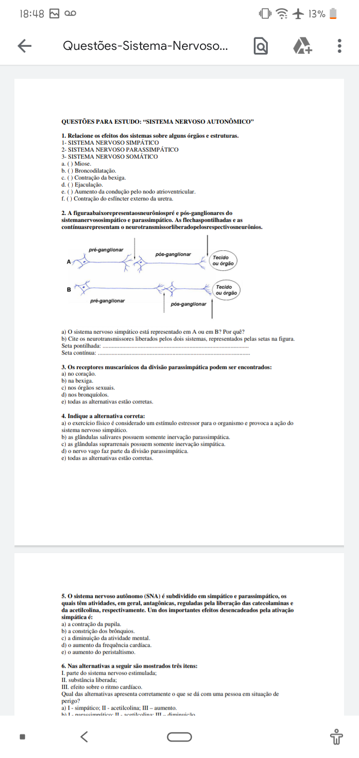 QUESTOES PARA ESTUDO: "SISTEMA NERVOSO AUTONOMICO" Relacione os efeitos dos sistemas sobre alguns órgãos e estruturas. 1- SISTEMA NERVOSO SIMPATICO 2- SISTEMA NERVOSO PARASSIMPATICO 3- SISTEMA NERVOSO SOMATICO a. Miose b. Broncodilatação c. Contração da bexiga d. Ejaculação e. Aumento da condução pelo nodo atrioventricular. f. Contração do esfíncter externo da uretra.