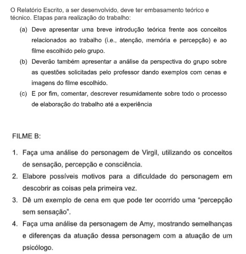 1. Estou trabalhando nesta questão Conceitos de percepção e sensação. Percepção é a função cerebral que atribui significados a estímulos sensoriais, a partir de histórico de vivências passadas. Através da percepção, um indivíduio organiza e interpreta suas impressões sensoriais para atribuir significado ao seu meio. Consiste na aquisição, interpretação, seleção e organização das informações obtidas pelos sentidos. A percepção envolve também os processos mentais, a memória e outros aspectos que podem influenciar na interpretação dos dados percebidos. Para a psicologia a percepção é o processo ou resultado de se tornar consciente de objetos, relacionamentos e eventos por meio dos sentidos, que inclui atividades como reconhecer, observar e discriminar. A percepção do mundo é diferente para cada um de nós, cada pesssoa percebe um objeto ou uma situação de acordo com os aspectos que tem especial importancia para si própria. Sensação É produzida pela ação de um estímulo (externo ou interno) sobre um órgão sensorial, transmitida ao cérebro através do sistema nervoso. As sensações principais do nosso corpo são: visuais, auditivas, tativas, gustativas e olfativas. 2. elabore possíveis motivos para a dificuldade do personagem em descobrir as coisas: resposta da Paola Após retomar com a visão, Virgil sai da área de conforto onde viveu desde os 3 anos de idade, entre a descoberta com o que é ou não real, possui também agnósia visual, um déficit que consiste em não permitir ao cérebro reconhecer objetos visualmente, ou seja, a imagem está clara mas não existe um histórico sobre o que aquilo é, pois o cérebro até então entendeu sua plasticidade ao fato decorrente à falta de visão. Além da agnosia visual também possui agnosia espacial, onde o paciente perde noção de distância e espaço. É visível que ocorra desajustes em funções ligadas à visão, a adaptação também dependerá de um ponto de vista ético e filosófico em relação ao mundo em sua volta, porém não é algo visível em relação às pessoas que cercam Virgil, pois sua dificuldade não se localiza apenas no superficial, é um desajuste que se estende até a convivência humana em relação aos sentimentos. Após anos sem executar funções visuais, Virgil desenvolveu habilidades táteis e se desprendeu de habilidades visuais, entre esse processo de aprimorar funções auditivas, olfativa, tátil e até funções cognitivas como memória e linguagem, houve um processo de poda dendrítica, onde sinapses químicas serão destruídas para a regularização do sistema nervoso, assim como excluindo funções redundantes em relação ao estímulo visual, e possivelmente incluindo apoptose neural, que seria uma espécie de suicídio dos neurônios como um processo de poda dos mesmos para fortalecer as sinapses dos que fornecem maiores eficiências. 1. O personagem Virgil antes de conhecer Amy, já estava totalmente adaptado aos ambientes de seu trabalho e casa, seus pais ao se conscientizarem que Virgil não voltaria a enxergar, mudaram-se para uma cidade pacata, com rotinas estabelecidas, Virgil cresceu num local onde conhecia a todos, mesmo à distância sem enxergá-los, tinha a percepção de quem estava próximo de si, como mostra no filme a bibliotecária se aproximando e ele brinca com ela, antes de qualquer palavra, apenas talvez pelo cheiro ou jeito de andar, como foi o caso de seu amigo, do outro lado da rua, comentando com Amy que ele estava acendendo um cigarro com o anterior, usando apenas a sua percepção do meio. Em outro momento ele consegue identificar que em poucos instantes, começaria a chover, são seus estímulos aguçados desenvolvidos pela falta da visão. Era consciente de suas limitações, e não se importava, pois sua rotina de trabalho e sua casa, estavam adaptados à sua condição, até conhecer Amy que lhe propôs um grande desafio, ir para a cidade e encarar um novo tratamento para voltar a enxergar, diante da grande paixão que nutria por esta mulher, consciente de todas as dificuldades que seria a mudança, encarou o desafio, a primeira dificuldade foi reconhecer o espaço da casa de Amy, e após a cirurgia, apesar de voltar a enxergar, a adaptação à nova vida, tendo que conhecer as coisas com os olhos e não mais com as mãos, teve grande dificuldade de dar nomes a objetos, teve que reaprender muitas coisas, e também às expressões faciais, o que cada uma delas significava. Ao perceber que sua visão estava novamente perdendo a visão, entendeu que seria melhor para ele e Amy voltar para sua cidade. Mas ao final, percebe que pode ajudar com sua experiência e retorna à cidade para trabalhar com crianças com deficiência visual.