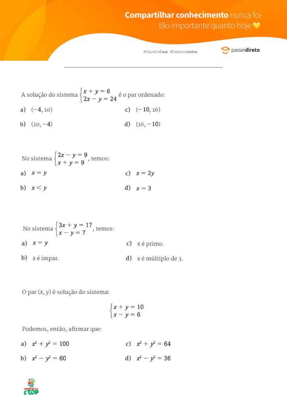 Prof° Everton Moraes Lista de Exercícios | Sistemas de Equações do 1° Grau Questão 01 Questão 02 Questão 03 Questão 04 Prof° Everton Moraes Questão 05 Gabarito: 1-B 2-C 3-D 4-B 5-A