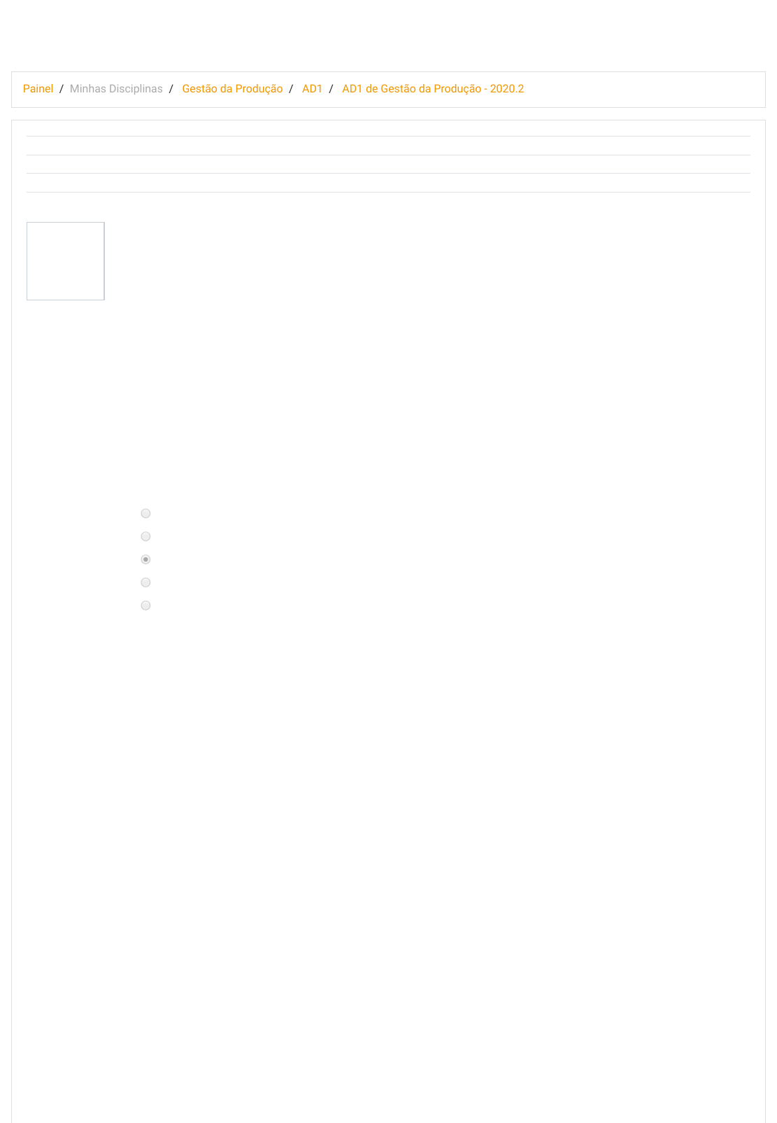 Painel / Minhas Disciplinas / Gestão da Produção / AD1 / AD1 de Gestão da Produção - 2020.2 Questão 1 Completo Vale 1,00 ponto(s). Iniciado em domingo, 13 set 2020, 14:49 Estado Finalizada Concluída em domingo, 13 set 2020, 16:21 Tempo empregado 1 hora 32 minutos Plataformas de delivery de comida têm mostrado resultados de venda bastante satisfatórios, impulsionados pelo isolamento social imposto pela pandemia de coronavírus que o mundo atravessa. Tal modelo de negócio apóia- se numa tríade de relacionamento que envolve cliente, restaurante e entregador, cujos interesses se encontram no aplicativo. Nesse contexto, podemos afirmar que: I-A transformação de matéria prima em bem tangível é realizada no restaurante. II-Os entregadores representam atores do processo que estão na retaguarda do serviço. III-As empresas de aplicativo substituem o contato físico do restaurante pela relação remota, caracterizando-se como operação de serviço. Está(ão) correta(s): Escolha uma: a. Somente o item I. b. Somente os itens II e III. c. Somente os itens I e III. d. Somente o Item II e. Todos os itens estão corretos https://graduacao.cederj.edu.br/ava/my/ https://graduacao.cederj.edu.br/ava/course/view.php?id=137 https://graduacao.cederj.edu.br/ava/course/view.php?id=137§ion=1 https://graduacao.cederj.edu.br/ava/mod/quiz/view.php?id=324839 Questão 2 Completo Vale 1,00 ponto(s). Questão 3 Completo Vale 1,00 ponto(s). Leia o texto e assinale a alternativa correta: A agilidade no lançamento de novos produtos é uma característica da Tok&Stok, que atualmente possui uma variedade de nove mil itens. Seus produtos aliam exclusividade de design, modernidade e praticidade. Mais de oito produtos novos são lançados por dia. Dentro do conceito de pronta retirada, é importante que o desenvolvimento de novos produtos contemple questões como a praticidade de transporte e a facilidade de montagem pelo próprio cliente. Além de ser inovadora em seus produtos, a empresa conta com operações inovadoras. As lojas são normalmente simples, amplas e possuem o conceito de auto-serviço, em que o cliente pode andar por ela. Os produtos são expostos com a intenção de mostrar como ficariam na casa do cliente. Isso facilita a visualização da peça dentro de um ambiente modular cuidadosamente montado. A Tok&Stok também pensa na comodidade e no lazer de seus clientes. Algumas lojas contam com a área baby, um espaço para os pais deixarem seus filhos enquanto enquanto fazem suas compras, e o Café Design, onde os clientes podem comer um lanche ou tomar um café. (Adaptado de: KRAJEWSKI, L., RITZMAN L., MALHOTRA, M. Administração de Produção e Operações. 8 ed. São Paulo: Prentice Hall, 2009). Escolha uma: a. A área de produção possui papel proativo dentro da estratégia, sendo provedora da base para o sucesso competitivo. b. O objetivo de desempenho de qualidade está presente na variedade de mix da empresa. c. O objetivo de desempenho de rapidez é negligenciado pela empresa por adotar o conceito de pronta retirada d. O objetivo de desempenho de flexibilidade está presente na capacidade da empresa de lançar novos produtos. e. O objetivo de desempenho de custo está presente na oferta de áreas baby para os pais deixarem os filhos. A MNM produz uma linha de motores para caminhões chamada StarFox. A produção na fábrica brasileira apresentou custos mais competitivos de que outros países. Os motores são enviados até uma fábrica em general Escubedo, no México. A fábrica brasileira produz modelos básicos utilizando peças trazidas de Chicago, nos Estados Unidos. Chicago também abastece a unidade Mexicana com itens de diferenciação dos modelos de motores para finalização dos mesmos. As poucas variedades de modelos básicos não finalizados que saem do Brasil transformam-se em dezenas de variedades de modelos acabados no México. À finalização posterior do produto, de acordo com a demanda por cada modelo, dá-se o nome de postergação da produção. Assinale a alternativa correta: Escolha uma: a. Ao planejar que a finalização dos motores ocorresse no México, nota-se uma priorização do objetivo de qualidade em detrimento de custos. b. Ao planejar que a finalização dos motores ocorresse no México, nota-se uma priorização do objetivo de rapidez em detrimento da flexibilidade. c. Ao planejar que a finalização dos motores ocorresse no México, a empresa conseguiu conciliar objetivos de desempenho como flexibilidade e custos. d. A análise de trade-off mostrada no texto permite conciliar objetivos de desempenho como qualidade e confiabilidade. e. A análise de trade-off mostrada no texto permite conciliar objetivos de desempenho como flexibilidade, qualidade e custo. Questão 4 Completo Vale 1,00 ponto(s). Questão 5 Completo Vale 1,00 ponto(s). Questão 6 Completo Vale 1,00 ponto(s). Na década de oitenta a Toyota conseguia desenvolver novos modelos de automóveis num tempo muito inferior ao das concorrentes. Com base no que você estudou, assinale a alternativa que aponta, respectivamente, uma importância dessa redução no tempo de desenvolvimento de projetos de produto para a empresa e uma prática útil para essa finalidade. Escolha uma: a. Apresentar inovações de produto antes da concorrência. Usando estrutura funcional, que mantém os membros envolvidos com as atividades de suas funções originais b. Aumentar o custo do desenvolvimento de projetos. Usando recursos tecnológicos como CAD/CAM c. Apresentar fábricas focalizadas capazes de produzir alta variedade. Reforçando o papel dos gerentes funcionais em detrimento gerência de projetos d. Apresentar fábricas focalizadas capazes de produzir alta variedade. Resolvendo conflitos na equipe o quanto antes e. Apresentar inovações de produto antes da concorrência. Realizando o máximo de atividades com paralelismo ou simultaneidade Ao projetar processos, as empresas devem considerar as caracterís