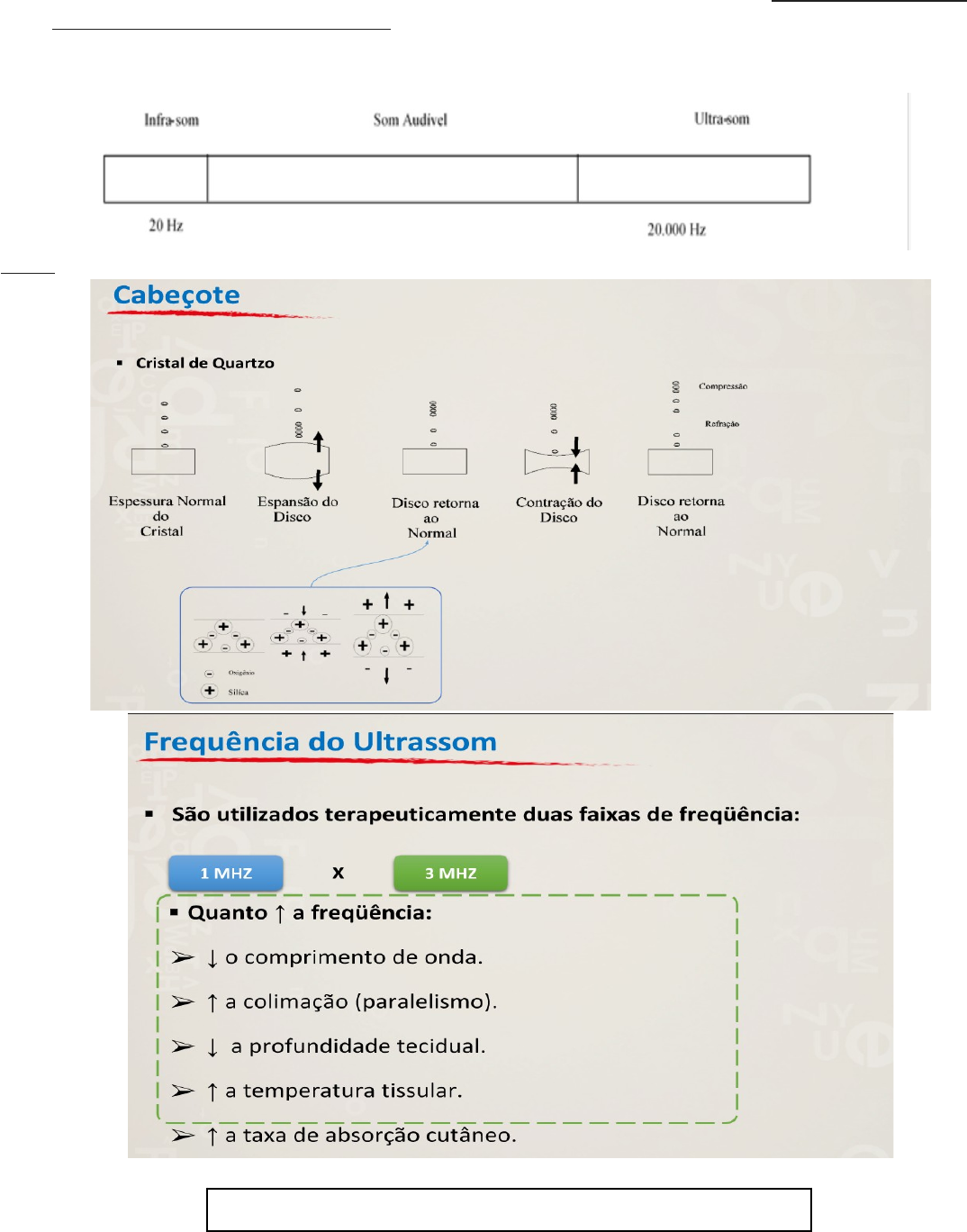 ULTRASSOM -Ultra-som é uma forma de energia mecânica que consiste de vibrações de alta frequência. -As ondas ultra-sônicas são ondas longitudinais e provocam oscilações nas partículas do meio onde se propagam. -O Ultra-som corresponde a faixas superiores à audição humana. -A frequência médica para diagnóstico de imagem varia de 5 a 20 MHz e a faixa de frequência para a terapia varia de 0,7 a 3 MHz. -Esta terapêutica tem pouca efetividade quando aplicada isoladamente. Para cada cm2 de tecido deve considerar 1 min de aplicação. Modo de aplicação Modo Contínuo Modo Pulsado Ondas sônicas contínuas Ondas sônicas pulsadas Sem modulação Modulação com frequências de 16 Hz a 100 Hz Efeitos térmicos Efeitos térmicos minimizados Alteração da pressão Alteração da pressão Micro-massagem (diatermia) Efeitos não-térmicos Comportamento do Ultra-som à medida que se propaga através dos tecidos: Podemos observar que ocorrem alterações nas ondas sonoras conforme vão penetrando no tecido; são elas: 1. Atenuação; 2. Absorção; 3. Reflexão; 4. Refração; 5. Transmissão. 1. Atenuação A intensidade diminui à medida que as ondas de ultra-som sob passam através de qualquer meio. 2. Absorção Ocorre a nível molecular gerando movimentos moleculares aleatórios. Proteínas são as que mais absorvem (devido à presença de tecidos macromoleculares). Ultra-som é bem absorvido por: · proteína em tecido nervoso; · ligamentos; · capsulas intra-articulares; · tendões com alta concentração de colágeno; · proteína no músculo; · hemoglobina. Ultra-som não é bem absorvido pela : · pele e Sangue · gordura Absorção resulta em aquecimento do tecido e então, tecido com alto conteúdo protéico se aquece muito mais que tecidos adiposos ou epiteliais. A Absorção do ultra-som depende de: · impedância acústica do tecido; ângulo de incidência; · densidade do tecido e suas interfaces; descasamento da impedância; · freqüência do ultra-som; viscosidade do fluido; · quantidade de proteína do tecido; taxa de reflexão; · quantidade de água e gordura; taxa de refração; Reflexão 1.Quando o ultra-som trafega de um meio (tecido) para outro, pode ocorrer reflexão da onda de som. 2.A energia refletida é sempre menor que a energia incidente. 3.As seguintes interfaces são as principais a serem consideradas quando se aplica ultra-som terapêutico: · osso / periósteo tecido / ar · cabeçote transdutor / ar interfaces de tecidos conjuntivos. · osso / tecido mole Efeitos fisiológicos Térmicos Efeitos Terapêuticos não térmicos Aumenta a taxa metabólica dos tecidos. Regeneração Tissular e Reparação dos Tecidos Moles Aumento da vascularização. Síntese de Proteína Aumento da extensibilidade do colágeno. Estimulação do Calo Ósseo Aumenta as propriedades viscoelásticas dos tecidos conjuntivos. Aumento da Circulação Tissular Diminui o espasmo muscular. Diminuição de Espasmos Aumenta a taxa de atividade enzimática. Normalização do Tônus Muscular Diminui a sensibilidade dos elementos neurais (elevação do limiar de dor) Normalização do pH Estimulação das moléculas sangüíneas Ativação do Ciclo do Cálcio Estimulação das Fibras Nervosas Aferentes Efeitos Terapêuticos Aumento de mobilidade da articulação Aumento da extensibilidade em tecidos ricos em colágeno Efeito sobre os nervos periféricos Aumento da circulação sangüínea Redução de espasmos musculares Alívio da dor Técnicas de aplicação do cabeçote Contato Direto entre o Cabeçote e o Corpo. Usado com mais freqüência. O cabeçote de tratamento é aplicado diretamente sobre a pele. Sabe-se que o ar reflete quase por completo o ultra-som, portanto, é absolutamente necessário assegurar-se da aplicação de um meio altamente condutor entre o cabeçote e a pele. Tipos de meio de contato disponíveis na atualidade para transmissão do ultra-som: - emulsões a base de água - géis aquosos; - pomadas hidrosolúveis; O gel mais adequado para a transmissão do ultra-som deve ser capaz de manter os sais cutâneos em suspensão, permitindo assim a manutenção da atividade dos poros. Técnica de Imersão -Usado para tratar regiões irregulares, que dificultam o bom contato entre o cabeçote e a pele. -A parte do corpo em questão é submersa em um recipiente completamente cheio de água em temperatura agradável. - Submerge-se também o cabeçote e posiciona-se a certa distância da parte a ser tratada. Bolsa Gel -Uma terceira técnica para o tratamento de superfícies com forma irregular é a chamada “Almofada de Água”. Trata-se de uma bolsa de plástico cheia até ¾ de sua capacidade com água fervida e posteriormente resfriada. -A bolsa se adapta perfeitamente sobre a área a se tratar. O cabeçote de aplicação e a superfície da bolsa em contato com a pele devem ser cobertos com uma determinada quantidade de meio de contato e após, usa-se o cabeçote sobre a superfície da bolsa. -Sem dúvida ocorrerá uma perda razoável de energia. Nesta técnica, cabeçotes pequenos não produzirão efeitos terapêuticos.