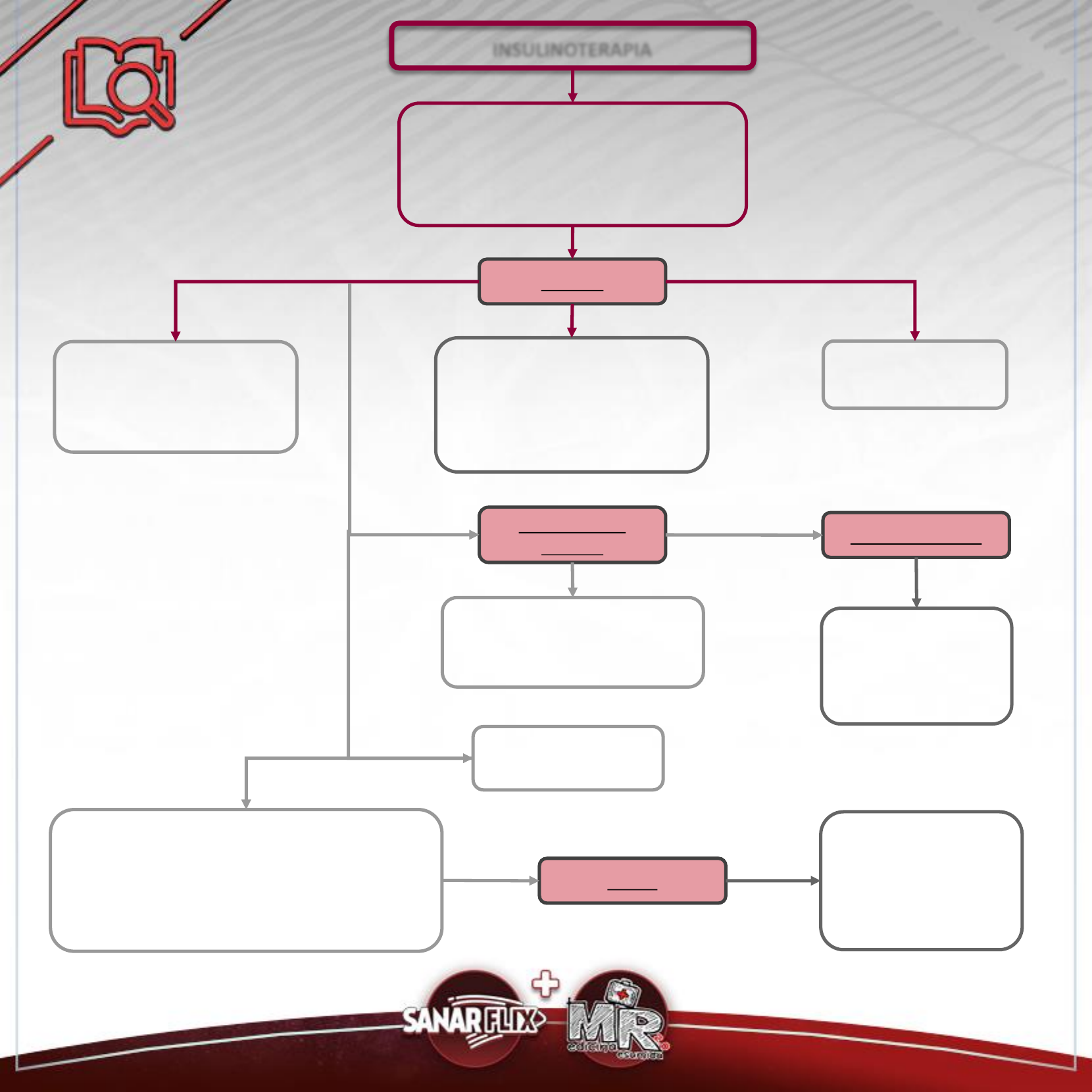 INSULINOTERAPIA Diagnóstico + mudança do estilo de vida + tratamento: a) Farmacológico b) Não-farmacológico Insulina Tipos: ▪ Ação rápida→ emergência ▪ Ação curta ▪ Ação intermediária (NPH) ▪ Ação lenta Basal: dose inicial de 10-15 U Esquemas de insulina 1) Regular, 1x ao dia, antes das refeições + NPH, 2x ao dia, ao acordar e ao dormir 2) Regular + NPH, 03x ao dia 1) NPH→ ao deitar para controlar glicemia de jejum 2) Controlar glicemia que persiste alterada 3) Controlar glicemia pós-prandial e HbA1c 4) Reavaliação do esquema inicial ▪ Regular: suprimir pico glicêmico das refeições ▪ NPH: controle basal da glicemia Efeitos adversos ▪ Hipoglicemia ▪ Lipodistrofias ▪ Alergias ▪ Hipopotassemia ▪ HbA1c <7 ▪ Glicemia de jejum entre 70-130 ▪ Glicemia pós- prandial < 180 Metas