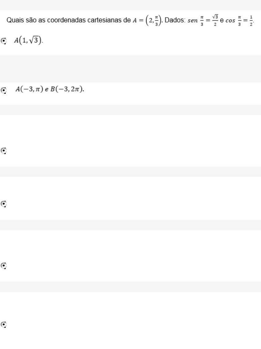Pergunta 1 Pergunta 2 Assinale a alternativa que contenha os pares de coordenadas polares que representem o mesmo ponto: Pergunta 3 Substitua a equação polar r 2 = 4r cos θ por uma equação cartesiana equivalente e assinale dentre as alternativas abaixo, aquela que a contenha: (x - 2)2 + y2 = 4. Pergunta 4 Dentre as alternativas, escolha aquela que contenha a equação r = 2(1 - cosθ) no sistema cartesiano: (x2 + y2 + 2x)2 = 4(x2 + y2) Pergunta 5 Determine os pontos do plano que satisfazem a equação r =8 cos θ e assinale a alternativa que contenha essa equação: (x - 4)2 + y2 = 16 Pergunta 6 Assinale a alternativa que contenha a equação cartesiana equivalente à: r cos θ + r sen θ = 1 x + y = 1
