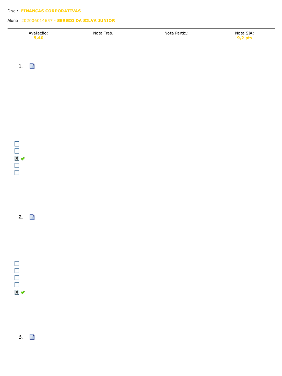 Disc.: FINANÇAS CORPORATIVAS Aluno: 202006014657 - SERGIO DA SILVA JUNIOR Avaliação: 5,40 Nota Trab.: Nota Partic.: Nota SIA: 9,2 pts Ref.: 3537897 Pontos: 0,60 / 0,60 I - As decisões de investimentos referem-se tanto à administração da estrutura do ativo quanto à implementação de novos projetos para que a empresa possa continuar competindo com a concorrência. Isto gera a necessidade de vultosas somas adicionais de recursos e elevação no risco do empreendimento, uma vez que investimentos em novos tipos de ativos fixos têm efeitos prolongados sobre a vida da empresa e uma decisão inadequada poderá comprometer irremediavelmente o seu futuro; II - As decisões de financiamento constituem responsabilidade exclusiva do administrador financeiro, pois as questões envolvidas nelas referem-se à composição das fontes de recursos, que exigem análise profunda das alternativas existentes e de suas implicações futuras; III - As decisões relativas à Destinação do Lucro envolvem a quantidade do lucro que será distribuída entre os acionistas e o que será destinado a novos investimentos, visando a expansão dos negócios. Estão corretas apenas as afirmativas: Somente II I e II verdadeiras Todas verdadeiras NDA I e III verdadeiras Respondido em 15/09/2020 17:38:37 Ref.: 3537903 Pontos: 0,60 / 0,60 I - Mesmo com a globalização é possível analisar a política econômica de um determinado país sem considerar as interrelações existentes hoje entre os mais variados mercados, como o mercado de moedas e de taxas de câmbio. II - As taxas de câmbio são consideradas fundamentais para o equilíbrio macroeconômico de um país. III - A taxa de câmbio pode ser considerada, a princípio, o preço relativo de cada moeda em comparação à outra. Estão corretas apenas as afirmativas: I e III verdadeira I e II verdadeiras Todas verdadeiras NDA II e III verdadeiras Respondido em 15/09/2020 17:36:36 Ref.: 3537899 Pontos: 0,60 / 0,60 I - As fontes de recursos à disposição de uma empresa podem ser classificadas como recursos próprios, de terceiros, recursos permanentes, recursos temporários, recursos onerosos e recursos não onerosos. II - Os recursos adicionais a serem fornecidos pelos acionistas por meio de novas integralizações de capital e lucros reinvestidos envolvem um custo de oportunidade. III - A compra de um equipamento, cujo valor investido somente será recuperado em alguns anos por meio das EPS: AulaPós https://aulapos.estacio.br/bdq_prova_resultado_preview.asp 1 of 4 30/09/2020 15:33 Rectangle receitas de vendas, deverá ser financiada com recursos temporários. Estão corretas apenas as afirmativas: Todas verdadeiras I e III verdadeira nda II e III verdadeira I e II verdadeira Respondido em 15/09/2020 17:36:46 Ref.: 3537902 Pontos: 0,60 / 0,60 I - Estoques com baixa rotação representam fundos ociosos, enquanto um giro alto significa otimização dos recursos investidos. II - O gestor financeiro deverá manter controle do estoque por tipo de mercadorias / produtos existentes na empresa. III - Cabe ao gestor financeiro confirmar se o saldo apurado no Controle de Estoque confere com o estoque físico existente na empresa. Estão corretas apenas as afirmativas: I e II verdadeiras II e III verdadeiras I e III verdadeiras NDA Todas verdadeiras Respondido em 15/09/2020 17:38:48 Ref.: 3537894 Pontos: 0,60 / 0,60 I - Os recursos materiais de renovação lenta são conhecidos como capital fixo ou permanente. II - Os recursos de rápida renovação formam o capital circulante ou capital de giro, também chamado de ativo corrente. III - Na administração do capital de giro não se deve considerar os ciclos econômicos e a sazonalidade específica de determinados negócios. Estão corretas apenas as afirmativas: II e III verdadeiras Todas verdadeiras I e II verdadeiras NDA I e III verdadeiras Respondido em 15/09/2020 17:39:09 Ref.: 3537917 Pontos: 0,60 / 0,60 EPS: AulaPós https://aulapos.estacio.br/bdq_prova_resultado_preview.asp 2 of 4 30/09/2020 15:33 I - O compromisso assumido perante terceiros deve ser baseado em documento, que conste pelo menos o nome do credor, o valor e a data do compromisso, possibilitando o registro em uma planilha, formulário ou outro documento para facilitar a visualização dos compromissos vincendos, datas e valores bem como o seu montante. II - Os saldos de fornecedores ou duplicatas a pagar, representa para a empresa uma fonte de recursos permanentes, porque são decorrentes do ciclo operacional da empresa e não representam custo explícito. III - O Controle de Contas a Pagar possibilita que o empresário fique permanentemente informado sobre o vencimento dos compromissos, como estabelecer prioridades de pagamento e o montante dos valores a pagar. Estão corretas apenas as afirmativas: II e III verdadeiras nda I e II VERDADEIRAS I e III verdadeiras Todas verdadeiras Respondido em 15/09/2020 17:39:15 Ref.: 3537901 Pontos: 0,60 / 0,60 I - É necessário manter certo nível de estoque de materiais, de produtos em elaboração e acabados para alcançar ganhos de escala e reduzir os custos de produção. II - Manter um certo nível de estoque de materiais permite contornar problemas advindos de atrasos dos fornecedores, quebra de equipamentos, greves etc. III - A administração dos estoques busca o equilíbrio entre os aspectos operacionais e financeiros, mas isto não soluciona conflitos de interesses entre a área financeira e demais áreas envolvidas com estoques. Estão corretas apenas as afirmativas: NDA Todas verdadeiras I e III verdadeira I e II verdadeira I verdadeira Respondido em 15/09/2020 17:39:29 Ref.: 3537898 Pontos: 0,60 / 0,60 I - As empresas concedem crédito para ampliar seu nível de operações, obter ganhos de escala, absorver melhor os custos fixos e, assim, maximizar a rentabilidade. II - As vendas a prazo geram riscos de atrasos e perdas por falta de pagamento, provocando despesas adicionais com análise de crédito e