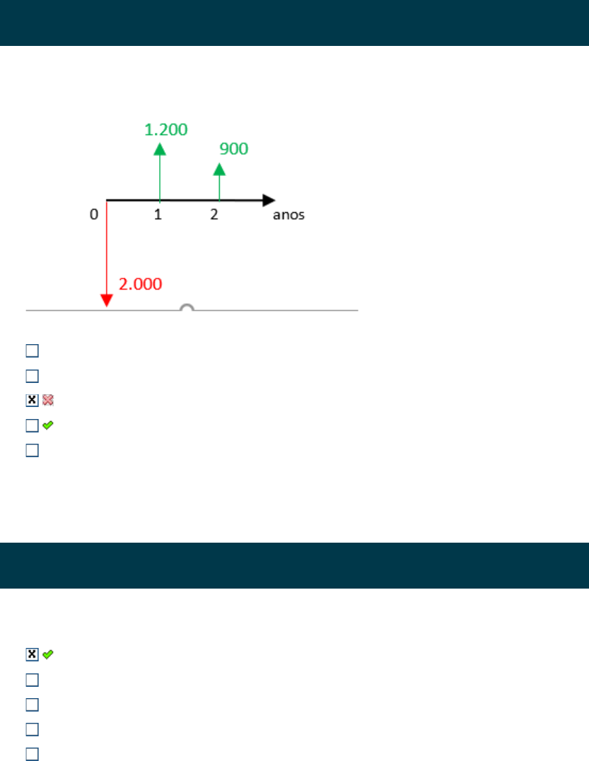 5a Questão Acerto: 0,0 / 1,0 Calcule o valor da TIR do projeto com o fluxo ilustrado na figura abaixo 2,56% a.a. 4,22% a.a. 3% a.a. 3,48% a.a. 5,78% a.a. 6a Questão Acerto: 1,0 / 1,0 Qual das alternativas é falsa? Se o payback >TMR, o projeto deve ser aceito. Se o VPL < 0, o projeto deve ser rejeitado. Se a TIR > TMA, o projeto deve ser aceito. Se a TMA >TIRM, o projeto deve ser rejeitado. Se o TRC > 0, o projeto deve ser aceito.