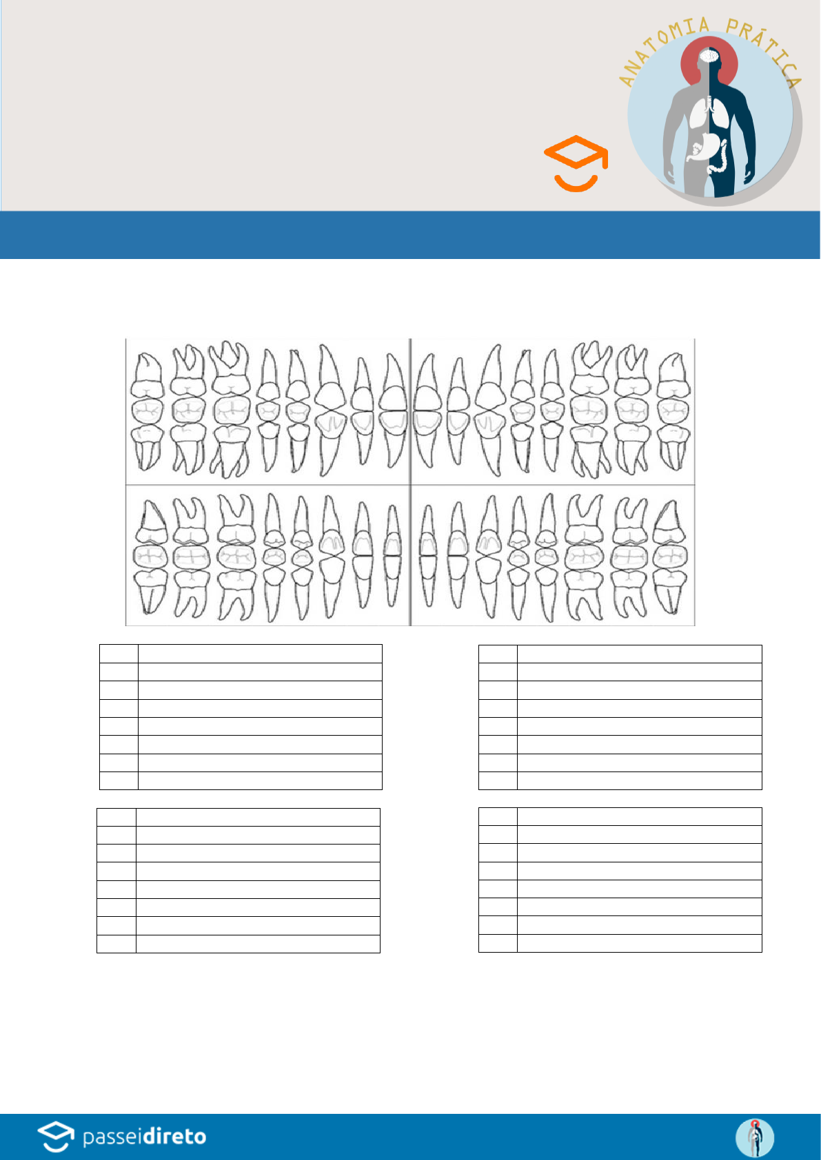 Odontograma Exercício XI Dr. Wedson Vila Nova 1. Preencha o esquema abaixo de acordo com a nomenclatura dos dentes abaixo: 11 12 13 14 15 16 17 18 41 42 43 4 45 46 47 48 21 22 23 24 25 26 27 28 31 32 33 34 35 36 37 38 18 17 16 48 47 46 45 44 43 42 12 13 14 15 11 41 31 32 22 21 23 33 34 18 24 25 26 27 28 35 18 36 18 37 18 38 18 SIGA MEU PERFIL NO PASSEI DIRETO https://www.passeidireto.com/perfil/anatomiapratica INSCREVA-SE NO CANAL ANATOMIA PRÁTICA https://www.passeidireto.com/perfil/anatomiapratica https://www.passeidireto.com/perfil/anatomiapratica/listas https://www.youtube.com/channel/UCmaNIaQJbkmJwhPBmccnYtw