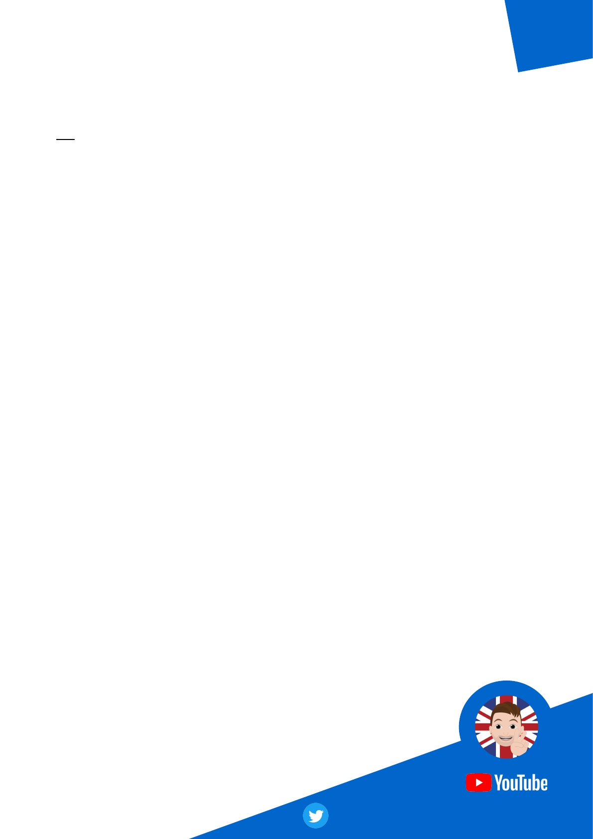 COMPARATIVES 1) Complete the sentences with a comparative form of an adjective or an adverb from the list. fast / bad / far / good / hot / difficult / fluent / long a) Ferraris are __________ than Fiats. b) The weather in Kenya is __________ than in Italy. c) Lucy’s brother can speak English __________ than her. d) The Finnish ice hockey team is __________ than the Italian one. e) The journey home by train takes __________ than by plane. f) New York is __________ from Sydney than Hong Kong. g) Hungarian is __________ than Spanish. h) Our team played __________ than the other one, that’s why we lost. 2) Rewrite the sentences from exercise 1) using “as + adj / adv + as” so that they mean the same. Use the same adjective / adverb. a) __________________________________________________ b) __________________________________________________ c) __________________________________________________ d) __________________________________________________ e) __________________________________________________ f) __________________________________________________ g) __________________________________________________ h) __________________________________________________ For the video lesson visit: bit.ly/filip_a2b1_comp Learn English with Filip@filipbigos A2 - B1 Fiats are not as fast as Ferraris. http://bit.ly/filip_a2b1_comp ANSWER KEY 1) Complete the sentences with a comparative form of an adjective or an adverb from the list. a) Ferraris are faster than Fiats. b) The weather in Kenya is hotter than in Italy. c) Lucy’s brother can speak English more fluently than her. d) The Finnish ice hockey team is better than the Italian one. e) The journey home by train takes longer than by plane. f) New York is further from Sydney than Hong Kong. g) Hungarian is more difficult than Spanish. h) Our team played worse than the other one, that’s why we lost. 2) Rewrite the sentences from exercise 1) using “as + adj / adv + as” so that they mean the same. Use the same adjective / adverb. a) Fiats are not as fast as Ferraris. b) The weather in Italy is not as hot as in Kenya. c) Lucy cannot speak as fluently as her brother. d) The Italian ice hockey team is not as good as the Finnish one. e) The journey home by plane doesn’t take as long as by train. f) Hong Kong isn’t as far from Sydney as New York. g) Spanish isn’t as difficult as Hungarian. h) The other team didn’t play as badly as ours, that’s why we lost. For the video lesson visit: bit.ly/filip_a2b1_comp Learn English with Filip@filipbigos A2 - B1 http://bit.ly/filip_a2b1_comp
