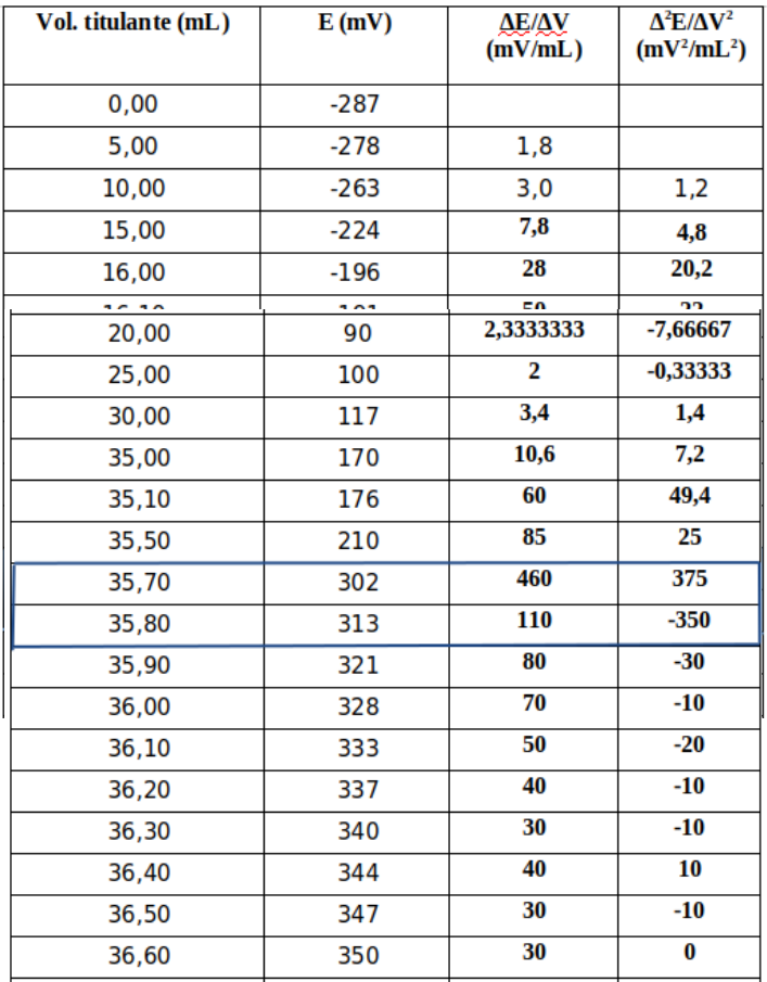 QUÍMICA ANALÍTICA QUANTITATIVA II RELATÓRIO DE AULA EXPERIMENTAL PRÁTICA 2: TITULAÇÃO POTENCIOMÉTRICA DE PRECIPITAÇÃO 1. Objetivo: Determinação de íons cloreto e íons iodeto presentes em uma solução, através da titulação potenciométrica de precipitação pela adição de AgNO3. 2. Parte experimental (materiais, reagentes e equipamentos): - Eletrodo indicador: Eletrodo de fio de prata; - Eletrodo de referência: Calomelano (saturado) com dupla junção líquida (KNO3 10%); - Bureta A 50,00 mL; - Pipeta volumétrrica; - Becker; - Agitador magnético Mod. 257; - Barra magnética para agitar soluções; - Voltímetro eletrônico Digimed; - Solução problema 50,00 mL; - Solução padrão de AgNO3 0,0810 mol. L-1. Tabela 1- Dados de titulação potenciométrica de titulação de precipitação 1) Com os dados da Tabela 1: Figura 1. Curva de titulação potenciométrica de precipitação Figura 2. Curva da primeira derivada da titulação potenciométrica de precipitação Figura 3. Curva da segunda derivada da titulação potenciométrica de precipitação Figura 4. Gráfico da semelhança de triângulos para a segunda derivada da curva de titulação potenciométrica no ponto de equivalência, para o íon iodeto Cálculos: - Semelhança de triângulos: - Volume no ponto de equivalência para o íon iodeto: 16,70 + 0,0462 = 16,75 mL - Correção do volume do ponto de equivalência para o íon iodeto: - Concentração de iodeto na amostra utilizada: C iodeto x V amostra = C AgNO3 x V AgNO3 C iodeto x 59,97 mL = 0,0810 mol. L-1 x 16,86 mL C iodeto = 0,0228 mol. L-1 Figura 5. Gráfico da semelhança de triângulos para a segunda derivada da curva de titulação potenciométrica no ponto de equivalência, para o íon cloreto Cálculos: - Semelhança de triângulos: - Volume no ponto de equivalência para o íon cloreto: 35,70 + 0,0517 = 35,75 mL - Correção do volume do ponto de equivalência para o íon cloreto: - Concentração de iodeto na amostra utilizada: C cloreto x V amostra = C AgNO3 x (V AgNO3 para cloreto - V AgNO3 para iodeto) C cloreto x 59,97 mL = 0,0810 mol. L-1 x (35,98 mL – 16,86 mL) C cloreto = 0,0258 mol. L-1 2) Responda 2.1) A titulação potenciométrica de precipitação pode ser aplicada para qualquer substância? Justifique sua resposta. Quando se utiliza AgNO3 como titulante, é possível determinar tanto haletos (Cl-, Br-, I-), quanto pseudohaletos (SCN-, CN-, CNO-), mercaptanas (grupos tióis SH) e ácidos graxos (R-COOH). A técnica em questão é melhor empregada quando as reações envolvidas formam produtos de baixa solubilidade (Kps menor do que 10-5) para que o salto do potencial possa ser bem visualizado no ponto final. É preciso garantir que o precipitado formado não volte para a solução e seja titulado novamente com o aumento do volume de titulante adicionado, promovendo um erro na determinação da concentração da substância. 2.2) Um analista poderia utilizar o eletrodo Ag/AgCl com eletrodo de referência? Um eletrodo de referência não pode ser sensível às espécies que se deseja determinar em solução, mantendo seu potencial constante durante a medida. O eletrodo Ag/AgCl reage com vários compostos bioquímicos, o que restringe sua utilização como eletrodo de referência. Pode ser utilizada uma junção líquida para fazer uma interface entre os dois lados. Pode ser mais adequado que se utilize eletrodo Ag/AgCl como eletrodo indicador do que como eletrodo de referência em titulações potenciométricas de precipitação. 2.3) Um analista na titulação potenciométrica de precipitação agitou suavemente a solução, e determinou que a concentração do analito em questão era de 0,0165 mol x L-1. Qual a sua opinião, esse resultado está correto? Justifique sua resposta. O resultado obtido provavelmente está incorreto. O analista deve realizar o experimento novamente, mas com o cuidado de agitar vigorosamente a solução para garantir que os íons não estejam adsorvidos na superfície do precipitado formado (efeito de dupla camada) em vez de reagir com o titulante. Devemos evitar o efeito de dupla camada para que os íons em solução estejam disponíveis para reagir com o titulante e assim determinar a concentração correta do analito. 2.4) Sabendo que os Kps das substâncias a serem determinadas em uma mesma solução, são de 5,5 x 10 -14 e 1,0 x 10 -16, poderia ser aplicada a técnica de titulação potenciométrica de precipitação para a determinação de ambos analitos em uma única titulação? Justifique sua resposta. Razão entre os Kps: 1,0 x 10-16/ 5,5 x 10-14 = 1,8 x 103 < 105. As substâncias apresentam uma razão menor do que 105 entre seus Kps. Não podemos empregar a técnica para determinar as duas substâncias em uma única titulação pois o salto de potencial não estará bem definido para cada analito, haverá uma coprecipitação, isto é, quando a substância de Kps 5,5 x10-14 começar a precipitar, ainda haverá quantidade significativa da substância que começou a precipitar primeiro, com Kps 1,0 x 10-16. Deve-se montar uma célula para determinação de cada substância em soluções distintas, com eletrodo indicador sensível para cada analito e eletrodo de referência específicos, para que o salto de potencial indique o ponto final em cada titulação sem a interferência do outro analito.