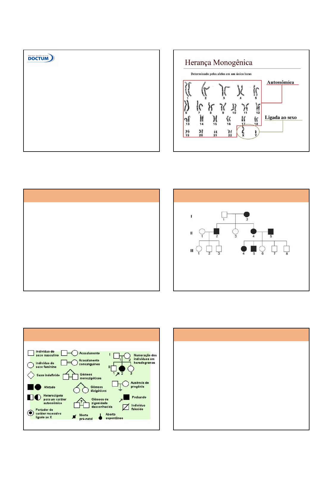 13/03/2020 1 Heredograma Prof. Larissa Kretli Winkelströter Faculdades Unificadas de Teófilo Otoni Curso de Medicina Veterinária Disciplina Genética Animal 2020 Heredograma • Representação de UMA determinada característica em uma família. • Representação gráfica das relações de parentescos entre indivíduos • Também chamado de: Genealogia, Árvore Genealógica, Pedigree • Comportamento de um gene em uma família • Observar dominância e recessividade • Parentesco Heredograma Heredograma Tipos de Herança • HERANÇA AUTOSSÔMICA DOMINANTE • HERANÇA AUTOSSÔMICA RECESSIVA • HERANÇA LIGADA AO SEXO (X) – RECESSIVA • HERANÇA LIGADA AO SEXO (X) – DOMINANTE 1 2 3 4 5 6 13/03/2020 2 Herança autossômica dominante • Aparece em todas as gerações • A característica aparece igualmente entre homens e mulheres • Geralmente o indivíduo afetado tem pelo menos um genitor afetado • Geralmente a metade dos filhos apresentam a característica • Pai afetado com filho homem afetado Herança autossômica dominante Herança autossômica dominante Outra dica... 1) Identifique indivíduos semelhantes que possuam filhos diferentes, estes pais serão heterozigotos. 2) A partir disso conseguimos identificar o tipo de herança Herança autossômica dominante Herança autossômica recessiva • Não aparece em todas as gerações • Indivíduos heterozigotos são chamados de portadores do gene causador da doença • Genitores aparentados (endogamia) aumentam a probabilidade da homozigose recessiva • Maior parte das doenças seguem esse tipo de herança Herança autossômica recessiva 7 8 9 10 11 12 13/03/2020 3 Herança autossômica recessiva Herança autossômica recessiva Herança ligada ao sexo (X) – Recessiva • Quase exclusivamente homens afetados • Transmissão de mulheres não afetadas (portadoras) para seus filhos • Transmissão homem-homem não é observada • Homens afetados pode transmitir para seus netos através de suas filhas Herança ligada ao sexo (X) – Recessiva Herança ligada ao sexo (X) – Recessiva Herança ligada ao sexo (X) – Recessiva 13 14 15 16 17 18 13/03/2020 4 Herança ligada ao sexo (X) – Dominante • Filhas de homens afetados são sempre afetadas • Filhos de homens afetados nunca herdam o distúrbio • Mulheres afetadas podem transmitir para a prole dos dois sexos • Excesso de mulheres afetadas nos heredogramas Herança ligada ao sexo (X) – Dominante Herança ligada ao sexo (X) – Dominante Exercícios 1. Qual o tipo de herança apresentada no heredograma abaixo? 2. Qual o tipo de herança representada abaixo e qual o genótipo de cada indivíduo? 3 19 20 21 22 23 24 13/03/2020 5 4 5 6 25 26 27