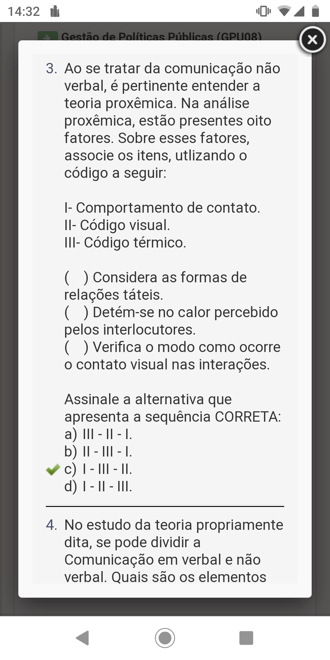 Ao se tratar da comunicacao nao verbal, e pertinente entender a teoria proxemica. Na analise proxemica, estao presentes oito fatores. Sobre esses fatores, associe OS itens, utlizando O codigo a seguir: I- Comportamento de contato. II- Codigo visual. III- Codigo termico. ( ) Considera as formas de relacoes tateis. ( ) Detem-se no calor percebido pelos interlocutores. ( ) Verifica O modo como ocorre O contato visual nas interacoes. a) III - II - I. b) II - III - I. c) I - III - II. d) I - II - III.