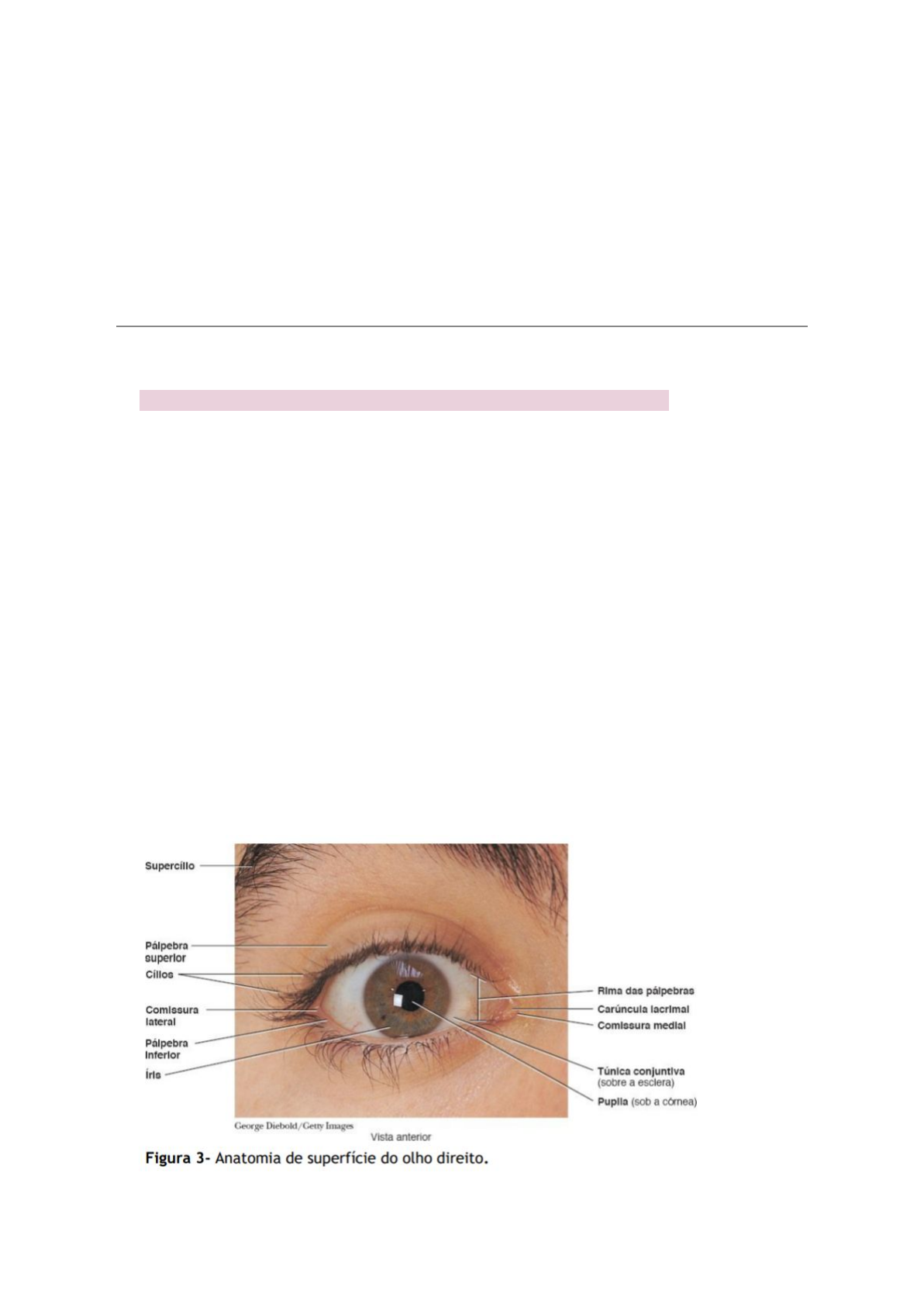 TUTORIA SP 3 Objetivos: 1. Identificar e compreender a anatomia do sistema visual: (Estruturas relacionadas à visão) As estruturas oculares acessórias incluem as pálpebras, os cílios, os supercílios, o aparelho lacrimal (produtor de lágrimas) e os músculos extrínsecos do bulbo do olho. Pálpebras As pálpebras superiores e inferiores fecham os olhos durante o sono, os protegem da luz excessiva e de objetos estranhos e espalham secreções lubrificantes sobre o bulbo do olho (Figura 3). A pálpebra superior é mais móvel do que a inferior e contém, em sua região superior, o músculo levantador da pálpebra superior. O espaço entre as pálpebras superior e inferior que expõe o bulbo do olho é a rima das pálpebras. Seus ângulos são conhecidos como comissura lateral das pálpebras, que é mais estreita e mais próxima do osso temporal, e comissura medial das pálpebras, que é mais larga e mais próxima do osso nasal. Na comissura medial, encontra-se uma pequena elevação avermelhada, a carúncula lacrimal, que contém glândulas sebáceas e glândulas sudoríferas (Figura 3). O material esbranquiçado que algumas vezes se acumula na comissura medial do olho provém dessas glândulas. Da parte superficial para profunda, cada pálpebra consiste em epiderme, derme, tela subcutânea, fibras do músculo orbicular do olho, tarso, glândulas tarsais e túnica conjuntiva (Figura 4). O tarso é uma prega espessa de tecido conjuntivo, que dá forma e sustentação às pálpebras. Inserida em cada tarso, encontra-se uma fileira de glândulas sebáceas modificadas e alongadas, conhecidas como glândulas tarsais ou glândulas de Meibomio, que secretam um líquido que ajuda as pálpebras a não aderir uma à outra. A infecção das glândulas tarsais produz um tumor ou cisto da pálpebra, denominado calázio. A túnica conjuntiva é uma túnica mucosa protetora e fina, composta de epitélio estratificado pavimentoso não queratinizado, com numerosas células caliciformes, que é sustentada por tecido conjuntivo frouxo (areolar). A túnica conjuntiva da pálpebra reveste a face interna das pálpebras, enquanto a túnica conjuntiva do bulbo passa das pálpebras para a superfície do bulbo do olho. Sobre a esclera, a túnica conjuntiva é vascular; entretanto, sobre a córnea (uma região transparente que forma a face anterior externa do bulbo do olho), a túnica conjuntiva perde o seu componente de tecido conjuntivo e consiste em epitélio avascular claro. Tanto a esclera quanto a córnea serão discutidas adiante. A dilatação e a congestão dos vasos sanguíneos da túnica conjuntiva do bulbo, em consequência de irritação local ou infecção, constituem as causas de olhos vermelhos. Cílios e supercílios Os cílios, que se projetam da margem de cada pálpebra, e os supercílios, que formam um arco transversalmente acima das pálpebras superiores, ajudam a proteger os bulbos dos olhos de objetos estranhos, da transpiração e de raios diretos do sol. As glândulas sebáceas na base dos folículos pilosos dos cílios, denominadas glândulas ciliares sebáceas, liberam um fluido lubrificante nos folículos. A infecção dessas glândulas, habitualmente causada por bactérias, provoca uma tumefação dolorosa e cheia de pus, denominada terçol (hordéolo). Aparelho lacrimal O aparelho lacrimal é um grupo de estruturas que produzem e drenam líquido lacrimal ou lágrimas. As glândulas lacrimais que produzem lágrimas possuem, cada uma delas, aproximadamente o tamanho e a forma de uma amêndoa com casca. As glândulas são inervadas por fibras parassimpáticas do nervo facial (NC VII). As lágrimas distribuemse pela superfície do bulbo do olho, provenientes de 6 a 12 dúctulos excretores (Figura 5). A partir desses dúctulos, as lágrimas passam medialmente sobre a face anterior do bulbo do olho para entrar em duas pequenas aberturas, denominadas pontos lacrimais. Em seguida, as lágrimas passam para dentro de dois ductos, os canalículos lacrimais superior e inferior, que levam até o saco lacrimal (dentro da fossa lacrimal) e, em seguida, até o ducto lacrimonasal. Esse ducto transporta o líquido lacrimal até a cavidade nasal, imediatamente inferior à concha nasal inferior, onde se mistura com muco. A infecção dos sacos lacrimais é denominada dacriocistite. Em geral, é causada por uma infecção bacteriana e resulta em bloqueio dos ductos lacrimonasais. O líquido lacrimal é uma solução aquosa contendo sais, uma certa quantidade de muco e lisozima, uma enzima bactericida protetora. O líquido protege, limpa, lubrifica e umedece o bulbo do olho. Após ser secretado, o líquido lacrimal espalha-se medialmente pela superfície do bulbo do olho pelo piscar das pálpebras. Cada glândula produz cerca de 1 mℓ de líquido lacrimal por dia. Normalmente, as lágrimas desaparecem tão rapidamente quanto são produzidas, seja por evaporação ou pela sua passagem dentro dos canais lacrimais e, em seguida, na cavidade nasal. Entretanto, se uma substância irritante entrar em contato com a conjuntiva, as glândulas lacrimais são estimuladas a produzir muita secreção, com consequente acúmulo de lágrimas. Trata-se de um mecanismo protetor, visto que as lágrimas diluem e removem a substância irritante. Ocorre também lacrimejamento dos olhos quando uma inflamação da túnica mucosa do nariz causa obstrução dos ductos lacrimonasais e bloqueia a drenagem das lágrimas, conforme observado no resfriado. Os seres humanos são singulares na expressão das emoções, tanto de felicidade quanto de tristeza, pelo choro. Em resposta a um estímulo parassimpático, as glândulas lacrimais produzem líquido lacrimal em excesso, que pode extravasar pelas margens das pálpebras e até mesmo encher a cavidade nasal com líquido. Por conseguinte, o choro frequentemente produz coriza. Músculos extrínsecos do bulbo do olho Os olhos, posicionados na frente da face, estão localizados nas depr