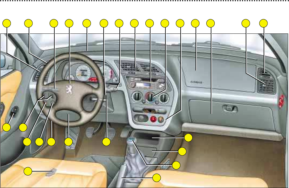 1 25 24 20 19 18 14 15 16 17 2 3 4 5 7 8 9 10 11 12 13 1 2 21 6 2223 2 O SEU 306 NUM RELANCE O SEU 306 NUM RELANCE 3 1 - Ventilador lateral orientável. 2 - Difusores de desembaciamento de vidros laterais. 3 - Comando da iluminação, faróis de nevoeiro* e buzina. 4 - Volante Airbag*. 5 - Difusores de desembaciamento do pára-brisas. 6 - Chave anti-roubo e ignição. 7 - Comando dos limpa-vidros e lava-vidros. 8 - Ventiladores centrais orientáveis. 9 - Rádio*. 10 - Comando de aquecimento / Ventilação Ar condicionado*. 11 - Comandos : Isqueiro, Luzes de emergência, Desembaciamento do óculo traseiro e dos retrovisores. 12 - Airbag passageiro*. 13 - Porta-luvas. 14 - Compartimento de arrumos. 15 - Cinzeiro. 16 - Alavanca de velocidades. 17 - Travão de mão. 18 - Telecomando rádio*. 19 - Caixa de fusíveis. 20 - Comando de abertura do capô do motor. 21 - Comando de abertura portinhola do tampão de combustível*. 22 - Comando de desactivação do airbag passageiro. 23 - Comando de trancamento temporário dos elevadores de vidros traseiros. 24 - Ajuste em altura dos faróis - Reóstato de iluminação dos instrumentos de bordo*. 25 - Comando eléctrico dos retrovisores*. - Comandos elevadores eléctricos de vidros*. * Consoante o equipamento. ** O SEU 306 NUM RELANCE 6 OS AIRBAGS FRONTAIS Neutralização do airbag passageiro Introduzir a chave de ignição no comando 1 e girá-la: – posição “ON” , airbag passageiro activado, – posição “OFF” , airbag passageiro desactivado Controlo de funcionamento É assegurado por um dos visores integrados no mostrador de bordo. Se o airbag passageiro estiver activado ou se o seu veículo não estiver equipado com airbag passageiro, a luz avisadora acende durante 6 segundos ao ligar a ignição. Se o airbag passageiro estiver neutralisado, um dos visores fica aceso. Em todos os casos, se a luz piscar, consultar o seu Representante Autorizado PEUGEOT. O TELECOMANDO Um impulso no botão A permite o trancamento à distância das portas e da mala. Um impulso no botão B permite o destrancamento. AS CHAVES As chaves permitem, a partir da porta do condutor, o trancamento ou o destrancamento das portas e da mala. Precauções relativas ao airbag passageiro Veículo equipado com um comando de neutralização: - desactivar o airbag se instalar um banco para criança de costas para a estrada, - activar o airbag durante o transporte de um adulto. Veículo não equipado com o comando de desactivação: - não instalar bancos de crianças de costas para a estrada no banco passageiro da frente. Em todos os casos, não pôr os pés ou um objecto qualquer sobre o painel de bordo. ** Conforme a versão. A B 108 O SEU 306 NUM RELANCE 5 O ARRANQUE As quatro posições da chave de ignição no trinco de arranque: “ S ” para STOP: a ignição está desligada. “ A ” para Acessórios: a ignição está desligada mas os acessórios podem funcionar. “ M ” para Marcha: a ignição está ligada. “ D ” para arranque: o motor de arranque é accionado. Anti-roubo de direcção Antes de arrancar, destravar a direcção manobrando, se necessário, ligeiramente o volante ao mesmo tempo que a chave. É aconselhável desembraiar durante o accionamento do motor de arranque para facilitar o começar a trabalhar do motor. Arranque de um motor a gasolina Não tocar no acelerador. Accionar o motor de arranque sem largar a chave até o motor começar a trabalhar. ARRANQUE DE UM MOTOR DIESEL Não tocar no acelerador. Rodar a chave até à posição “M”. Se a temperatura for suficiente, a luz indicadora não se acende e pode arrancar imediatamente. Se a luz indicadora acender, aguardar a sua extinção antes de accionar o motor de arranque. Particularidade motor HDI Se o motor se for abaixo, é necessário colocar a chave na posição "S" antes de tornar a arrancar. Nunca embalar um motor frio. Nunca pôr o motor a trabalhar num local fechado. Não fazer nenhuma modificação no anti-roubo da direcção. O SEU 306 NUM RELANCE 4 Cartão confidencial O cartão contém o código de identificação necessário para qualquer intervenção a efectuar no sistema pelo seu Represen- tante Autorizado PEUGEOT. Este código está tapado por uma película que só deve ser retirada em caso de necessidade. Conservar este cartão em lugar seguro mas nunca dentro da viatura. O ANTI-ARRANQUE ELECTRÓNICO Bloqueia o sistema de controlo do motor alguns momentos depois do corte da ignição e impede o arranque do veículo por arrombamento. Funcionamento Cada chave contém uma pastilha electrónica que possui um código particular. Quando se liga a ignição, o código da chave é reconhecido pelo sistema anti-arranque electrónico e o arranque é possível. Se a chave não possuir código ou se o código for diferente dos memorizados no sistema, o motor não arranca. Chave suplementar Podem ser memorizadas até 5 chaves. Se quiser obter uma chave suplementar ou substituir uma chave defeituosa, consulte imperativamente um Repre- sentante Autorizado PEUGEOT, munido com o cartão confidencial e com todas as chaves em sua posse. Ao comprar um veículo de ocasião: verificar se possui o cartão confidencial. mandar fazer uma memorização das chaves por um Representante Autorizado PEUGEOT para que fique seguro de que as chaves em sua posse são as únicas que permitem pôr o seu veículo em funcionamento. Não faça nenhuma modificação no sistema de anti-arranque electrónico PEUGEOT. 3 2 1 0 4 A B O SEU 306 NUM RELANCE 7 Varrimento automático O sistema adapta automaticamente a cadência de varrimento à intensidade da chuva. Depois do corte da ignição ou arranque na posição 1, é necessário reactivar esta função. Tem, então, duas possibilidades: - passar de 1 a 0 e depois voltar a 1 (visualização por um varrimento), - passar de 1 a 2 e depois voltar a 1 (visualização por dois varrimentos). OS COMANDOS NO VOLANTE ILUMINAÇÃO Luzes dianteiras (anel A) Limpa-vidros t