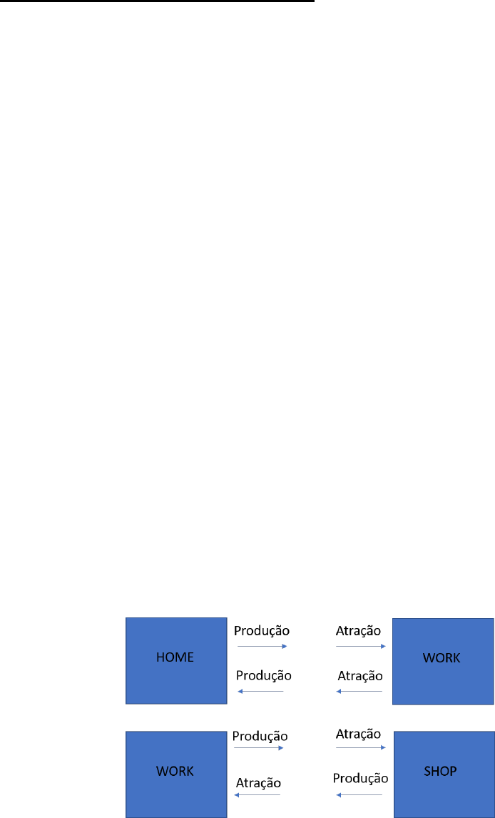 Exercício de modelagem 4 etapas: Algumas definições se tornam importante para o entendimento e uso de modelos de planejamento de transporte: Viagem – É um deslocamento de um sentido com um ponto de origem e um ponto de destino. Esse deslocamento pode ser feito por qualquer modal. Deslocamentos a pé com distância inferior a300 metros têm sido ignorados como também os feitos por crianças com idade inferior a 5 anos. Entretanto, essas últimas considerações estão se modificando devido a importância dada ao transporte ativo (não-motorizado) e a novos requisitos de entendimento das atividades com o objetivo de um plano de mobilidade mais sustentável. Viagens Home-based (HB) – São aquelas onde o domicílio do viajante é origem ou destino da viagem (H2W, W2H,H2O,O2H). Viagens Non-home-based (NHB) – São aquelas onde o domicílio não é nem origem ou destino da viagem. Viagens produzidas – São definidas como viagens que chegam ou saem de um domicílio nas viagens HB ou como as viagens que saem de um equipamento urbano nas viagens NHB. Viagens atraídas - São definidas como viagens que chegam ou que saem de um equipamento urbano nas viagens HB ou como as viagens que chegam em um equipamento urbano nas viagens NHB. Essas definições ficam ilustradas a seguir: fig(1) Das viagens HB, buscou-se informações sobre as viagens HW (H2W e W2H), pois essas viagens totalizam por volta de 70% das viagens urbanas diárias. Aplicando esses conceitos, considere uma área de estudo dividida em 5 zonas apresentada a seguir com seus centróides, distâncias e velocidades médias interzonais: Uma fig(2) Busca-se: 1. Determinar as viagens geradas/atraídas com origem ou destino em casa (viagens H) correspondentes a viagens HW (Home-Work). 2. Determinar as viagens geradas/atraídas com origem ou destino no local de trabalho (viagens W) correspondentes a viagens HW (Home- Work). 3. Determinar o número total de viagens realizadas com origem na zona j ( borda vertical) e com destino na zona k ( Borda horizontal) (H e W). 4. NOTA: São calculados os valores totais, para um determinado período ou para as horas de pico. Em resumo, o objetivo deste exercício é determinar as viagens originadas e destinadas das 5 zonas da área de estudo (bordas externas para o pico da manhã) representadas na matriz de viagens abaixo, através do método de análise de regressão, cujas as informações que comporão as fórmulas desta etapa são obtidas em pesquisas domiciliares e nos postos de trabalho. Procedimento (1): Determinar as viagens geradas/atraídas com origem ou destino em casa (viagens H) correspondentes a viagens HW (Home-Work). 1º Etapa – Pesquisa O/D de viagens Realização de pesquisa nas famílias (amostra representativa) sobre os seguintes aspectos: a) o número total diário de viagens baseadas em casa (H) durante o dia; fig(3) b) a proporção de viagens H no período p no total diário de viagens H (𝜏Hp); No total de viagens realizadas durante um dia do tipo H, há uma proporção dessas viagens que se realiza no período p. Por exemplo no período de pico ou na hora de pico da manhã. c) a proporção de viagens H com origem na habitação realizadas num determinado período p do dia (𝜃p); No período da manhã o mais natural é que este valor 𝜃p seja alto já que é nesse período que a maioria das pessoas se desloca para o trabalho. fig(3) d) dimensão da família entrevistada (número de membros); e) número de pessoas ativas (em idade de trabalhar) e população em idade escolar; f) número de automóveis; 2º Etapa - Determinação das viagens H com origem e destino em cada zona no período p • Número de viagens H em cada zona em todo o dia: jjH FXXXV jjj 332211 Onde: VHj: número médio diário de viagens H por zona. X1j, X2j, X3j: valores médios para x1 , x2 e x3 na zona j Fj : número de famílias residentes na zona j • Número de viagens H produzidas no período p tendo como origem e destino habitações da zona j: jj HHpHp VO • Número de viagens H produzidas no período p tendo como origem habitações da zona j jj HHppHp VHO )( Resumo: jj HHppHp VHO )( Procedimento (2): Determinar as viagens com origem ou destino no local de trabalho (viagens W) correspondentes a viagens HW (Home-Work). 1º Etapa – Pesquisa O/D de viagens Realização de pesquisas no local de trabalho ao número de viagens atraídas/geradas em zonas representativas da área de estudo. a) o número total diário de viagens durante o dia (W) b) a proporção de viagens no período p no total diário de viagens W (𝜏Wp) c) a proporção de viagens W com destino no trabalho realizadas num determinado período p do dia (p) No período da manhã o mais natural será que este valor p seja alto já que é nesse período que as pessoas se deslocam para o trabalho e não tanto o contrário. Naturalmente 1- p será a proporção de viagens W que têm origem no trabalho no período p. k HHpp k Hp VHD 1)( d) Número total de postos de trabalho na zona j e) Número de postos de trabalho de cada categoria: terciário, industrial, etc … f) Outras opções podem ser o número de m2 de área de escritórios, área comercial, etc … 2º Etapa - Determinação das viagens com origem e destino em cada zona no período p • Número de viagens W por cada zona em todo o dia jj XXV jW 2211 Onde: VWj: número médio diário de viagens W por zona. X1j, X2j: valores das variáveis para x1 e x2 na zona j. • Número de viagens W realizadas no período p tendo como destino o emprego na zona k kk WWppWp VWD )( • Número de viagens W realizadas no período p tendo como origem o emprego na zona k Resumo geral: A área de estudo representada esquematicamente na figura abaixo é constituída por cinco zonas, A, B, C, D e E, e possui duas zonas externas, Norte e Sul. Uma pesquisa efetuada com 20 famílias residentes nessa área forneceu a informação constante do Quadro 2. Zona Residentes Famílias Auto p/ fa