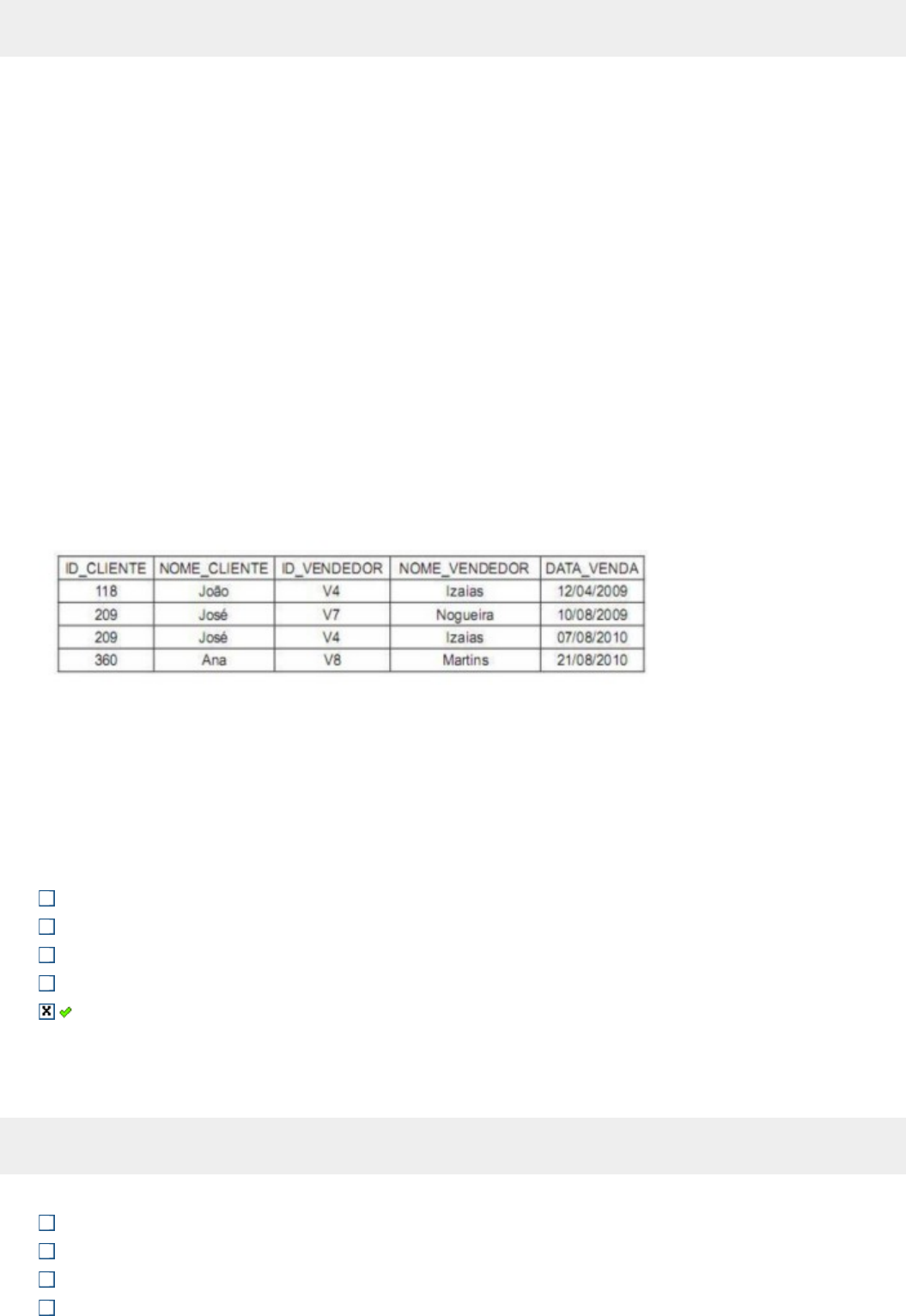 1 Questão Um projetista de banco de dados, novato na profissão, foi incumbido de criar um banco para armazenar dados sobre clientes de uma empresa, contendo identificador e nome; vendedores dessa empresa, também com identificador e nome; e data da realização das vendas. Esse projetista decidiu criar uma única tabela, cujo esquema é apresentado abaixo. CREATE TABLE VENDAS( ID_CLIENTE INTEGER, NOME_CLIENTE VARCHAR(60), ID_VENDEDOR CHAR(2), NOME_VENDEDOR VARCHAR(60), DATA_VENDA DATE ); Após criar a tabela, o projetista inseriu alguns registros nela, de forma que o estado final ficou como o descrito na imagem abaixo: Ao analisar a solução proposta pelo novato, outro projetista, mais experiente, informou que, em virtude da tabela não estar adequadamente normalizada, algumas operações em SQL, realizadas sobre ela, podem levar o banco de dados a um estado inconsistente ou à perda de informações. Quais são essas operações? DELETE e INSERT, apenas. INSERT e SELECT, apenas. DELETE e SELECT, apenas. UPDATE e DELETE, apenas. UPDATE, DELETE e INSERT. Respondido em 04/10/2020 10:23:45 2 Questão A constraint Foreign Key possui no SQL Ansi quais regras? On Delete Set Null / On Delete Set Default / On Update Set Null / On Update Set Default On Delete Set Null / On Delete Restrict / On Update Set Null / On Update Delete On Delete Cascade / On Delete Set Null / On Update Cascade / On Update Set Null On Delete Cascade / On Delete Restrict / On Delete Set Null / On Update Cascade / On Update Delete / On Update Set Null On Delete Cascade / On Delete Restrict / On Update Cascade / On Update Delete Respondido em 04/10/2020 10:23:50 3 Questão Qual dos comandos SQL abaixo efetua uma alteração desabilitando o recebimento de cesta básica para os funcionários que ganham mais que R$3.000,00? UPDATE funcionario SET funcionario_cestabasica=false WHERE funcionario_salario>3001 UPDATE funcionario SET funcionario_cestabasica=false WHERE funcionario_salario>3000 UPDATE funcionario SET funcionario_cestabasica=false WHERE funcionario_salario>=3000 UPDATE funcionario SET funcionario_cestabasica=false WHERE funcionario_salario<3000 UPDATE funcionario SET funcionario_cestabasica=false Respondido em 04/10/2020 10:23:53 4 Questão Em um banco de dados, que comando SQL é utilizado para eliminar uma tabela? DELETE DROP INSERT UPDATE ALTER Respondido em 04/10/2020 10:23:56 5 Questão São comandos da categoria de Definição de Dados (DDL): INSERT / UPDATE / DELETE SELECT COMMIT / ROLLBACK CREATE / ALTER / DROP GRANT / REVOKE Respondido em 04/10/2020 10:23:59 6 Questão Para o comando apresentado a seguir, indique a alternativa que apresenta o resultado obtido com a sua execução: DROP TABLE Funcionario; Todos os registros da tabela Funcionario são excluídos. O banco de dados Funcionario é excluído. A tabela Funcionario é removida do banco de dados. O banco de dados Funcionario é criado. A tabela Funcionario é criada no banco de dados. Respondido em 04/10/2020 10:24:02 7 Questão São comandos DDL CREATE, ALTER, DROP INSERT, UPDATE, DELETE CREATE, ALTER, DELETE CREATE, UPDATE, DELETE INSERT, UPDATE, DROP Respondido em 04/10/2020 10:24:03 8 Questão Qual dos comandos SQL abaixo pode ser utilizado para incluir na definição da tabela aluno o atributo CPF com 11 caracteres? add into aluno cpf char(11); alter table aluno add cpf char(11); update table aluno insert cpf char(11); alter table aluno insert cpf char(11); insert into aluno cpf char(11);