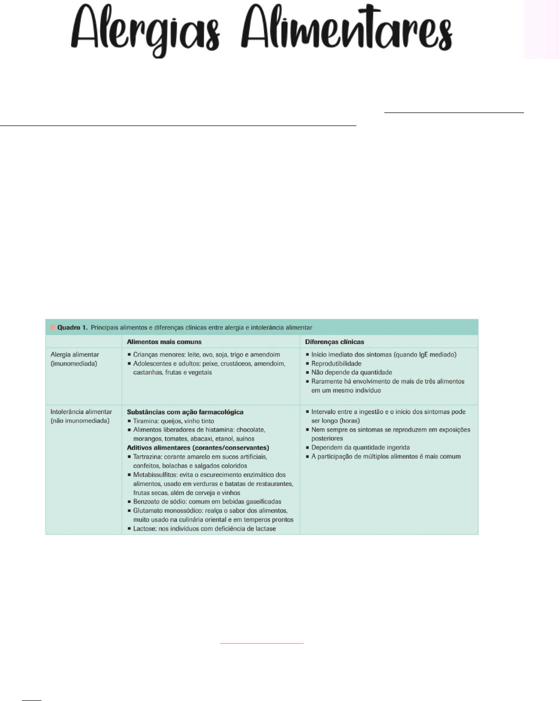 O termo alergia alimentar muitas vezes é usado de maneira imprópria, é importante compreendê-lo corretamente, pois existem implicações diagnósticas, terapêuticas e prognósticas. A alergia alimentar é apenas um dos tipos de reações adversas a alimentos. Reação adversa é qualquer resposta anormal do organismo causada pela ingestão de um alimento. As reações adversas a alimentos são inicialmente divididas em tóxicas e não tóxicas. · As reações tóxicas dependem de fatores inerentes ao alimento, como as toxinas produzidas na deterioração, afetando qualquer indivíduo que ingira o alimento em quantidade suficiente para produzir sintomas. · As reações não tóxicas dependem da suscetibilidade individual e podem ser divididas em reações imunomediadas (alergia alimentar) e não imunomediadas (intolerância alimentar). Atualmente, tem sido sugerido o termo hipersensibilidade alimentar para abranger tanto as reações imunomediadas, chamadas hipersensibilidade alimentar alérgica, quanto as não imunomediadas, denominadas hipersensibilidade alimentar não alérgica. A intolerância alimentar pode decorrer de deficiências enzimáticas (intolerância a lactose), reatividade anormal a certas substâncias presentes nos alimentos (aditivos alimentares) ou mecanismos desconhecidos. A prevalência estimada de reações adversas a alimentos é de 12 a 20% em adultos. Entretanto, quando se considera apenas a prevalência das reações imunomediadas, ou seja, de alergia alimentar, a estimativa cai para aproximadamente 6 a 8% nos lactentes e até 4% nos adultos, sendo mais prevalente nos atópicos. No Brasil, as informações epidemiológicas são restritas, porém o crescente número de alergias alimentares é nitidamente percebido por especialistas da área. ETIOLOGIA Em tese, qualquer alimento pode ser causa de alergia alimentar, mas, apesar disso, um pequeno número de alimentos é responsável pela maioria das reações alérgicas induzidas por estes. Nos EUA, leite, ovo, soja, trigo e amendoim correspondem a 90% das reações de hipersensibilidade em crianças, enquanto peixe, crustáceos, amendoim e castanhas correspondem a 85% das reações de hipersensibilidade em adolescentes e adultos. No Brasil, dados sugerem um padrão de sensibilidade semelhante ao norte-americano, porém com a inclusão do milho e menor ação do amendoim. Tem sido observado aumento nas reações alérgicas a frutas e a sementes, como o gergelim. As proteínas alergênicas de muitos alimentos têm sido identificadas, isoladas, sequenciadas e clonadas. Com a identificação de muitas semelhanças em nível molecular de certas proteínas alergênicas, foi possível compreender porque certos pacientes alérgicos a pólen apresentavam sintomas orais quando ingeriam determinadas frutas e vegetais, conhecida como síndrome de alergia oral. Outro exemplo de reação cruzada ocorre entre o látex e certas frutas ou vegetais, pois pacientes alérgicos a látex podem apresentar sintomas quando ingerem banana, abacate, mamão, manga, kiwi, batata ou tomate. Em algumas pessoas, aditivos alimentares podem causar uma reação que se assemelha a uma reação alérgica, sem o ser. Por exemplo, alguns conservantes (como metabissulfito) e corantes (como tartrazina, um corante amarelo utilizado nos doces, refrigerantes e outros alimentos) podem provocar sintomas, como asma e urticária. Da mesma maneira, a ingestão de certos alimentos, como queijo, vinho e chocolate, desencadeia enxaquecas em algumas pessoas. FISIOPATOLOGIA A alergia alimentar pode envolver um mecanismo IgE mediado, não IgE mediado ou mais que um mecanismo imunológico pode estar envolvido. ♥ MECANISMO IGE MEDIADO (HIPERSENSIBILIDADE IMEDIATA): Em pacientes geneticamente predispostos, a falha no desenvolvimento ou a quebra do mecanismo de tolerância oral resulta em produção excessiva de anticorpos IgE específicos para determinado alimento. Após a sensibilização com formação da IgE específica, este anticorpo circula pelo organismo e liga-se a receptores de alta afinidade em mastócitos e basófilos. Nos próximos contatos com o alérgeno, este anticorpo se unirá a IgE que se ligou aos mastócitos e basófilos, promovendo a liberação de mediadores como histamina, prostaglandinas e leucotrienos, que são os responsáveis pelas manifestações clínicas. Estas reações geralmente ocorrem dentro de minutos ou até 2 horas após a ingestão do alimento. As reações mediadas por IgE a alérgenos de carboidratos em carnes, um tipo de reação relatada principalmente em adultos, representam uma exceção a esse padrão temporal, uma vez que essas reações começam quatro a seis horas após a ingestão. Picadas repetidas de carrapatos ou picadas de água-viva podem causar sensibilização a carnes vermelhas e certos produtos de soja. Tem um início agudo, geralmente se desenvolve durante a infância e ocorre mais frequentemente em pessoas com forte história familiar de atopia. ♥ MECANISMO NÃO IGE MEDIADO: As alergias alimentares não mediadas por IgE apresentam-se como sintomas mais subagudos e / ou crônicos que são tipicamente isolados no trato gastrointestinal e / ou pele. São diagnosticadas geralmente pela boa resposta à eliminação do alérgeno da dieta e algumas doenças necessitam de biópsia. Evidências sugerem que estas reações sejam mediadas por células (reações de hipersensibilidade tipo IV). Embora raras, reações de hipersensibilidades tipos II e III também já foram descritas. Se manifesta gradualmente e é crônica; ela é mais comum em bebês e crianças. Os distúrbios alérgicos alimentares não mediados por IgE exclusivos incluem principalmente: · Síndrome de enterocolite induzida por proteína alimentar (FPIES; todo o trato gastrointestinal) · Enteropatia induzida por proteína alimentar (intestino delgado) · Proctite e proctocolite induzida por proteína alimentar (reto e cólon) · Hemossiderose