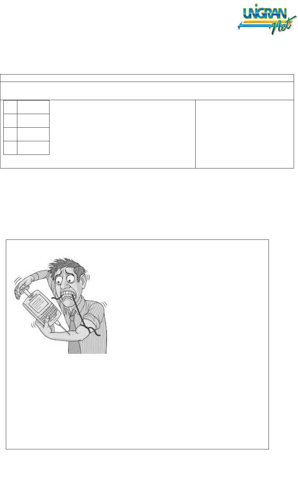Curso: Engenharia de Software Disciplina: Linguagem e Argumentação Professora: Andréia de Oliveira A. Iguma 01 E 02 B 03 A 04 D Nome: ANDRÉ BATISTA VIEIRA RGM:123.860 Portfólio 03 – Pessoal, As questões abaixo têm como objetivo aferir o nível de interpretação e compreensão. Tentei partir da área de vocês. Qualquer dificuldade, me escrevam. Abraços, Questão 01 – Nomofobia: o vício em celular agora é uma doença Você é daqueles que não conseguem desgrudar do celular nem por um minuto do dia? Está sempre ligado nas redes sociais onde quer que esteja? Saiba que você pode estar sofrendo de nomofobia, termo criado na Inglaterra para designar as pessoas compulsivas por esse tipo de conexão. A palavra é uma abreviação de “no mobile phobia” que, literalmente, significa o medo de ficar sem celular. Segundo pesquisas da empresa de segurança SecurEnvoy, cerca de 76% dos jovens britânicos entre 18 e 24 anos sofrem do mal e alguns chegam a ter dois ou mais aparelhos para garantir que sempre estarão online. Segundo Damien Douani, especialista em novas tecnologias, a chegada dos smartphones e dos planos de internet ilimitada fizeram com que a incidência do problema expandisse em todo o mundo. A presença do Google também em celulares e a possibilidade de sempre se encontrar resposta para tudo são apenas dois potencializadores, explicou em entrevista ao site do jornal Folha de S. Paulo. Os franceses também exibiram resultado semelhante. De acordo com pesquisa realizada pela Mingle, 22% dos jovens do país acham impossível ficar um dia inteiro sem celular. Números semelhantes se repetem em diversos países da Europa. Segundo o escritor francês Phil Marso, que redigiu um livro inteiro utilizando apenas SMSs, o uso constante dos smartphones e redes sociais gera uma grande vontade de estar sempre inteirado sobre tudo o que está acontecendo. O usuário acaba ficando nervoso e impaciente, podendo desenvolver problemas cardíacos. (Disponível <http://www.tecmundo.com.br/saude/21930-nomofobia-o-vicio-em-celular-agora-e-uma-doenca.htm> Acesso 20/02/2015.) De acordo com o texto acima, assinale a alternativa correta. a) No mundo moderno está cada vez mais difícil encontrar pessoas que não sofram com o vício em equipamentos eletrônicos. b) Nas duas pesquisas citadas no texto são revelados dados semelhantes sobre os efeitos do vício em internet. c) A necessidade de estar constantemente conectado, aliada aos planos de internet ilimitada, causa um efeito contrário a nomofobia. d) Os efeitos da nomofobia incluem o desenvolvimento de sequelas graves que se manifestam fisicamente, causando irritação na pele. e) Dentre os causadores da nomofobia, especialistas apontam a crescente presença das ferramentas de acesso à rede mundial de computadores. Questão 02 – I. Considerando que, de um lado, há um crescimento marcadamente amplo da ciência e da tecnologia e, de outro, situações que agravam a miséria, a degradação ambiental e os conflitos étnicos, sociais e políticos, é preciso que os cidadãos estejam em condições de usar seus conhecimentos para fundamentar suas posições e ações. (KRASILCHIK, M.; MARANDINO, M. Ensino de ciências e cidadania. São Paulo: Moderna, 2004). PORQUE II. Não basta ser somente ecologicamente correto. Para ser considerado como sustentável, um empreendimento deve ainda conter atitudes que visem a ser socialmente justos, culturalmente aceitos e economicamente viáveis (<http://www.brasilescola.com/educacao/sustentabilidade.htm>. Acesso 20/02/2015.Adapt.) A respeito dessas asserções, assinale a opção correta. a) As asserções I e II são proposições verdadeiras, e a II é uma justificativa correta da I. b) As asserções I e II são proposições verdadeiras, mas a II não é uma justificativa correta da I. c) A asserção I é uma proposição verdadeira, e a II é uma proposição falsa. d) A asserção I é uma proposição falsa, e a II é uma proposição verdadeira. e) As asserções I e II são proposições falsas. Questão 03 - Considere que tenha ocorrido o vazamento de imagens íntimas, por meio de aplicativo de comunicação instantânea de celular, disponibilizado por provedor de aplicações, sem autorização das pessoas que aparecem nas imagens. Nesse contexto, de acordo com a Lei n.12.965/2014, conhecida popularmente como Marco Civil da Internet, o provedor de aplicações de internet poderá a) Ser responsabilizado se deixar de remover as imagens disponibilizadas, dentro dos seus limites técnicos. b) Ser declarado inocente, caso fique provado que as imagens foram disponibilizadas à pedido da vítima. c) Mover uma ação contra a vítima, pelo uso indevido de seus serviços, por ela ter disponibilizado imagens íntimas na rede. d) Tornar indisponíveis todas as imagens da vítima compartilhadas e disponíveis na internet. e) Encerrar seu contrato com a vítima devido à falha de segurança ocorrida. Questão 04 – Um dos maiores problemas identificados na área de gerenciamento de projetos de software é o fato de que muitos desses projetos falham em atender ao cronograma, ao orçamento e à qualidade do produto. Métodos ágeis vêm sendo cada vez mais utilizados para evitar esse tipo de problema, pois se baseiam em princípios de adaptação e comunicação, ao contrário de métodos mais antigos, conhecidos como prescritivos, que priorizam a definição de processos bem detalhados que sejam seguidos por toda a equipe. Considerando esse contexto, avalie as asserções a seguir e a relação proposta entre elas. I. A técnica de timeboxing consiste na fixação prévia, pela equipe, dos prazdos para execução do projeto, independentemente do seu ciclo de desenvolvimento. PORQUE II. É preferível ter os requisitos mais importantes incorporados ao projeto, no prazo definido, a tentar incorporar todos eles e perder o controle do prazo, visto que os requisitos menos importantes podem ser tratados nas