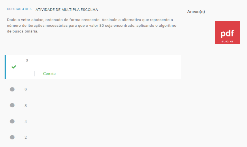 Dado o vetor abaixo, ordenado de forma crescente. Assinale a alternativa que represente o numero de iteracoes necessarias para que o valor 80 seja encontrado, aplicando o algoritmo de busca. 9 8 4 2