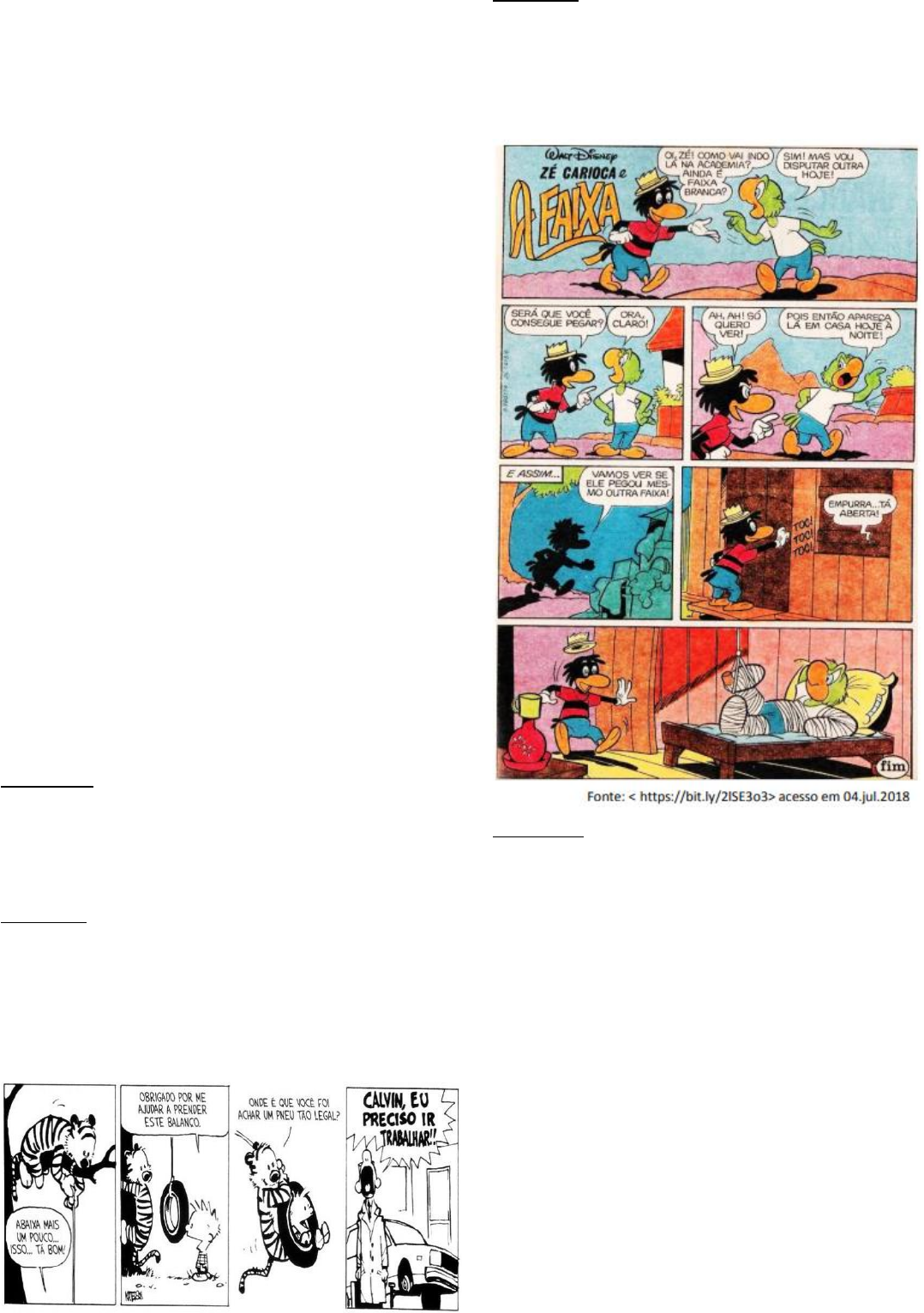ESCOLA: ______________________________________ NOME: _______________________________________ PROFª: ____________________ TURMA: 4º ANO _____ DATA: ____ / ____ / 2020 Avaliação de Português 3º Bimestre Leia o texto abaixo para responder às questões 01 e 02: O PESSOAL - Rubem Braga Chega o velho carteiro e me deixa uma carta. Quando se vai afastando eu o chamo: a carta não é para mim. Aqui não mora ninguém com este nome, explico-lhe. Ele guarda o envelope e coça a cabeça um instante, pensativo: — O senhor pode me dizer uma coisa? Por que é que agora há tanta carta com endereço errado? Antigamente isso acontecia uma vez ou outra. Agora, não sei o que houve... E abana a cabeça, em um gesto de censura para a humanidade que não se encontra mais, que envia mensagens inúteis para endereços errados. Sugiro-lhe que a cidade cresce muito depressa, que há edifícios onde havia casinhas, as pessoas se mudam mais que antigamente. Ele passa o lenço pela testa suada: — É, isso é verdade... Mas reparando bem o senhor vê que o pessoal anda muito desorientado. O pessoal anda muito desorientado... E se foi com seu maço de cartas, abanando a cabeça. Fiquei na janela, olhando a rua à toa numa tristeza indefinível. Um amigo me telefona, pergunta como vão as coisas. E não consigo resistir: — Vão bem, mas o pessoal anda muito desorientado. (O que, aliás, é verdade.) Fonte: Rubem Braga - Ai de ti, Copacabana, 28º edição, Editora Record, Rio de Janeiro, 2010 Questão 01: Ao lermos o texto, podemos afirmar que ele se trata de uma (A) resenha. (B) parlenda. (C) notícia. (D) crônica. Questão 02: A partir da leitura do texto, podemos afirmar que o personagem principal está (A) no seu sítio. (B) na sua casa. (C) no trabalho. (D) na fazenda. Leia a tirinha abaixo e responda à questão 03: Questão 03: Para fazer o balanço com Haroldo, o Calvin pegou sem permissão, de seu pai (A) um pneu do carro. (B) uma corda sem utilização. (C) a árvore do quintal. (D) o Haroldo, seu amigo. Leia os quadrinhos abaixo e responda à questão 04: Questão 04: O título da história se relaciona com último quadrinho, pelo fato do Zé Carioca (A) receber uma faixa branca. (B) ficar bravo com o Nestor. (C) estar de pernas para o ar. (D) ter se quebrado todo. Leia o texto abaixo para responder as questões 05, 06 e 07: CRIANÇAS COM PERNAS DE PAU SE DIVERTEM NO ARRASTÃO DO PAVULAGEM 29 de junho de 2018, por Mariana Labbate e Martina Medina Uma das principais comemorações juninas no Norte do país é o Arraial do Pavulagem em Belém, no Pará. A principal parte da festa é o “Arrastão do Pavulagem”, um desfile que passa pelas ruas da cidade. Nele, crianças e adultos dançam, cantam e alguns participantes saem usando pernas de pau; são os chamados “pernaltas”. Todos seguem o Boi Pavulagem até chegarem ao centro da cidade, onde acontece uma cerimônia de encerramento e um show da banda tradicional que também se chama “Arraial do Pavulagem”. O principal personagem é o boi-bumbá, típico do folclore da região, que no caso é chamado de Boi Pavulagem. Os irmãos Kenzo Thiego A., 11 anos, e Kayra Kawany A., 8 anos, são duas das seis crianças que saem como pernaltas no Arrastão. Eles dançam quadrilha e carimbó, um ritmo típico do Pará, e cumprimentam o público – tudo isso em cima de pernas de pau. “Eu sinto muita alegria conforme aumentam os centímetros da perna. Vou ficando cada vez mais alto e superando o medo de cair”, conta Kenzo. Este foi o seu quarto ano na festa. Kenzo começou usando pernas de 50 centímetros de altura e hoje já sai com as de 70 centímetros para celebrar a festa junina. “Tentei a de um metro, mas me deu dor no quadril. Mas um dia ainda vou conseguir usar!”, promete. O Arrastão da Pavulagem, leva milhares de pessoas cantando e dançando pelas ruas de Belém. Algumas pessoas se vestem de boi- bumbá, mas a maioria usa uma camisa azul, calça branca (no caso do Kenzo e da Kayra, que cubra as pernas de pau) e um chapéu de fitas com um dos principais símbolos do Pavulagem, uma estrela azul dentro de um círculo amarelo. A festa também tem várias brincadeiras, como o pau de sebo e o quebrapote, um jogo onde as crianças são vendadas e tentam quebrar potes que podem ter doces, terra, água e por aí vai. “Quebrei um pote e tinha pipoca. Eu fiquei com vontade, mas como estava vendado infelizmente não deu para comer. As crianças que estavam de fora correram para pegar e comeram antes”, relata Kenzo. Fonte: < https://bit.ly/2KR8pVQ >, acesso em 05.jul.2018, adaptado. Questão 05: O “Arraial da Pavulagem” trata-se de (A) uma cidade. (B) uma festa junina. (C) um desfile cívico. (D) um arrastão. Questão 06: Em relação à perna de pau que utiliza no arrastão, o menino Kenzo declara-se (A) medroso, pois pode cair e se machucar. (B) dolorido, devido à pressão no quadril. (C) alegre, quando aumenta seu tamanho. (D) feliz, por cumprimentar o público na festa. Questão 07: Ao ler o texto podemos afirmar que o “Arrastão da Pavulagem” acontece em (A) fevereiro, em comemoração ao carnaval. (B) abril, na celebração da semana santa. (C) agosto, por ser o mês do folclore. (D) junho, devido as festas juninas. Leia o texto abaixo para responder à questão 08: Questão 08: A propaganda está direcionada ao público (A) infantil. (B) juvenil. (C) adulto. (D) idoso. Leia o texto abaixo e responda a questão 09: Questão 09: A palavra em destaque no texto deve ser escrita corretamente da seguinte forma (A) pança. (B) pamça. (C) pansça. (D) panssa. Observe o cartaz abaixo e responda à questão 10: Questão 10: O cartaz acima nos chama a atenção para (A) o contrabando de animais. (B) os animais que vivem nas matas. (C) a arara que está atrás da grade. (D) o desejo das pessoas por um enfeite vivo.