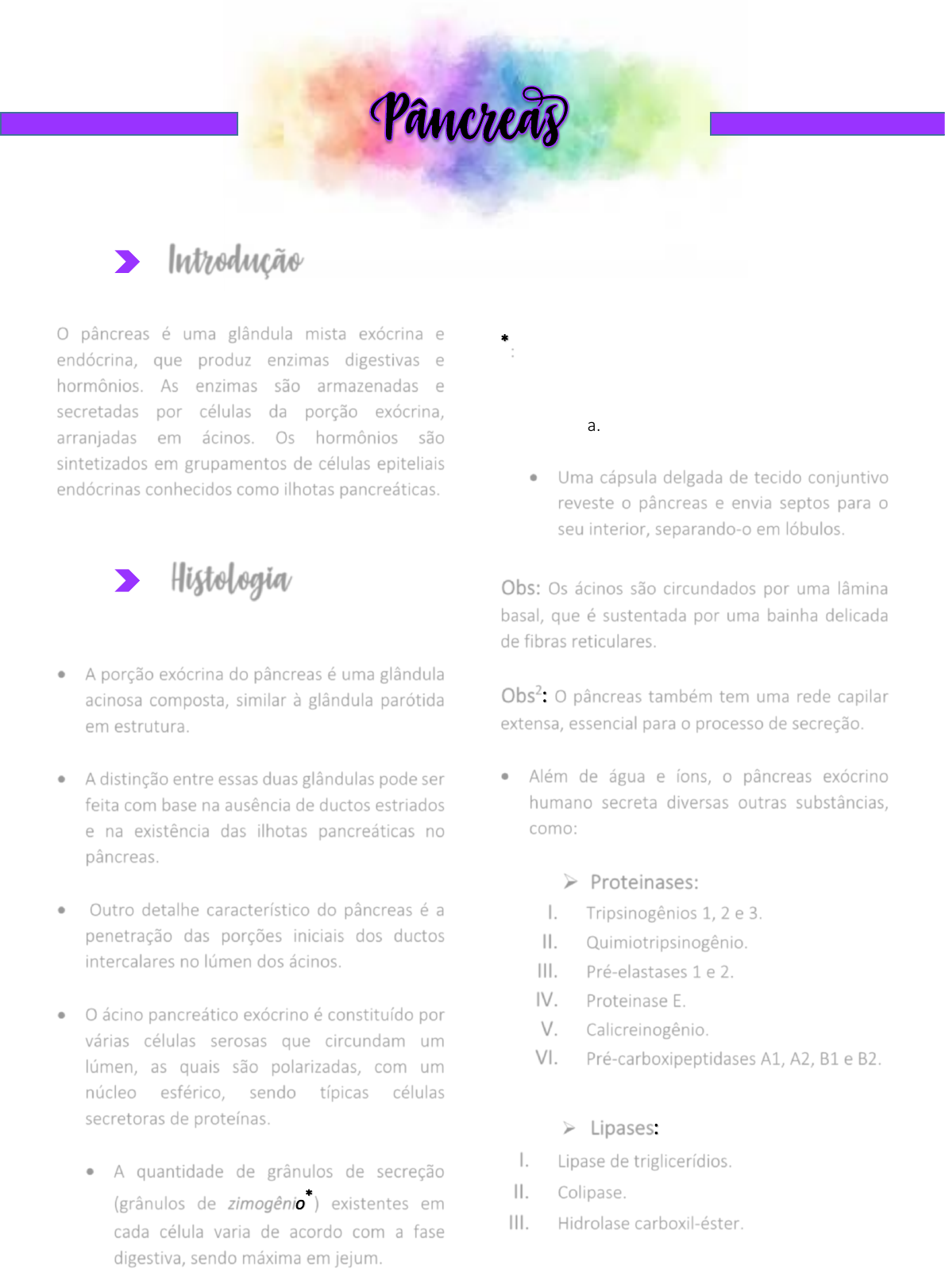 Introdução O pâncreas é uma glândula mista exócrina e endócrina, que produz enzimas digestivas e hormônios. As enzimas são armazenadas e secretadas por células da porção exócrina, arranjadas em ácinos. Os hormônios são sintetizados em grupamentos de células epiteliais endócrinas conhecidos como ilhotas pancreáticas. Histologia  A porção exócrina do pâncreas é uma glândula acinosa composta, similar à glândula parótida em estrutura.  A distinção entre essas duas glândulas pode ser feita com base na ausência de ductos estriados e na existência das ilhotas pancreáticas no pâncreas.  Outro detalhe característico do pâncreas é a penetração das porções iniciais dos ductos intercalares no lúmen dos ácinos.  O ácino pancreático exócrino é constituído por várias células serosas que circundam um lúmen, as quais são polarizadas, com um núcleo esférico, sendo típicas células secretoras de proteínas.  A quantidade de grânulos de secreção (grânulos de zimogênio*) existentes em cada célula varia de acordo com a fase digestiva, sendo máxima em jejum. *: Um zimogeno ou pró-enzima é um precursor enzimático inativo. Um zimogeno requer uma alteração bioquímica para que se torne numa enzima ativa.  Uma cápsula delgada de tecido conjuntivo reveste o pâncreas e envia septos para o seu interior, separando-o em lóbulos. Obs: Os ácinos são circundados por uma lâmina basal, que é sustentada por uma bainha delicada de fibras reticulares. Obs2: O pâncreas também tem uma rede capilar extensa, essencial para o processo de secreção.  Além de água e íons, o pâncreas exócrino humano secreta diversas outras substâncias, como:  Proteinases: I. Tripsinogênios 1, 2 e 3. II. Quimiotripsinogênio. III. Pré-elastases 1 e 2. IV. Proteinase E. V. Calicreinogênio. VI. Pré-carboxipeptidases A1, A2, B1 e B2.  Lipases: I. Lipase de triglicerídios. II. Colipase. III. Hidrolase carboxil-éster.  Nucleases: I. Ribonuclease. II. Desoxirribonuclease.  A maioria das enzimas é armazenada na forma inativa (pré-enzimas) nos grânulos de secreção das células acinosas, sendo ativada no lúmen do intestino delgado após a secreção. Obs: Esse fato é muito importante para a proteção do pâncreas contra a atividade dessas enzimas.  A secreção pancreática exócrina é controlada principalmente por meio de dois hormônios – secretina e colecistoquinina – que são produzidos por células enteroendócrinas da mucosa intestinal (duodeno e jejuno).  O estímulo do nervo vago (parassimpático) também aumenta a secreção pancreática.  Na verdade, hormônios e sistema nervoso agem conjuntamente no controle da secreção pancreática.  A existência de ácido (pH < 4,5) no lúmen intestinal é um forte estímulo para a secreção de secretina, hormônio que promove uma secreção fluida abundante, pobre em atividade enzimática e rica em bicarbonato.  Essa secreção alcalina é produzida pelas células dos ductos intercalares e serve para neutralizar a acidez do quimo (alimento parcialmente digerido), para que as enzimas pancreáticas possam funcionar em sua faixa ótima de pH (neutro).  A liberação de colecistoquinina é estimulada por ácidos graxos de cadeia longa, ácido gástrico e alguns aminoácidos essenciais no lúmen intestinal.  A colecistoquinina promove uma secreção pouco abundante e rica em enzimas, atuando principalmente na extrusão dos grânulos de zimogênio. Obs: A ação integrada da secretina e da colecistoquinina provê a secreção abundante de suco pancreático alcalino, rico em enzimas. Ilustração da estrutura de um ácino pancreático. Células acinosas (escuras) são piramidais, com grânulos no polo apical e retículo endoplasmático granuloso na base. Fisiologia  A maior parte das enzimas pancreáticas são secretadas como zimogênios, que devem ser ativados no momento de chegada no intestino.  As mais importantes das enzimas pancreáticas na digestão de proteínas são a tripsina, a quimiotripsina e a carboxipolipeptidase. Obs: A mais abundante é a tripsina.  A tripsina e a quimiotripsina hidrolisam proteínas a peptídeos de tamanhos variados, sem levar à liberação de aminoácidos individuais. Entretanto, a carboxipolipeptidase cliva alguns peptídeos, até aminoácidos individuais, completando assim a digestão de algumas proteínas até aminoácidos.  A enzima pancreática para a digestão de carboidratos é a amilase pancreática, que hidrolisa amidos, glicogênio e outros carboidratos (exceto celulose), para formar principalmente dissacarídeos e alguns trissacarídeos.  Este processo de ativação é uma cascata que inicia quando a enteropeptidase da borda em escova (previamente chamada de enterocinase) converte o tripsinogênio inativo em tripsina.  A tripsina, então, converte os outros zimogênios pancreáticos em suas formas ativas.  Os sinais para a liberação das enzimas pancreáticas incluem distensão do intestino delgado, presença de alimento no intestino, sinais neurais e hormônio CCK.  As enzimas pancreáticas entram no intestino em um fluido aquoso que também contém bicarbonato.  A secreção de bicarbonato para o duodeno neutraliza o ácido proveniente do estômago. Obs: Uma pequena quantidade de bicarbonato é secretada por células duodenais, mas a maior parte vem do pâncreas.  A produção de bicarbonato requer altos níveis da enzima anidrase carbônica, níveis similares àqueles encontrados nas células tubulares renais e nos eritrócitos  O pâncreas e as criptas intestinais, a secreção de sódio e a água é um processo passivo, dirigido por gradientes eletroquímicos e osmóticos.  As etapas básicas do mecanismo celular da secreção da solução de íons bicarbonato nos ductos pancreáticos, são as seguintes: I. O dióxido de carbono se difunde para as células a partir do sangue e, sob a influência da anidrase carbônica, combina-se com a água para formar ácido car